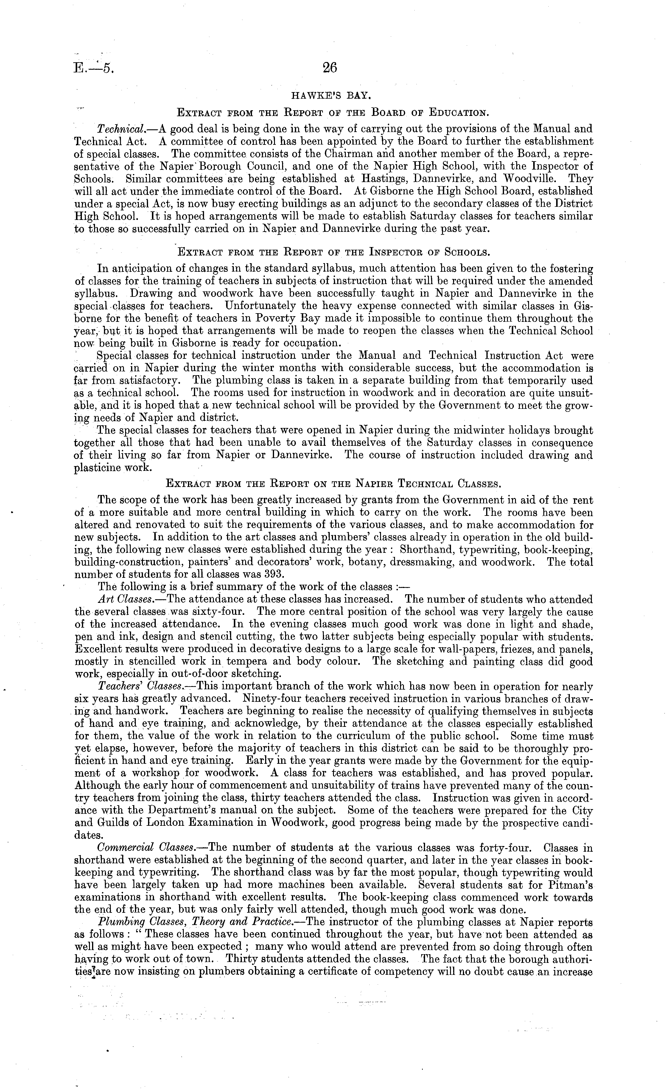 HAWKE'S BAY. Extract from the Report of the Board op Education. Technical. —A good deal is being done in the way of carrying out the provisions of the Manual and Technical Act. A committee of control has been appointed by the Board to further the establishment of special classes. The committee consists of the Chairman and another member of the Board, a representative of the Napier' Borough Council, and one of the Napier High School, with the Inspector of Schools. Similar committees are being established at Hastings, Dannevirke, and Woodville. They will all act under the immediate control of the Board. At Gisborne the High School Board, established under a special Act, is now busy erecting buildings as an adjunct to the secondary classes of the District High School. It is hoped arrangements will be made to establish Saturday classes for teachers similar to those so successfully carried on in Napier and Dannevirke during the past year. Extract prom the Report op the Inspector op Schools. In anticipation of changes in the standard syllabus, much attention has been given to the fostering of classes for the training of teachers in subjects of instruction that will be required under the amended syllabus. Drawing and woodwork have been successfully taught in Napier and Dannevirke in the special classes for teachers. Unfortunately the heavy expense connected with similar classes in Gisborne for the benefit of teachers in Poverty Bay made it impossible to continue them throughout the year, but it is hoped that arrangements will be made to reopen the classes when the Technical School now being built in Gisborne is ready for occupation. Special classes for technical instruction under the Manual and Technical Instruction Act were carried on in Napier during the winter months with considerable success, but the accommodation is far from satisfactory. The plumbing class is taken in a separate building from that temporarily used as a technical school. The rooms used for instruction in woodwork and in decoration are quite unsuitable, and it is hoped that a new technical school will be provided by the Government to meet the growing needs of Napier and district. The special classes for teachers that were opened in Napier during the midwinter holidays brought together all those that had been unable to avail themselves of the Saturday classes in consequence of their living so far from Napier or Dannevirke. The course of instruction included drawing and plasticine work. Extract prom the Report on the Napier Technical Classes. The scope of the work has been greatly increased by grants from the Government in aid of the rent of a more suitable and more central building in which to carry on the work. The rooms have been altered and renovated to suit the requirements of the various classes, and to make accommodation for new subjects. In addition to the art classes and plumbers' classes already in operation in the old building, the following new classes were established during the year : Shorthand, typewriting, book-keeping, building-construction, painters' and decorators' work, botany, dressmaking, and woodwork. The total number of students for all classes was 393. The following is a brief summary of the work of the classes : — Art Classes. —The attendance at these classes has increased. The number of students who attended the several classes was sixty-four. The more central position of the school was very largely the cause of the increased attendance. In the evening classes much good work was done in light and shade, pen and ink, design and stencil cutting, the two latter subjects being especially popular with students. Excellent results were produced in decorative designs to a large scale for wall-papers, friezes, and panels, mostly in stencilled work in tempera and body colour. The sketching and painting class did good work, especially in out-of-door sketching. Teachers , Classes.—This important branch of the work which has now been in operation for nearly six years has greatly advanced. Ninety-four teachers received instruction in various branches of drawing and handwork. Teachers are beginning to realise the necessity of qualifying themselves in subjects of hand and eye training, and acknowledge, by their attendance at the classes especially established for them, the value of the work in relation to the curriculum of the public school. Some time must yet elapse, however, before the majority of teachers in this district can be said to be thoroughly proficient in hand and eye training. Early in the year grants were made by the Government for the equipment of a workshop for woodwork. A class for teachers was established, and has proved popular. Although the early hour of commencement and unsuitability of trains have prevented many of the country teachers from joining the class, thirty teachers attended the class. Instruction was given in accordance with the Department's manual on the subject. Some of the teachers were prepared for the City and Guilds of London Examination in Woodwork, good progress being made by the prospective candidates. Commercial Classes. —The number of students at the various classes was forty-four. Classes in shorthand were established at the beginning of the second quarter, and later in the year classes in bookkeeping and typewriting. The shorthand class was by far the most popular, though typewriting would have been largely taken up had more machines been available. Several students sat for Pitman's examinations in shorthand with excellent results. The book-keeping class commenced work towards the end of the year, but was only fairly well attended, though much good work was done. Plumbing Classes, Theory and Practice. —The instructor of the plumbing classes at Napier reports as follows : " These classes have been continued throughout the year, but have not been attended as well as might have been expected ; many who would attend are prevented from so doing through often halvi