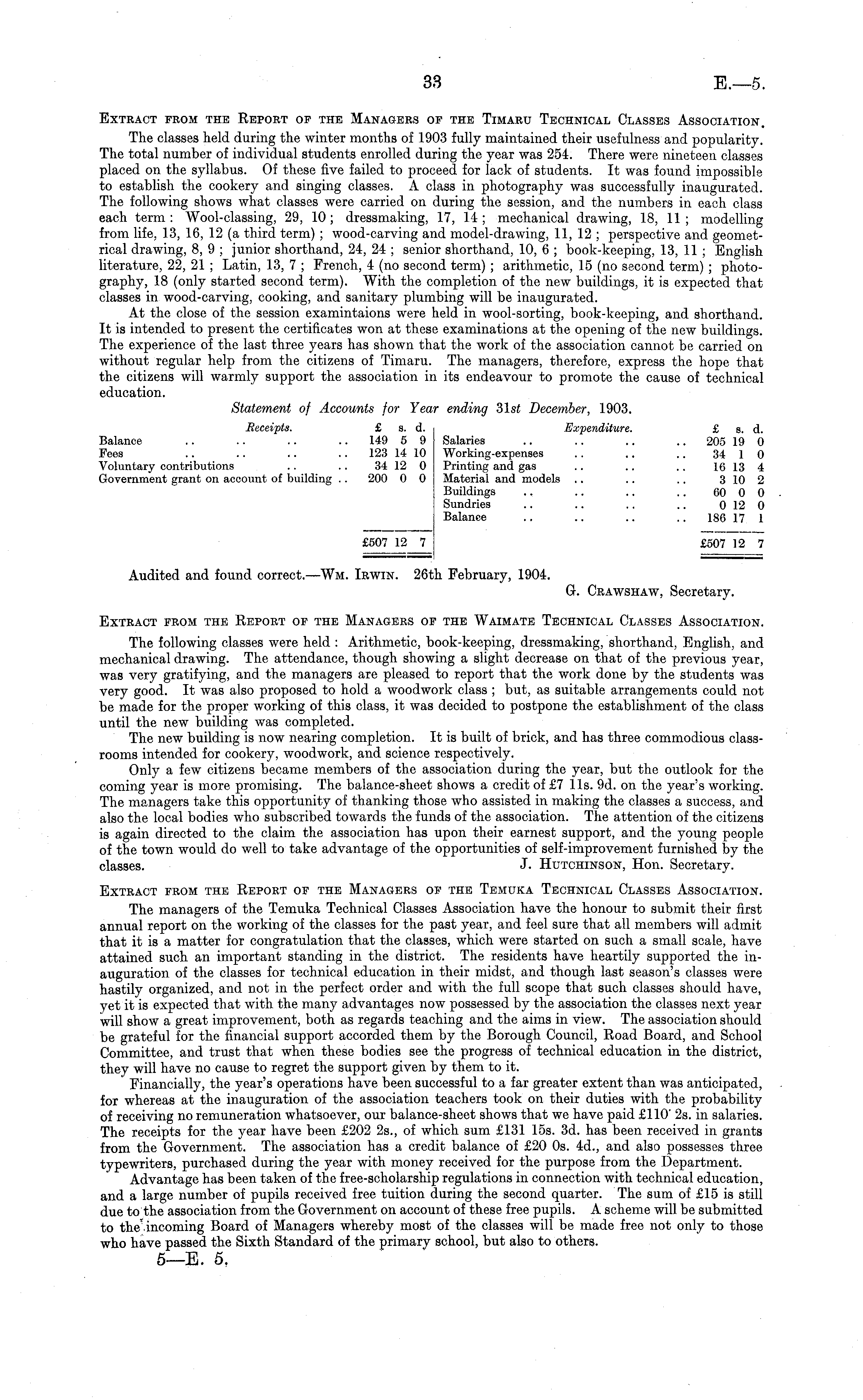 Audited and found correct. —Wμ. Irwin. 26th February, 1904. G-. Crawshaw, Secretary. Extract from the Report op the Managers op the Waimate Technical Classes Association. The following classes were held : Arithmetic, book-keeping, dressmaking, shorthand, English, and mechanical drawing. The attendance, though showing a slight decrease on that of the previous year, was very gratifying, and the managers are pleased to report that the work done by the students was very good. It was also proposed to hold a woodwork class ; but, as suitable arrangements could not be made for the proper working of this class, it was decided to postpone the establishment of the class until the new building was completed. The new building is now nearing completion. It is built of brick, and has three commodious classrooms intended for cookery, woodwork, and science respectively. Only a few citizens became members of the association during the year, but the outlook for the coming year is more promising. The balance-sheet shows a credit of £7 11s. 9d. on the year's working. The managers take this opportunity of thanking those who assisted in making the classes a success, and also the local bodies who subscribed towards the funds of the association. The attention of the citizens is again directed to the claim the association has upon their earnest support, and the young people of the town would do well to take advantage of the opportunities of self-improvement furnished by the classes. J- Hutchinson, Hon. Secretary. Extract from the Report of the Managers of the Temuka Technical Classes Association. The managers of the Temuka Technical Classes Association have the honour to submit their first annual report on the working of the classes for the past year, and feel sure that all members will admit that it is a matter for congratulation that the classes, which were started on such a small scale, have attained such an important standing in the district. The residents have heartily supported the inauguration of the classes for technical education in their midst, and though last season's classes were hastily organized, and not in the perfect order and with the full scope that such classes should have, yet it is expected that with the many advantages now possessed by the association the classes next year will show a great improvement, both as regards teaching and the aims in view. The association should be grateful for the financial support accorded them by the Borough Council, Road Board, and School Committee, and trust that when these bodies see the progress of technical education in the district, they will have no cause to regret the support given by them to it. Financially, the year's operations have been successful to a far greater extent than was anticipated, for whereas at the inauguration of the association teachers took on their duties with the probability of receiving no remuneration whatsoever, our balance-sheet shows that we have paid £110 2s. in salaries. The receipts for the year have been £202 25., of which sum £131 15s. 3d. has been received in grants from the Government. The association has a credit balance of £20 os. 4d., and also possesses three typewriters, purchased during the year with money received for the purpose from the Department. Advantage has been taken of the free-scholarship regulations in connection with technical education, and a large number of pupils received free tuition during the second quarter. The sum of £15 is still due to the association from the Government on account of these free pupils. A scheme will be submitted to the'incoming Board of Managers whereby most of the classes will be made free not only to those who have passed the Sixth Standard of the primary school, but also to others. 5—E. 5,