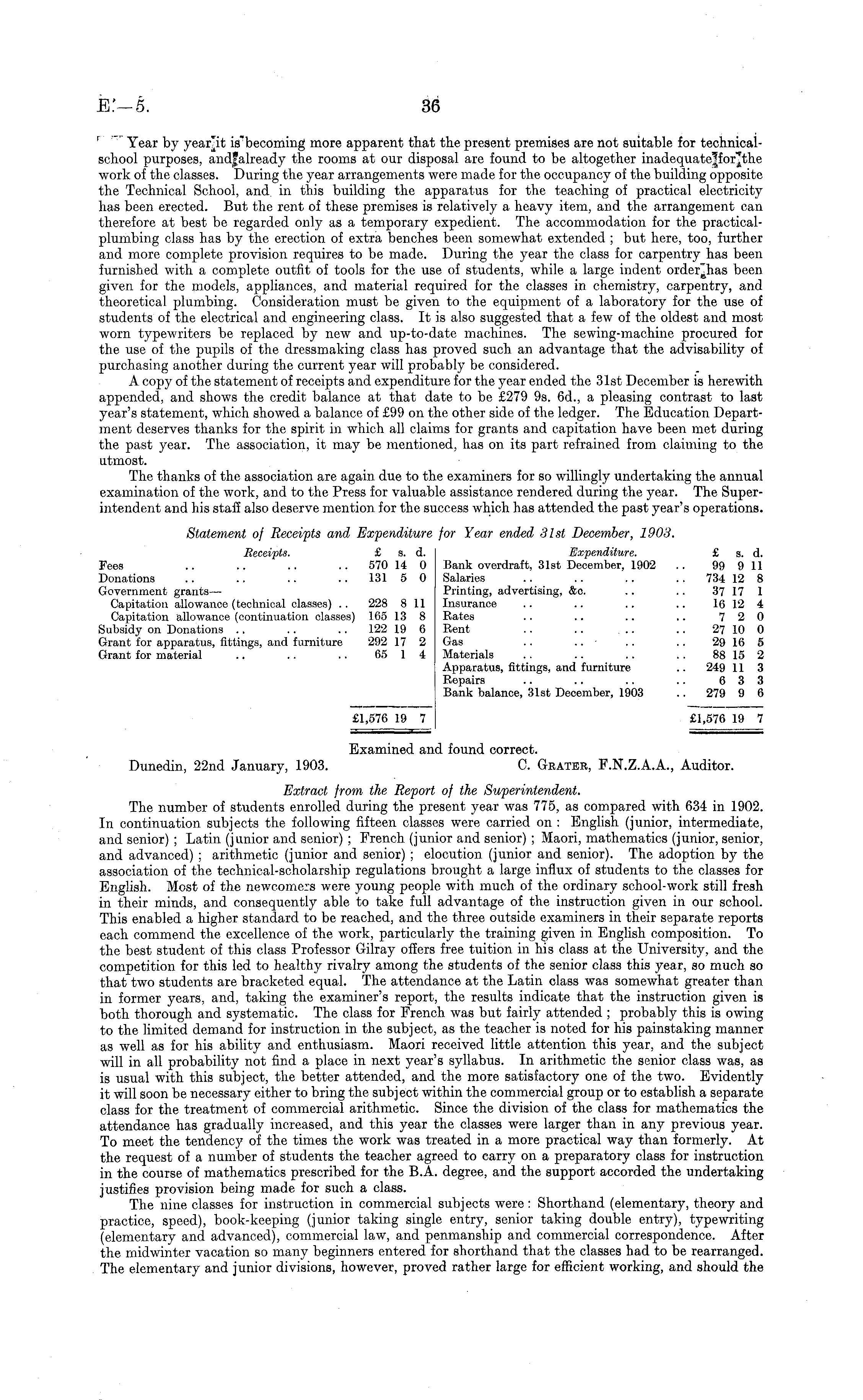■' Year by yeayt is'becoming more apparent that the present premises are not suitable for technicalschool purposes, andfalready the rooms at our disposal are found to be altogether work of the classes. During the year arrangements were made for the occupancy of the building opposite the Technical School, and. in this building the apparatus for the teaching of practical electricity has been erected. But the rent of these premises is relatively a heavy item, and the arrangement can therefore at best be regarded only as a temporary expedient. The accommodation for the practicalplumbing class has by the erection of extra benches been somewhat extended ; but here, too, further and more complete provision requires to be made. During the year the class for carpentry has been furnished with a complete outfit of tools for the use of students, while a large indent been given for the models, appliances, and material required for the classes in chemistry, carpentry, and theoretical plumbing. Consideration must be given to the equipment of a laboratory for the use of students of the electrical and engineering class. It is also suggested that a few of the oldest and most worn typewriters be replaced by new and up-to-date machines. The sewing-machine procured for the use of the pupils of the dressmaking class has proved such an advantage that the advisability of purchasing another during the current year will probably be considered. A copy of the statement of receipts and expenditure for the year ended the 31st December is herewith appended, and shows the credit balance at that date to be £279 9s. 6d., a pleasing contrast to last year's statement, which showed a balance of £99 on the other side of the ledger. The Education Department deserves thanks for the spirit in which all claims for grants and capitation have been met during the past year. The association, it may be mentioned, has on its part refrained from claiming to the utmost. The thanks of the association are again due to the examiners for so willingly undertaking the annual examination of the work, and to the Press for valuable assistance rendered during the year. The Superintendent and his staff also deserve mention for the success which has attended the past year's operations. Statement of Receipts and Expenditure for Year ended 3lst December, 1903. Receipts. £ s. d. Expenditure. £ s. d. Fees .. .. .. .. 570 14 0 Bank overdraft, 31st December, 1902 .. 99 911 Donations .. .. .. 131 5 0 Salaries .. .. .. .. 734 12 8 Government grants — Printing, advertising, &o. .. .. 37 17 1 Capitation allowance (technical classes) .. 228 811 Insurance .. .. .. .. 16 12 4 Capitation allowance (continuation classes) 165 13 8 Rates .. .. .. .. 7 2 0 Subsidy on Donations .. .. .. 122 19 6 Rent .. .. ... .. 27 10 0 Grant for apparatus, fittings, and furniture 292 17 2 Gas .. .. • .. .. 29 16 5 Grant for material .. .. .. 65 1 4 Materials .. .. .. .. 88 15 2 Apparatus, fittings, and furniture .. 249 11 3 Repairs .. .. .. .. 6 3 3 Bank balance, 31st December, 1903 .. 279 9 6 £1,576 19 7 £1,576 19 7 Examined and found correct. Dunedin, 22nd January, 1903. C. Gratee, F.N.Z.A.A., Auditor. Extract from the Report of the Superintendent. The number of students enrolled during the present year was 775, as compared with 634 in 1902. In continuation subjects the following fifteen classes were carried on : English (junior, intermediate, and senior) ; Latin (junior and senior) ; French (junior and senior) ; Maori, mathematics (junior, senior, and advanced) ; arithmetic (junior and senior) ; elocution (junior and senior). The adoption by the association of the technical-scholarship regulations brought a large influx of students to the classes for English. Most of the newcomers were young people with much of the ordinary school-work still fresh in their minds, and consequently able to take full advantage of the instruction given in our school. This enabled a higher standard to be reached, and the three outside examiners in their separate reports each commend the excellence of the work, particularly the training given in English composition. To the best student of this class Professor Gilray offers free tuition in his class at the University, and the competition for this led to healthy rivalry among the students of the senior class this year, so much so that two students are bracketed equal. The attendance at the Latin class was somewhat greater than in former years, and, taking the examiner's report, the results indicate that the instruction given is both thorough and systematic. The class for French was but fairly attended ; probably this is owing to the limited demand for instruction in the subject, as the teacher is noted for his painstaking manner as well as for his ability and enthusiasm. Maori received little attention this year, and the subject will in all probability not find a place in next year's syllabus. In arithmetic the senior class was, as is usual with this subject, the better attended, and the more satisfactory one of the two. Evidently it will soon be necessary either to bring the subject within the commercial group or to establish a separate class for the treatment of commercial arithmetic. Since the division of the class for mathematics the attendance has gradually increased, and this year the classes were larger than in any previous year. To meet the tendency of the times the work was treated in a more practical way than formerly. At the request of a number of students the teacher agreed to carry on a preparatory class for instruction in the course of mathematics prescribed for the B.A. degree, and the support accorded the undertaking justifies provision being made for such a class. The nine classes for instruction in commercial subjects were: Shorthand (elementary, theory and practice, speed), book-keeping (junior taking single entry, senior taking double entry), typewriting (elementary and advanced), commercial law, and penmanship and commer