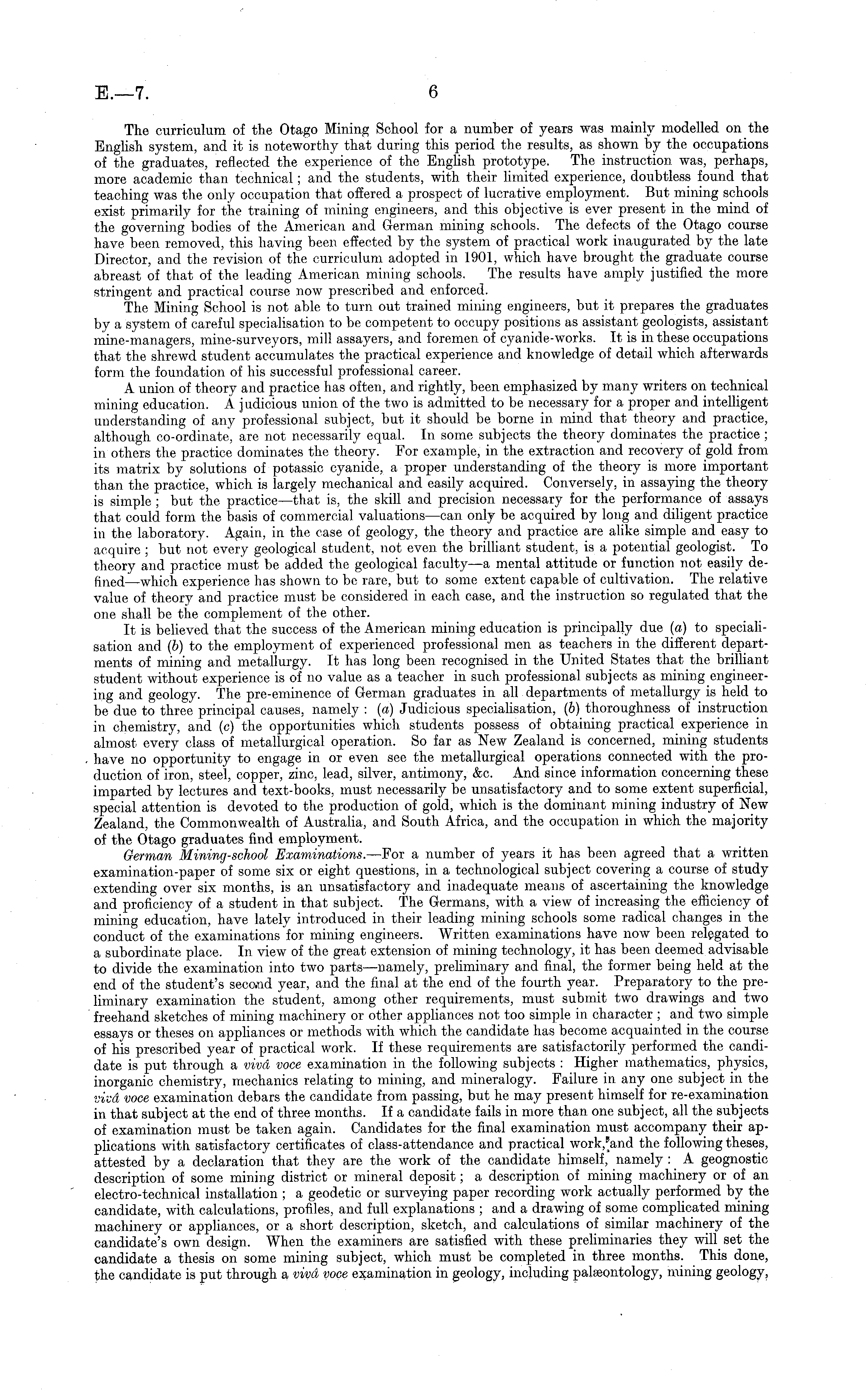 The curriculum, of the Otago Mining School for a number of years was mainly modelled on the English system, and it is noteworthy that during this period the results, as shown by the occupations of the graduates, reflected the experience of the English prototype. The instruction was, perhaps, more academic than technical; and the students, with their limited experience, doubtless found that teaching was the only occupation that offered a prospect of lucrative employment. But mining schools exist primarily for the training of mining engineers, and this objective is ever present in the mind of the governing bodies of the American and German mining schools. The defects of the Otago course have been removed, this having been effected by the system of practical work inaugurated by the late Director, and the revision of the curriculum adopted in 1901, which have brought the graduate course abreast of that of the leading American mining schools. The results have amply justified the more stringent and practical course now prescribed and enforced. The Mining School is not able to turn out trained mining engineers, but it prepares the graduates by a system of careful specialisation to be competent to occupy positions as assistant geologists, assistant mine-managers, mine-surveyors, mill assayers, and foremen of cyanide-works. It is in these occupations that the shrewd student accumulates the practical experience and knowledge of detail which afterwards form the foundation of his successful professional career. A union of theory and practice has often, and rightly, been emphasized by many writers on technical mining education. A judicious union of the two is admitted to be necessary for a proper and intelligent understanding of any professional subject, but it should be borne in mind that theory and practice, although co-ordinate, are not necessarily equal. In some subjects the theory dominates the practice ; in others the practice dominates the theory. For example, in the extraction and recovery of gold from its matrix by solutions of potassic cyanide, a proper understanding of the theory is more important than the practice, which is largely mechanical and easily acquired. Conversely, in assaying the theory is simple ; but the practice —that is, the skill and precision necessary for the performance of assays that could form the basis of commercial valuations —can only be acquired by long and diligent practice in the laboratory. Again, in the case of geology, the theory and practice are alike simple and easy to acquire ; but not every geological student, not even the brilliant student, is a potential geologist. To theory and practice must be added the geological faculty —a mental attitude or function not easily defined—which experience has shown to be rare, but to some extent capable of cultivation. The relative value of theory and practice must be considered in each case, and the instruction so regulated that the one shall be the complement of the other. It is believed that the success of the American mining education is principally due (a) to specialisation and (b) to the employment of experienced professional men as teachers in the different departments of mining and metallurgy. It has long been recognised in the United States that the brilliant student without experience is of no value as a teacher in such professional subjects as mining engineering and geology. The pre-eminence of German graduates in all departments of metallurgy is held to be due to three principal causes, namely : (a) Judicious specialisation, (b) thoroughness of instruction in chemistry, and (c) the opportunities which students possess of obtaining practical experience in almost every class of metallurgical operation. So far as New Zealand is concerned, mining students have no opportunity to engage in or even see the metallurgical operations connected with the production of iron, steel, copper, zinc, lead, silver, antimony, &c. And since information concerning these imparted by lectures and text-books, must necessarily be unsatisfactory and to some extent superficial, special attention is devoted to the production of gold, which is the dominant mining industry of New Zealand, the Commonwealth of Australia, and South Africa, and the occupation in which the majority of the Otago graduates find employment. German Mining-school Examinations. —For a number of years it has been agreed that a written examination-paper of some six or eight questions, in a technological subject covering a course of study extending over six months, is an unsatisfactory and inadequate means of ascertaining the knowledge and proficiency of a student in that subject. The Germans, with a view of increasing the efficiency of mining education, have lately introduced in their leading mining schools some radical changes in the conduct of the examinations for mining engineers. Written examinations have now been relegated to a subordinate place. In view of the great extension of mining technology, it has been deemed advisable to divide the examination into two parts —namely, preliminary and final, the former being held at the end of the student's second year, and the final at the end of the fourth year. Preparatory to the preliminary examination the student, among other requirements, must submit two drawings and two freehand sketches of mining machinery or other appliances not too simple in character ; and two simple essays or theses on appliances or methods with which the candidate has become acquainted in the course of his prescribed year of practical work. If these requirements are satisfactorily performed the candidate is put through a viva voce examination in the following subjects : Higher mathematics, physics, inorganic chemistry, mechanics relating to mining, and mineralogy. Failure in any one subject in the viva voce examination debars the candidate from passing, but he may present himself for re-examination in that subject at the end of th