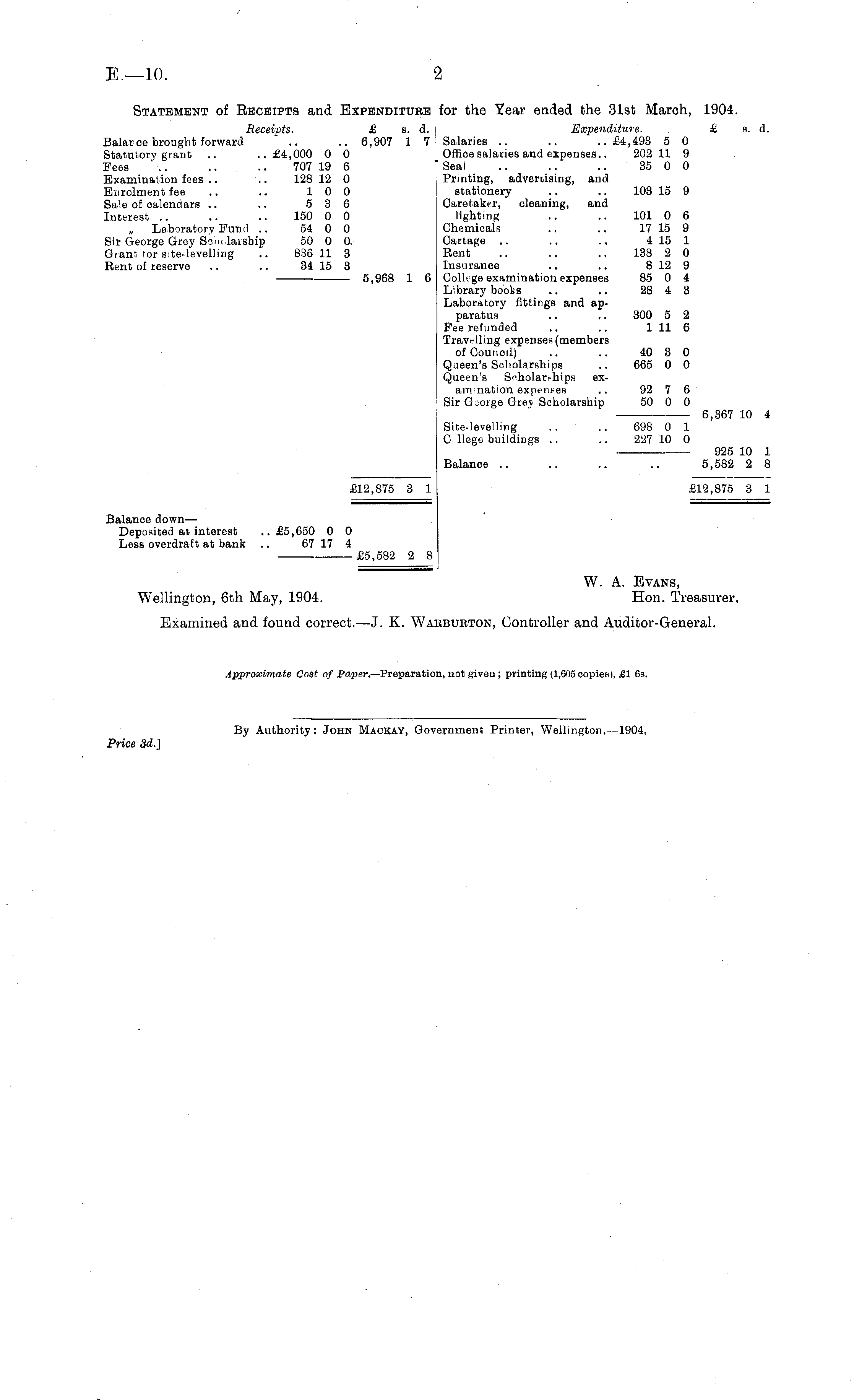 Statement of Receipts and Expenditure for the Year ended the 31st March, 1904. Receipts. £ s. d. Expenditure. £ s. d. Balarce brought forward .. .. 6,907 1 7 Salaries .. .. ..£4,493 5 0 Statutory grant .. .. £4,000 0 0 Office salaries and expenses.. 202 11 9 Pees .. .. 707 19 6 \ Seal .. .. .. 35 0 0 Examination fees .. .. 128 12 0 Printing, advertising, and Enrolment fee .. ... 10 0 stationery .. .. 103 15 9 Sa'e of calendars .. .. 5 3 6 Caretaker, cleaning, and Interest .. .. .. 150 0 0 lighting .. .. 101 0 6 „ Laboratory Fund .. 54 0 0 Chemicals .. .. 17 15 9 Sir George Grey Sonilaisbip 50 0 ft Cartage .. .. .. 4 15 1 Grant tor s te-levelling .. 836 11 3 Rent .. .. .. 138 2 0 Rent of reserve .. .. 34 15 3 Insurance .. .. 8 12 9 5,968 1 6 Collige examination expenses 85 0 4 Library books .. .. 28 4 3 Laboratory fittings and apparatus .. .. 300 5 2 Pee refunded .. .. 1 11 6 Travelling expenses (members of Council) .. .. 40 3 0 Queen's Scholarships .. 665 0 0 Queen's Scholar-hips exam nat'on expenses .. 92 7 6 Sir George Grey Scholarship 50 0 0 6,367 10 4 Site-levelling .. .. 698 0 1 C liege buildings .. .. 227 10 0 925 10 1 Balance .. .. .. .. 5,582 2 8 £12,875 3 1 £12,875 3 1 Balance down— Deposited at interest .. £5,650 0 0 Less overdraft at bank .. 67 17 4 £5,582 2 8 W. A. Evans, Wellington, 6th May, 1904. Hon. Treasurer. Examined and found correct. —J. K. Warburton, Controller and Auditor-General. Approximate Cost of Payer.—Preparation, not given ; printing (1,605 copies), £1 6s.