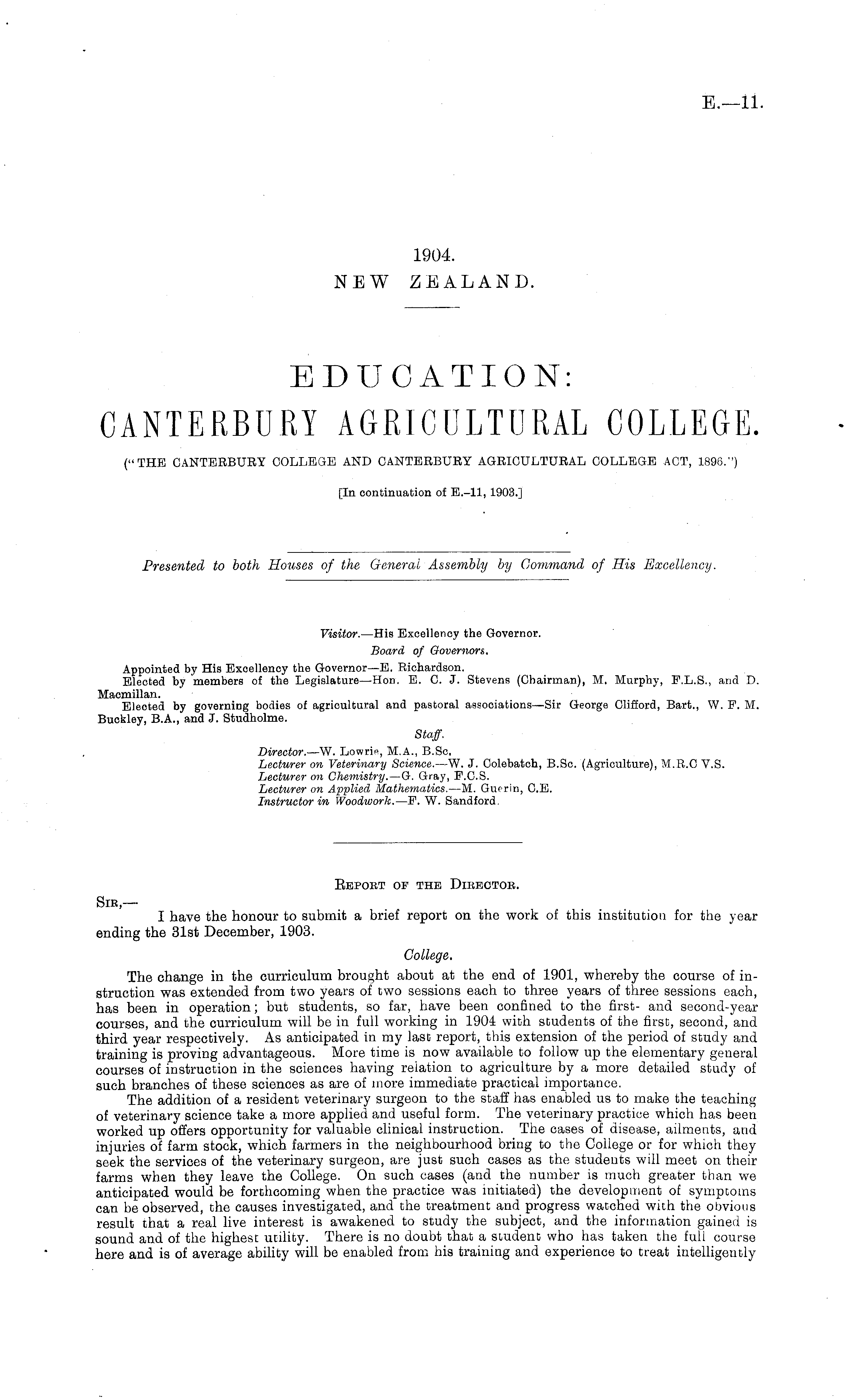 Presented to both Houses of the General Assembly by Command of His Excellency. Visitor. —His Excellency the Governor. Board of Governors, Appointed by His Exoellency the Governor —E. Richardson. Elected by members of the Legislature—Hon. E. C. J. Stevens (Chairman), M. Murphy, F.L.S., and D. Maomillan. Eleoted by governing bodies of agricultural and pastoral associations—Sir George CliSord, Bart., W. P. M. Buckley, 8.A., and J. Studholme. Staff, Director. —W. Lowrifi, M.A., B.Sc, Lecturer on Veterinary Science. —W. J. Oolebatch, B.Sc. (Agriculture), M.R.C V.S. Lecturer on Chemistry. —G. Gray, E.C.B. Lecturer on Applied Mathematics. —M. Guerin, C.E. Instructor in Woodwork. — ¥. W. Sandford.