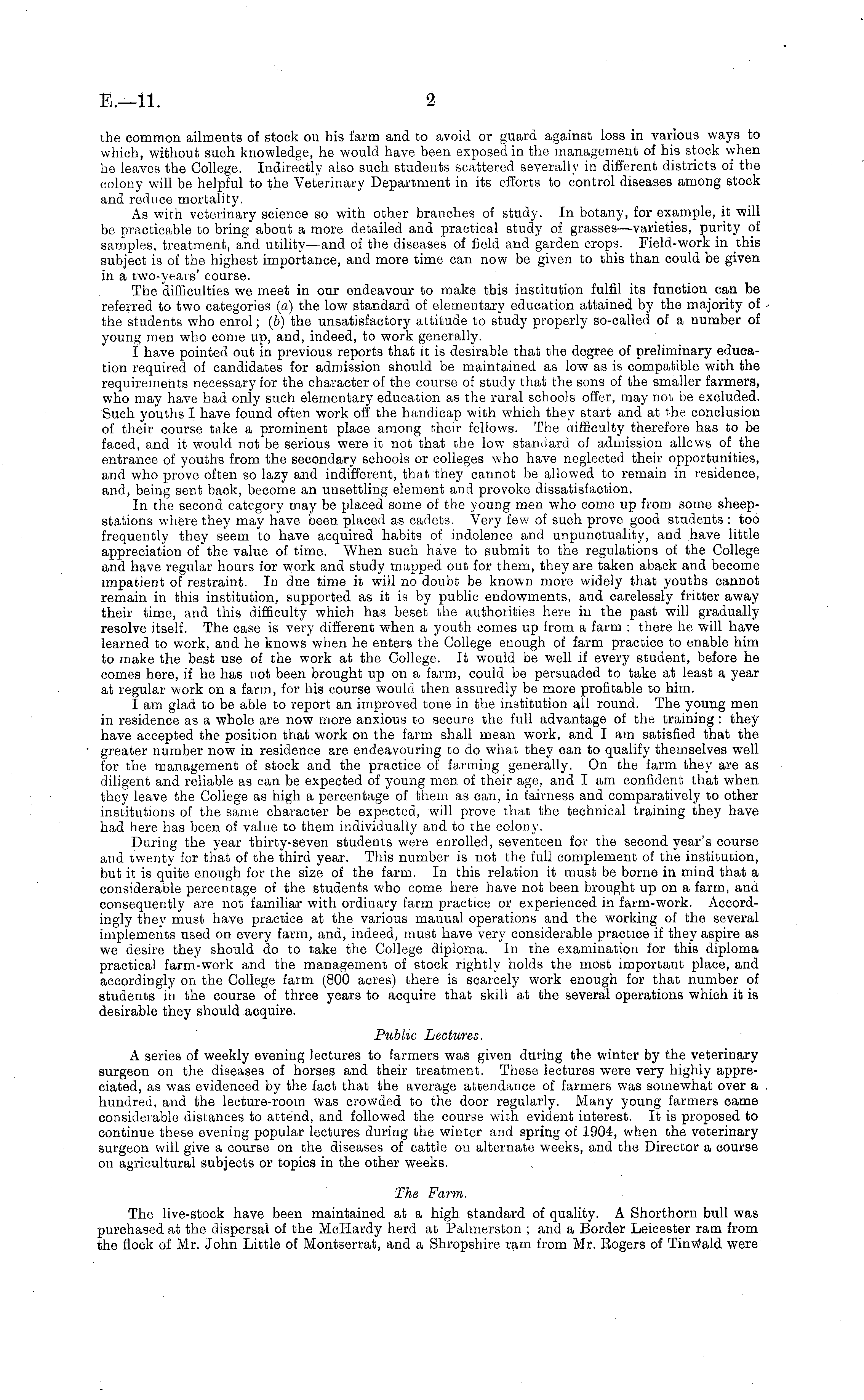 the common ailments of stock on his farm and to avoid or guard against loss in various ways to which, without such knowledge, he would have been exposed in the management of his stock when he leaves the College. Indirectly also such students scattered severally in different districts of the colony will be helpful to the Veterinary Department in its efforts to control diseases among stock and reduce mortality. As with veterinary science so with other branches of study. In botany, for example, it will be practicable to bring about a more detailed and practical study of grasses —varieties, purity of samples, treatment, and utility—and of the diseases of field and garden crops. Field-work in this subject is of the highest importance, and more time can now be given to this than could be given in a two-years' course. The difficulties we meet in our endeavour to make this institution fulfil its function can be referred to two categories (a) the low standard of elementary education attained by the majority of the students who enrol; (b) the unsatisfactory attitude to study properly so-called of a number of young men who come up, and, indeed, to work generally. I have pointed out in previous reports that it is desirable that the degree of preliminary education required of candidates for admission should be maintained as low as is compatible with the requirements necessary for the character of the course of study that the sons of the smaller farmers, who may have had only such elementary education as the rural schools offer, may not be excluded. Such youths I have found often work off the handicap with which they start and at the conclusion of their course take a prominent place among their fellows. The difficulty therefore has to be faced, and it would not be serious were it not that the low standard of admission allows of the entrance of youths from the secondary schools or colleges who have neglected their opportunities, and who prove often so lazy and indifferent, that they cannot be allowed to remain in residence, and, being sent back, become an unsettling element and provoke dissatisfaction. In the second category may be placed some of the young men who come up from some sheepstations where they may have been placed as cadets. Very few of such prove good students : too frequently they seem to have acquired habits of indolence and unpunctuality, and have little appreciation of the value of time. When such have to submit to the regulations of the College and have regular hours for work and study mapped out for them, they are taken aback and become impatient of restraint. In due time it will no doubt be known more widely that youths cannot remain in this institution, supported as it is by public endowments, and carelessly fritter away their time, and this difficulty which has beset the authorities here in the past will gradually resolve itself. The case is very different when a youth comes up from a farm : there he will have learned to work, and he knows when he enters the College enough of farm practice to enable him to make the best use of the work at the College. It would be well if every student, before he comes here, if he has not been brought up on a farm, could be persuaded to take at least a year at regular work on a farm, for his course would then assuredly be more profitable to him. lam glad to be able to report an improved tone in the institution all round. The young men in residence as a whole are now more anxious to secure the full advantage of the training : they have accepted the position that work on the farm shall mean work, and I am satisfied that the greater number now in residence are endeavouring to do what they can to qualify themselves well for the management of stock and the practice of farming generally. On the farm they are as diligent and reliable as can be expected of young men of their age, and I am confident that when they leave the College as high a percentage of them as can, in fairness and comparatively to other institutions of the same character be expected, will prove that the technical training they have had here has been of value to them individually and to the colony. During the year thirty-seven students were enrolled, seventeen for the second year's course and twenty for that of the third year. This number is not the full complement of the institution, but it is quite enough for the size of the farm. In this relation it must be borne in mind that a considerable percentage of the students who come here have not been brought up on a farm, and consequently are not familiar with ordinary farm practice or experienced in farm-work. Accordingly they must have practice at the various manual operations and the working of the several implements used on every farm, and, indeed, must have very considerable practice if they aspire as we desire they should do to take the College diploma. In the examination for this diploma practical farm-work and the management of stock rightly holds the most important place, and accordingly on the College farm (800 acres) there is scarcely work enough for that number of students in the course of three years to acquire that skill at the several operations which it is desirable they should acquire. Public Lectures. A series of weekly evening lectures to farmers was given during the winter by the veterinary surgeon on the diseases of horses and their treatment. These lectures were very highly appreciated, as was evidenced by the fact that the average attendance of farmers was somewhat over a hundred, and the lecture-room was crowded to the door regularly. Many young farmers came considerable distances to attend, and followed the course with evident interest. It is proposed to continue these evening popular lectures during the winter and spring of 1904, when the veterinary surgeon will give a course on the diseases of cattle on alternate weeks, and the Director a course on agricultural subjects or topics in the other weeks. The Farm. 