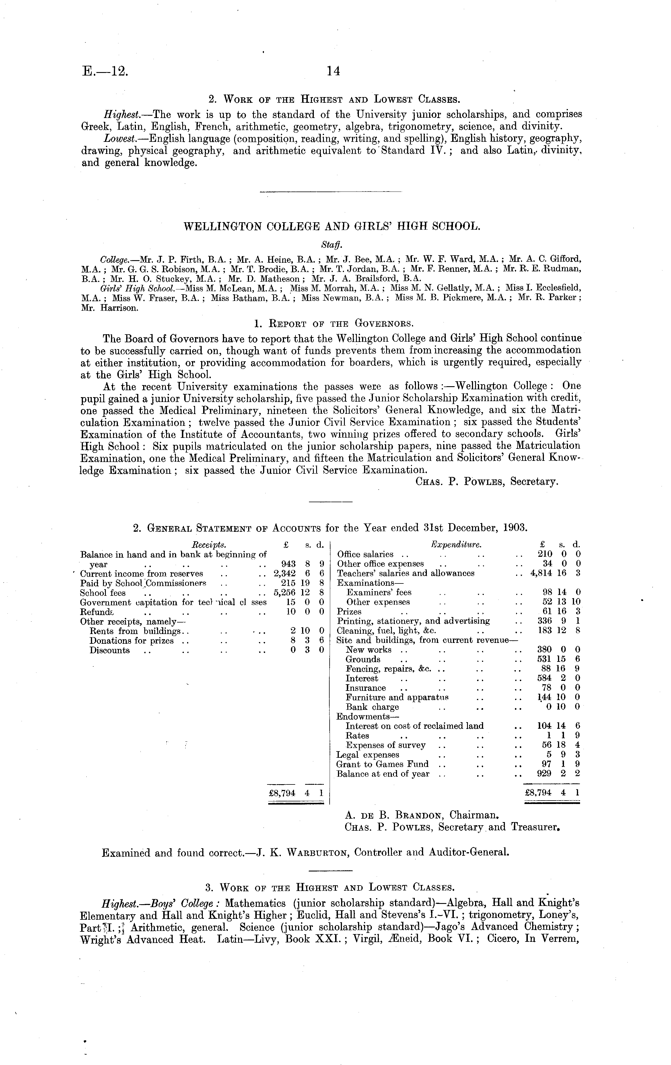 2. General Statement of Accounts for the Year ended 31st December, 1903. Receipts. £ s. d. Expenditure. £ s. d. Balance in hand and in bank at beginning of Office salaries . . . . .. . . 210 0 0 year .. .. .. 943 8 9 Other office expenses .. .. .. 34 0 0 Current income from reserves .. .. 2,342 6 6 Teachers' salaries and allowances .. 4,814 16 3 Paid by School.Commissioners . . .. 215 19 8 Examinations — School fees .. . . .. .. 5,256 12 8 Examiners' fees .. .. .. 98 14 0 Government capitation for tecl "deal cl sses 15 0 0 Other expenses . . .. .. 52 13 10 Refunds. .. .. .. .. 10 0 0 Prizes .. .. .. 61 16 3 Other receipts, namely— Printing, stationery, and advertising .. 336 9 1 Rents from buildings.. .. ... 210 0 Cleaning, fuel, light, &c. .. .. 183 12 8 Donations for prizes .. .. .. 8 3 6 Site and buildings, from current revenue— Discounts .. .. . . .. 0 3 0 New works .. .. .. .. 380 0 0 Grounds .. .. .. .. 531 15 6 Fencing, repairs, &c. .. .. .. 88 16 9 Interest .. .. .. 584 2 0 Insurance .. .. .. .. 78 0 0 Furniture and apparatus .. .. 144 10 0 Bank charge . . .. .. '010 0 Endowments — Interest on cost of reclaimed land .. 104 14 6 Rates .. .. .. .. 119 Expenses of survey .. .. .. 56 18 4 Legal expenses .. .. .. 5 9 3 Grant to Games Fund .. .. .. 97 1 9 Balance at end of year . . .. .. 929 2 2 £8,794 4 1 £8,794 4 1 A. de B. Brandon, Chairman. Chas. P. Powles, Secretary and Treasurer. Examined and found correct. — J. K. Warburton, Controller and Auditor-General.