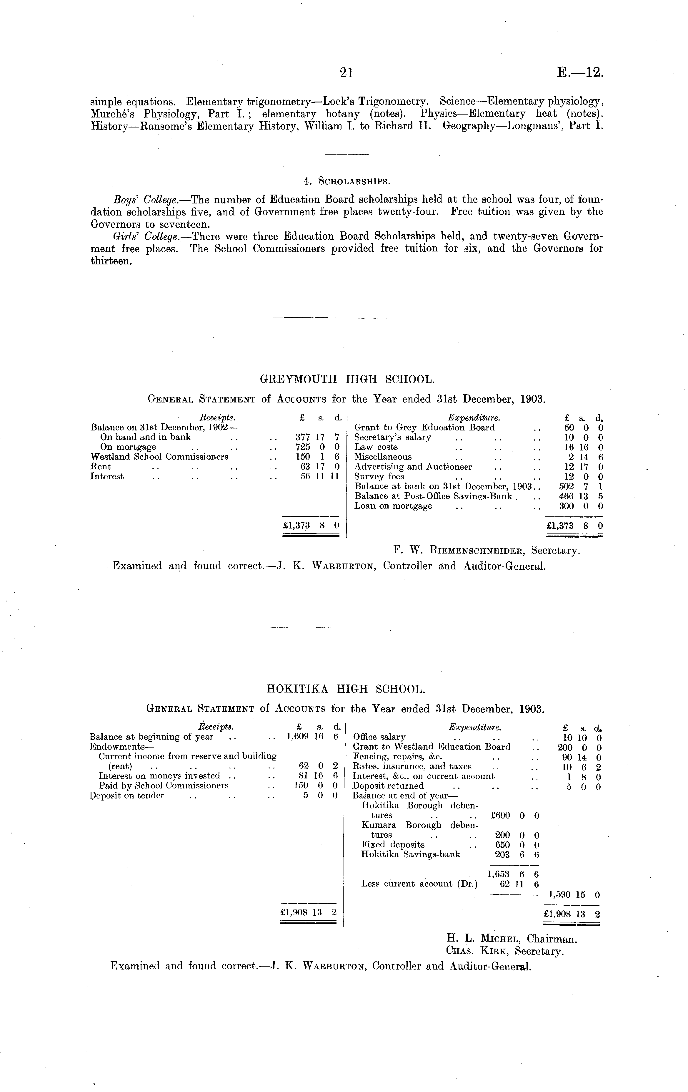 GREYMOUTH HIGH SCHOOL. General Statement of Accounts for the Year ended 31st December, 1903. Receipts. £ s. d. Expenditure. £ s. d. Balance on 31st December, 1902 — Grant to Grey Education Board .. 50 0 0 On hand and in bank .. .. 377 17 7 Secretary's salary .. .. .. 10 0 0 On mortgage .. .. .. 725 0 0 Law costs .. .. .. 16 16 0 Westland School Commissioners .. 150 1 6 Miscellaneous .. .. .. 214 6 Rent .. .. .. .. 63 17 0 I Advertising and Auctioneer .. .. 12 17 0 Interest .. .. .. .. 56 11 11 Survey fees .. .. .. 12 0 0 ] Balance at bank on 31st December, 1903.. 502 7 1 Balance at Post-Office Savings-Bank . . 466 13 5 Loan on mortgage .. .. .. 300 0 0 £1,373 8 0 £1,373 8 0 F. W. Riemenschneider, Secretary. Examined and found correct. — J. K. Warburton, Controller and Auditor-General. HOKITIKA HIGH SCHOOL. General Statement of Accounts for the Year ended 31st December, 1903. Receipts. £ s. d. [ Expenditure. £ s. d. Balance at beginning of year .. .. 1,609 16 6 Office salary .. .. .. 10 10 0 Endowments— ] Grant to Westland Education Board . . 200 0 0 Current income from reserve and building ,' Fencing, repairs, &c. .. .. 90 14 0 (rent) .. .. . . .. 62 0 2 Rates, insurance, and taxes .. .. 10 6 2 Interest on moneys invested .. .. 81 16 6 I Interest, &c, on current account . . 18 0 Paid by School Commissioners .. 150 0 0 ! Deposit returned .. .. .. 5 0 0 Deposit on tender .. .. .. 5 0 0 Balance at end of year — Hokitika Borough debentures .. .. £600 0 0 Kumara Borough debentures .. . . 200 0 0 Fixed deposits . . 650 0 0 Hokitika Savings-bank 203 6 6 1,653 6 6 Less current account (Dr.) 62 11 6 1,590 15 0 £1,908 13 2 £1,908 13 ~2 H. L. Michel, Chairman. Chas. Kirk, Secretary. Examined and found correct. — J. K. Warburton, Controller and Auditor-General.
