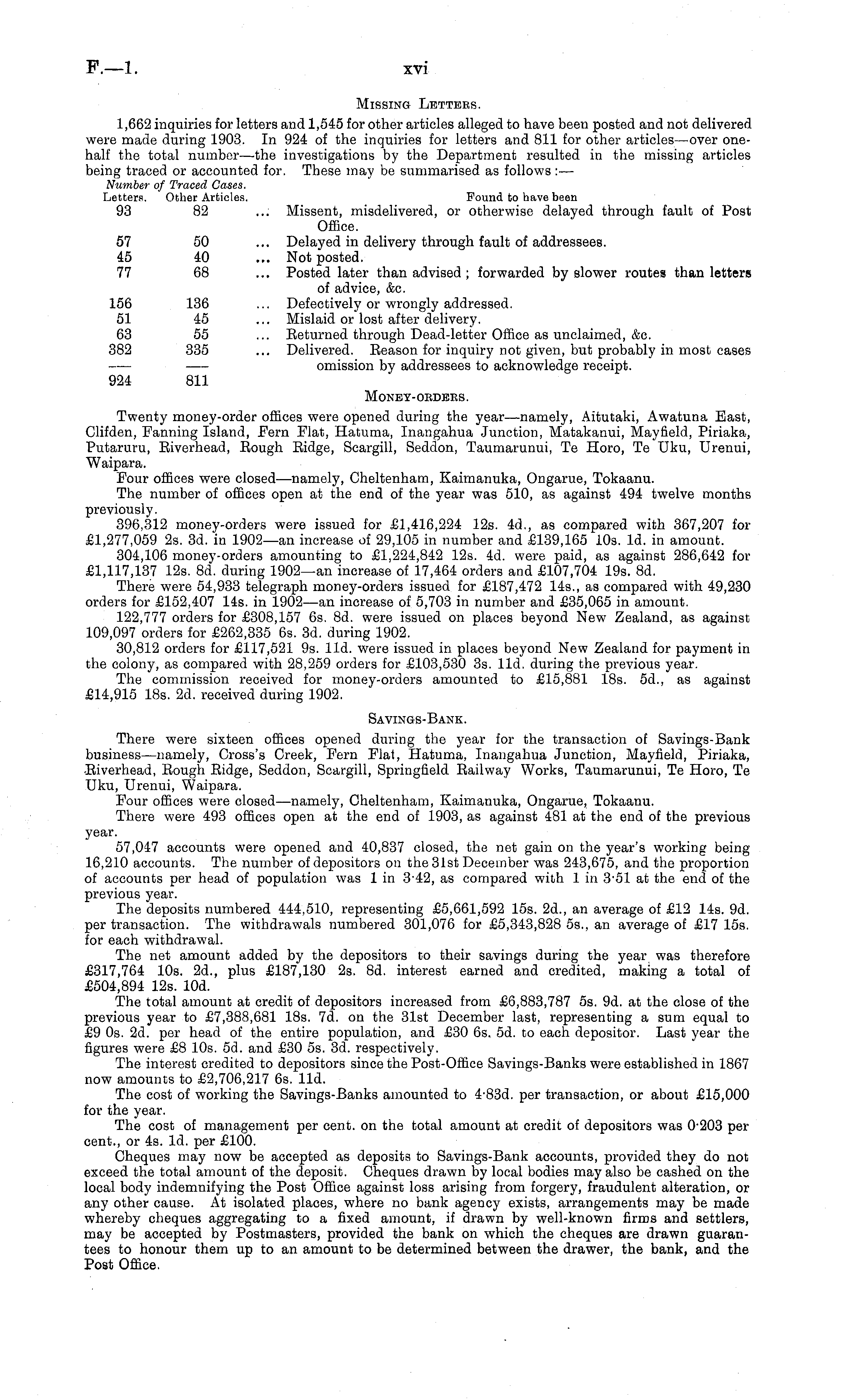 Missing Letters. 1,662 inquiries for letters and 1,545 for other articles alleged to have been posted and not delivered were made during 1903. In 924 of the inquiries for letters and 811 for other articles—over onehalf the total number—the investigations by the Department resulted in the missing articles being traced or accounted for. These may be summarised as follows: — Number of Traced Cases. Letters. Other Articles. Pound to have been 93 82 ... Missent, misdelivered, or otherwise delayed through fault of Post Office. 57 50 ... Delayed in delivery through fault of addressees. 45 40 ... Not posted. 77 68 ... Posted later than advised ; forwarded by slower routes than letters of advice, &c. 156 136 ... Defectively or wrongly addressed. 51 45 ... Mislaid or lost after delivery. 63 55 ... Returned through Dead-letter Office as unclaimed, &c. 382 335 ... Delivered. Eeason for inquiry not given, but probably in most cases omission by addressees to acknowledge receipt. 924 811 MoNEY-OBDBES. Twenty money-order offices were opened during the year—namely, Aitutaki, Awatuna East, Clifden, Fanning Island, Pern Plat, Hatuma, Inangahua Junction, Matakanui, Mayfield, Piriaka, Putaruru, Eiverhead, Eough Eidge, Scargill, Seddon, Taumarunui, Te Horo, Te Uku, Urenui, Waipara. Pour offices were closed—namely, Cheltenham, Kaimanuka, Ongarue, Tokaanu. The number of offices open at the end of the year was 510, as against 494 twelve months previously. 396,312 money-orders were issued for £1,416,224 12s. 4d., as compared with 367,207 for £1,277,059 2s. 3d. in 1902—an increase of 29,105 in number and £139,165 10s. Id. in amount. 304,106 money-orders amounting to £1,224,842 12s. 4d. were paid, as against 286,642 for £1,117,137 12s. Bd. during 1902—an increase of 17,464 orders and £107,704 19s. Bd. There were 54,933 telegraph money-orders issued for £187,472 145., as compared with 49,230 orders for £152,407 14s. in 1902 —an increase of 5,703 in number and £35,065 in amount. 122,777 orders for £308,157 6s. Bd. were issued on places beyond New Zealand, as against 109,097 orders for £262,335 6s. 3d. during 1902. 30,812 orders for £117,521 9s. lid. were issued in places beyond New Zealand for payment in the colony, as compared with 28,259 orders for £103,530 3s. lid. during the previous year. The commission received for money-orders amounted to £15,881 18s. 5d., as against £14,915 18s. 2d. received during 1902. Savings-Bank. There were sixteen offices opened during the year for the transaction of Savings-Bank business —namely, Cross's Creek, Pern Flat, Hatuma, Inangahua Junction, Mayfield, Piriaka, Eiverhead, Eough Eidge, Seddon, Scargill, Springfield Eailway Works, Taumarunui, Te Horo, Te Uku, Urenui, Waipara. Four offices were closed—namely, Cheltenham, Kaimanuka, Ongarue, Tokaanu. There were 493 officea open at the end of 1903, as against 481 at the end of the previous year. 57,047 accounts were opened and 40,837 closed, the net gain on the year's working being 16,210 accounts. The number of depositors on the 31st December was 243,675, and the proportion of accounts per head of population was 1 in 3-42, as compared with 1 in 3'51 at the end of the previous year. The deposits numbered 444,510, representing £5,661,592 15s. 2d., an average of £12 14s. 9d. per transaction. The withdrawals numbered 301,076 for £5,343,828 55., an average of £17 15s. for each withdrawal. The net amount added by the depositors Co their savings during the year was therefore £317,764 10s. 2d., plus £187,130 2s. Bd. interest earned and credited, making a total of £504,894 12s. 10d. The total amount at credit of depositors increased from £6,883,787 ss. 9d. at the close of the previous year to £7,388,681 18s. 7d. on the 31st December last, representing a sum equal to £9 os. 2d. per head of the entire population, and £30 6s. sd. to each depositor. Last year the figures were £8 10s. sd. and £30 ss. 3d. respectively. The interest credited to depositors since the Post-Office Savings-Banks were established in 1867 now amounts to £2,706,217 6s. lid. The cost of working the Savings-Banks amounted to 4'B3d. per transaction, or about £15,000 for the year. The cost of management per cent, on the total amount at credit of depositors was 0'203 per cent., or 4s. Id. per £100. Cheques may now be accepted as deposits to Savings-Bank accounts, provided they do not exceed the total amount of the deposit. Cheques drawn by local bodies may also be cashed on the local body indemnifying the Post Office against loss arising from forgery, fraudulent alteration, or any other cause. At isolated places, where no bank agency exists, arrangements may be made whereby cheques aggregating to a fixed amount, if drawn by well-known firms and settlers, may be accepted by Postmasters, provided the bank on which the cheques are drawn guarantees to honour them up to an amount to be determined between the drawer, the bank, and the Post Office.