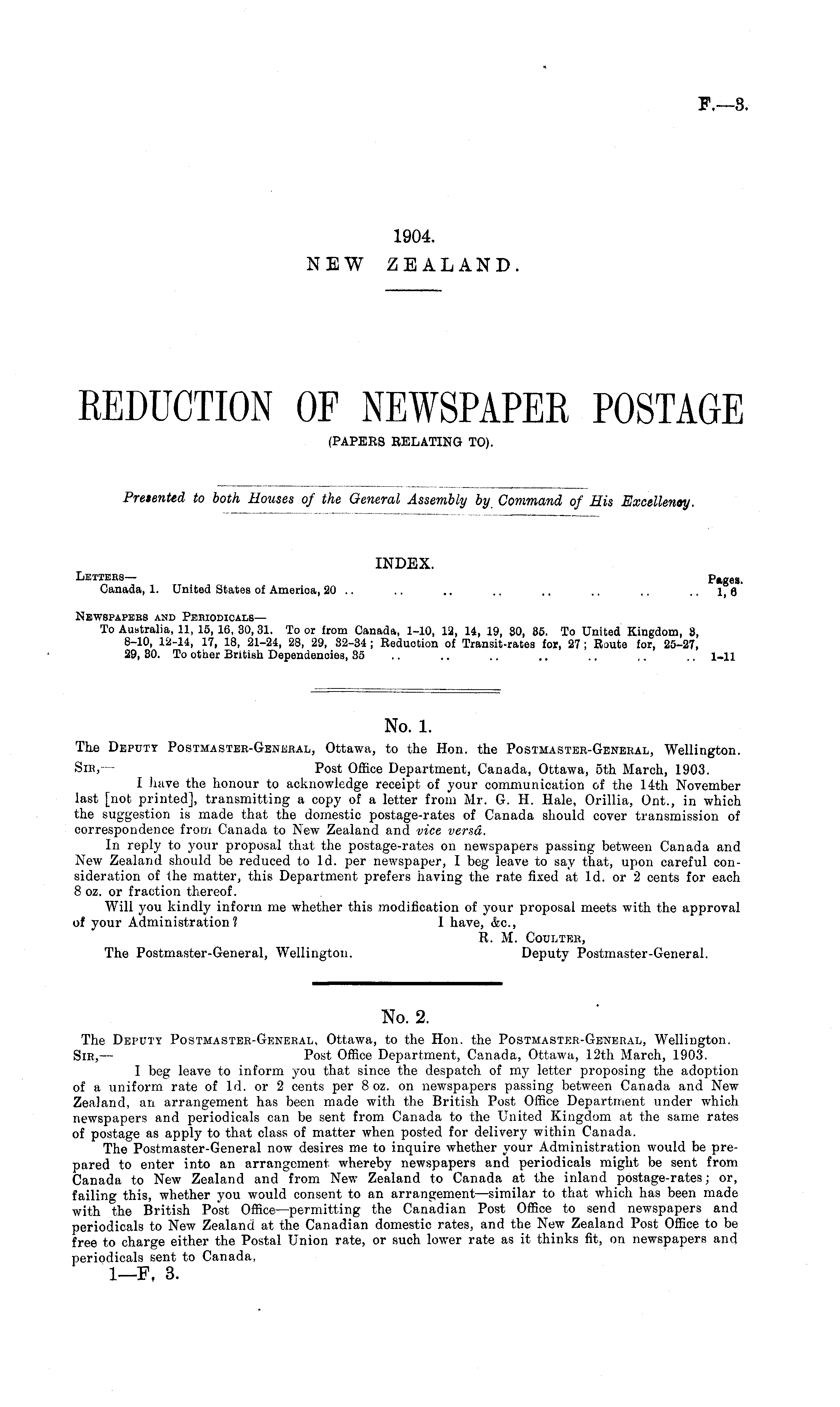 No. 1. The Deputy Postmaster-Gbnisbal, Ottawa, to the Hon. the Postmaster-Genebal, Wellington. Sib,— Post Office Department, Canada, Ottawa, sth March, 1903. I have the honour to acknowledge receipt of your communication of the 14th November last [not printed], transmitting a copy of a letter from Mr. G. H. Hale, Orillia, Ont., in which the suggestion is made that the domestic postage-rates of Canada should cover transmission of correspondence from Canada to New Zealand and vice versa. In reply to your proposal that the postage-rates on newspapers passing between Canada and New Zealand should be reduced to Id. per newspaper, I beg leave to say that, upon careful consideration of the matter, this Department prefers having the rate fixed at Id. or 2 cents for each 8 oz. or fraction thereof. Will you kindly inform me whether this modification of your proposal meets with the approval of your Administration? I have, &c, R. M. Coulteb, The Postmaster-General, Wellington. Deputy Postmaster-General.