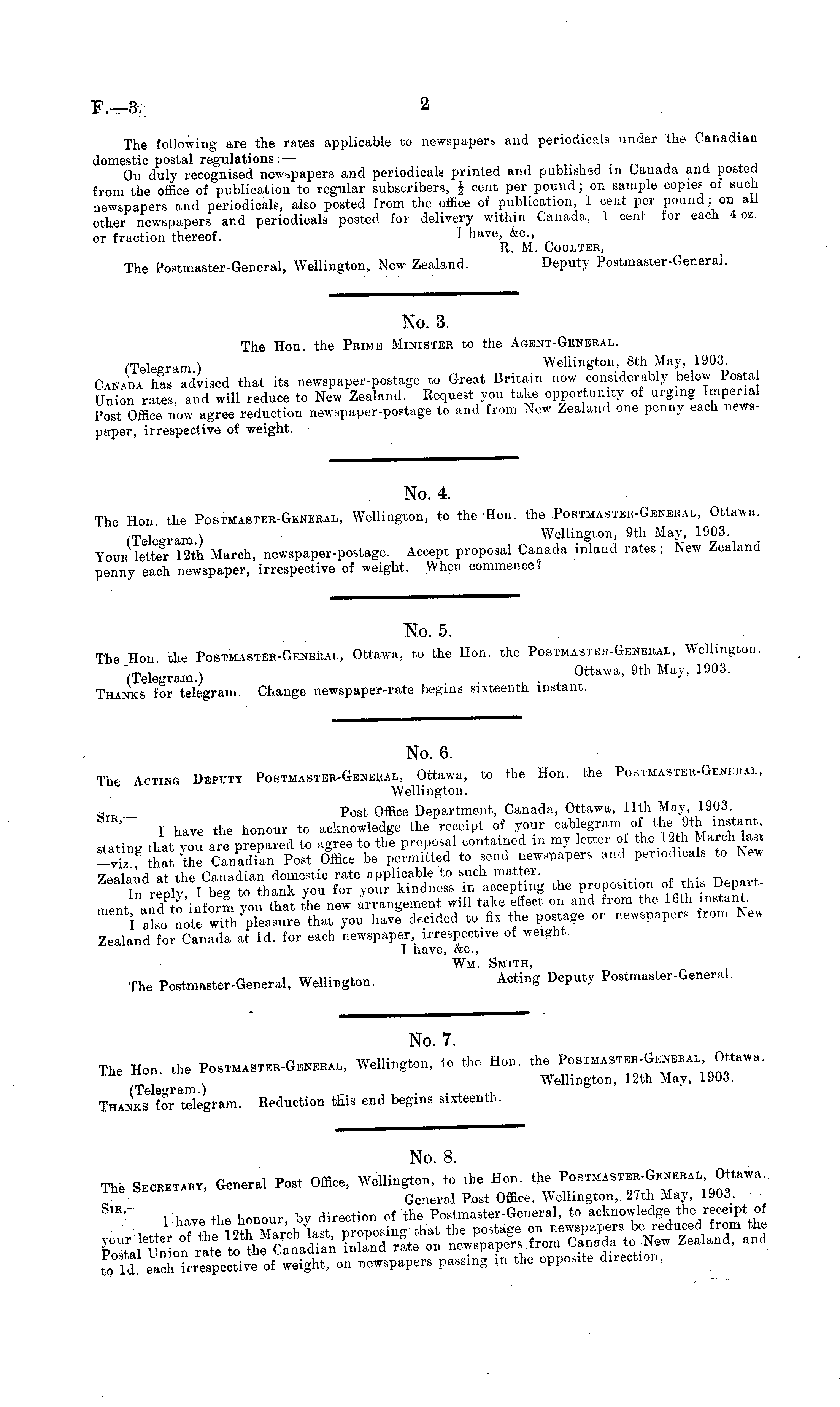 No. 3. The Hon. the Pbime Minister to the Agent-General. (Telegram ) Wellington, Bth May, 1903. Canada has advised that its newspaper-postage to Great Britain now considerably below Posta Union rates, and will reduce to New Zealand. Bequest you take opportunity of urging Imperial Post Office now agree reduction newspaper-postage to and from New Zealand one penny each newspaper, irrespective of weight.