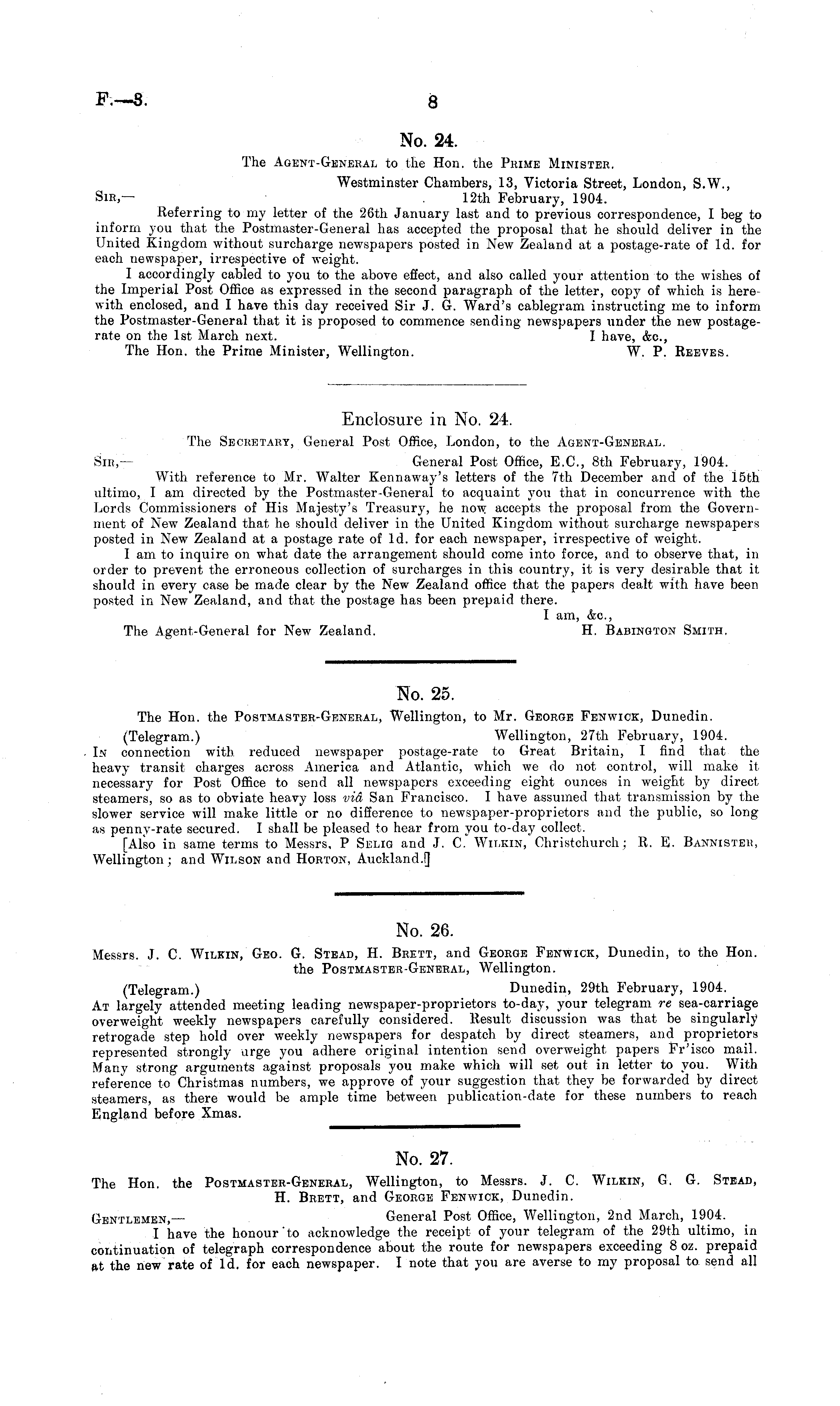 No. 25. The Hon. the Postmaster-General, Wellington, to Mr. George Fenwick, Dunedin. (Telegram.) Wellington, 27th February, 1904. In connection with reduced newspaper postage-rate to Great Britain, I find that the heavy transit charges across America and Atlantic, which we do not control, will make it necessary for Post Office to send all newspapers exceeding eight ounces in weight by direct steamers, so as to obviate heavy loss via San Francisco. I have assumed that transmission by the slower service will make little or no difference to newspaper-proprietors and the public, so long as penny-rate secured. I shall be pleased to hear from you to-day collect. [Also in same terms to Messrs, P Selig and J. C. Wilkin, Christchurch ; R. E. Bannister, Wellington ; and Wilson and Horton, Auckland.!]
