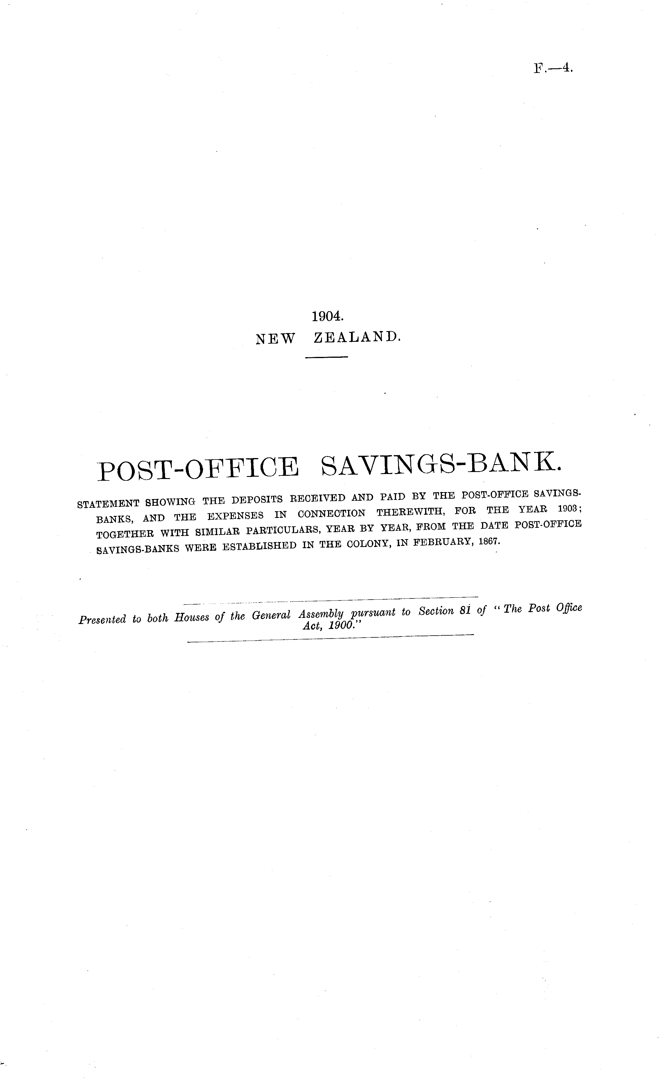 STATEMENT SHOWING THE DEPOSITS RECEIVED AND PAID BY THE POST-OFFICE SAVINGSmNKS AND THE EXPENSES IN CONNECTION THEREWITH, FOR THE YEAR 1903; TOGETHER WITH SIMILAR PARTICULARS, YEAR BY YEAR, FROM THE DATE POST-OFFICE SAVINGS-BANKS WERE ESTABLISHED IN THE COLONY, IN FEBRUARY, 1867.