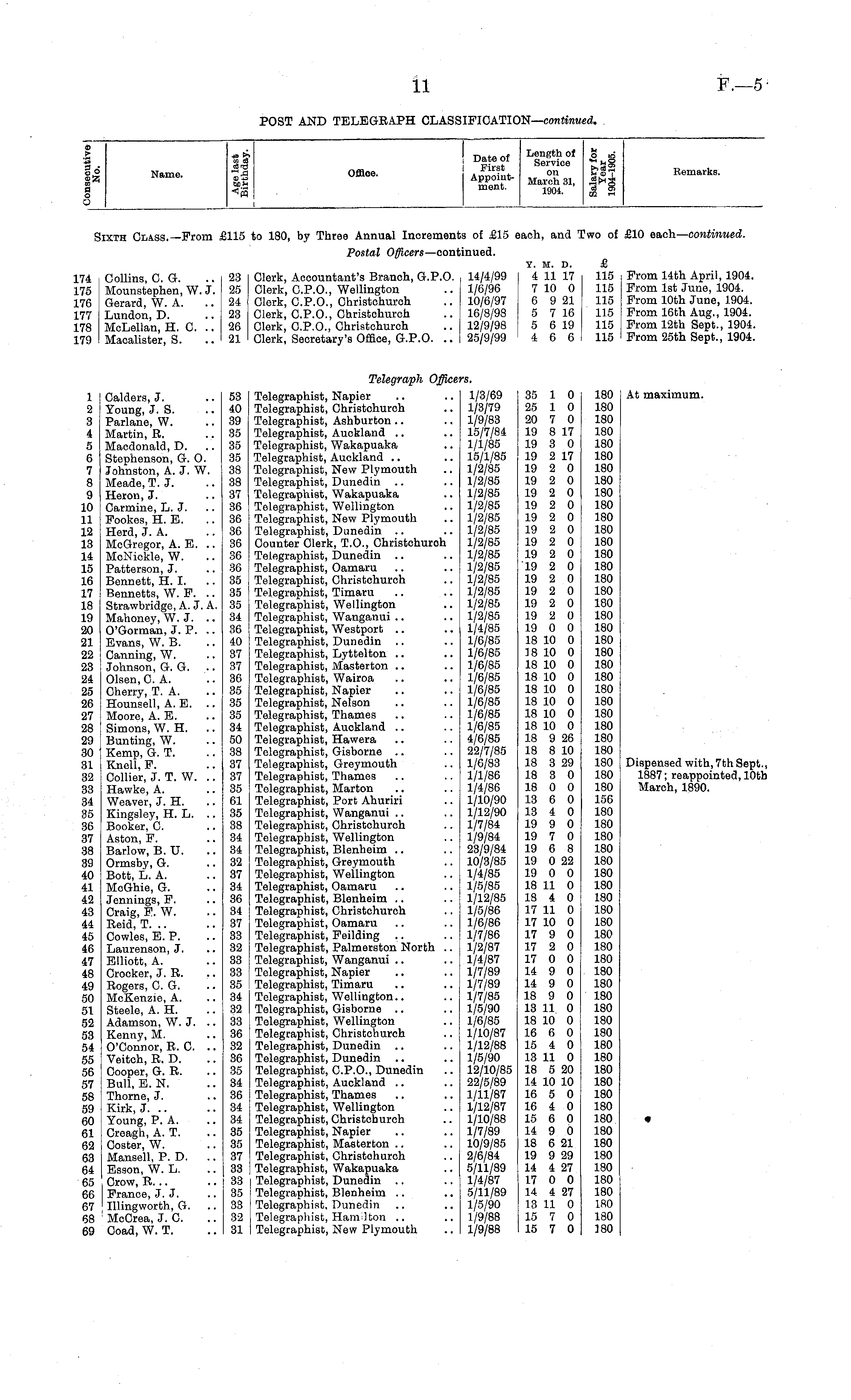 > '-a a o o Name. 03 T3 .| _n I Offioe. Dnteof Length of g «j D Firsf Se " ioe *!3§ A S nt " March 31, jSlSi ment ' 1904. _ * Remarks. Sixth Class.—From £115 to 180, by Three Annual Increment ;a of £15 each, and Two of £10 each— continued. Postal Officers— cont iinued. 74 Collins, C G. .. 23 Clerk, Accountant's Branch, G.P.O. .75 Mounstephen, W. J. 25 Clerk, C.P.O., Wellington 76 Gerard, W. A. .. 24 Clerk, C.P.O., Christchuroh 77 Lundon, D. .. 23 Clerk, C.P.O., Christchurch .78 McLellan, H. C. .. 26 Clerk, C.P.O., Christchurch .79 Macalister, S. .. 21 Clerk, Secretary's Office, G.P.O. .. y. m. D. £ 14/4/99 4 11 17 115 From 14th April, 1904. 1/6/96 7 10 0 115 From 1st June, 1904. 10/6/97 6 9 21 115 From 10th June, 1904. 16/8/98 5 7 16 115 From 16th Aug., 1904. 12/9/98 5 6 19 115 From 12th Sept., 1904. 25/9/99 4 6 6 115 From 25th Sept., 1904. Telegraph Office 1 . rs. 1 2 3 4 5 6 7 8 9 10 11 12 13 14 15 16 17 18 19 20 21 22 23 24 25 26 27 28 29 30 31 32 33 34 35 86 37 38 39 40 41 42 43 44 45 40 47 48 49 50 51 52 53 54 55 56 57 58 59 60 61 62 63 64 65 66 67 68 69 1 Calders, J. .. 53 Telegraphist, Napier 2 Young, J. S. .. 40 Telegraphist, Christchuroh 3 Parlane, W. .. 39 Telegraphist, Ashburton 4 Martin, R. .. 35 Telegraphist, Auokland 5 Macdonald, D. .. 35 Telegraphist, Wakapuaka 6 Stephenson, G. 0. 35 Telegraphist, Auckland .. 7 Johnston, A. J. W. 38 Telegraphist, New Plymouth 8 Meade, T. J. .. 38 Telegraphist, Dunedin 9 Heron, J. .. 37 Telegraphist, Wakapuaka 10 Carmine, L. J. .. 36 Telegraphist, Wellington 11 Fookes, H. E. .. 36 Telegraphist, New Plymouth 12 Herd, J. A. .. 36 Telegraphist, Dunedin 13 McGregor, A. E. .. 36 Counter Clerk, T.O., Christchuroh 14 MoNickle, W. .. 36 Telegraphist, Dunedin 15 Patterson, J. .. 36 Telegraphist, Oamaru 16 Bennett, H. I. .. 35 Telegraphist, Christchurch 17 Bennetts, W. F. .. 35 Telegraphist, Timaru 18 Strawbridge, A. J. A. 35 Telegraphist, Wellington 19 Mahoney, W. J. .. 34 Telegraphist, Wanganui 20 O'Gorman, J. P. .. 36 Telegraphist, Westport 21 Evans, W. B. .. 40 Telegraphist, Dunedin 22 Canning, W. .. 37 Telegraphist, Lyttelton 23 Johnson, G. G. .. 37 Telegraphist, Masterton 24 Olsen, 0. A. .. 36 Telegraphist, Wairoa 25 Cherry, T. A. .. 35 Telegraphist, Napier 26 Hounsell, A. E. .. 35 Telegraphist, Nelson 27 Moore, A. E. .. 35 Telegraphist, Thames 28 Simons, W. H. .. 34 Telegraphist, Auckland 29 Bunting, W. .. 50 Telegraphist, Hawera 30 Kemp, G. T. .. 38 Telegraphist, Gisborne 31 Knell, F. .. 37 Telegraphist, Greymouth 32 Collier, J. T. W. .. 37 Telegraphist, Thames 33 Hawke, A. .. 35 Telegraphist, Marton 34 Weaver, J. H. .. 61 Telegraphist, Port Ahuriri 35 Kingsley, H. L. .. 35 Telegraphist, Wanganui 36 Booker, C. .. 38 Telegraphist, Christchurch 37 Aston, F. .. 34 Telegraphist, Wellington 38 Barlow, B. U. .. 34 Telegraphist, Blenheim 39 Ormsby, G. .. 32 Telegraphist, Greymouth 40 Bott, L. A. .. 37 Telegraphist, Wellington 41 McGhie, G. .. 34 Telegraphist, Oamaru 42 Jennings, F. .. 36 Telegraphist, Blenheim 43 Craig, F. W. .. 34 Telegraphist, Christchurch 44 Reid, T. .. .. 37 Telegraphist, Oamaru 45 Cowles, E. P. .. 33 Telegraphist, Feilding 46 Laurenson, J. .. 32 Telegraphist, Palmerston North .. 47 Elliott, A. .. 33 Telegraphist, Wanganui 48 Crocker, J. R. .. 33 Telegraphist, Napier 49 Rogers, C. G. .. 35 Telegraphist, Timaru 50 McKenzie, A. .. 34 Telegraphist, Wellington.. 51 Steele, A. H. .. 32 Telegraphist, Gisborne 52 Adamson, W. J. .. 33 Telegraphist, Wellington 53 Kenny, M. .. 36 Telegraphist, Christchuroh 54 O'Connor, R. C. .. 32 Telegraphist, Dunedin 55 Veitch, R. D. .. 36 Telegraphist, Dunedin 56 Cooper, G. R. .. 35 Telegraphist, C.P.O., Dunedin 57 Bull, E. N. .. 34 Telegraphist, Auckland .. 58 Thorne, J. .. 36 Telegraphist, Thames 59 Kirk, J. .. .. 34 Telegraphist, Wellington 60 Young, P. A. .. 34 Telegraphist, Christchurch 61 Creagh, A. T. .. 35 Telegraphist, Napier 62 Coster, W. .. 35 Telegraphist, Masterton 63 Mansell, P. D. .. 37 Telegraphist, Christohurch 64 Esson, W. L. .. 33 Telegraphist, Wakapuaka 65 Crow, R. .. .. 33 Telegraphist, Dunedin 66 France, J. J. .. 35 Telegraphist, Blenheim .. 67 ■ Illingworth, G. .. 33 Telegraphist, Dunedin .. 68 McCrea, J. C. .. 32 Telegraphist, Ham Iton .. 69 Coad, W. T. .. 31 Telegraphist, New Plymouth 1/3/69 35 1 0 180 At maximum. 1/3/79 25 1 0 180 1/9/83 20 7 0 180 15/7/84 19 8 17 180 1/1/85 19 3 0 180 15/1/85 19 2 17 180 1/2/85 19 2 0 180 1/2/85 19 2 0 180 1/2/85 19 2 0 180 1/2/85 19 2 0 180 1/2/85 19 2 0 180 1/2/85 19 2 0 180 1/2/85 19 2 0 180 1/2/85 19 2 0 180 1/2/85 19 2 0 180 1/2/85 19 2 0 180 1/2/85 19 2 0 180 1/2/85 19 2 0 180 1/2/85 19 2 0 180 1/4/85 19 0 0 180 1/6/85 18 10 0 180 1/6/85 18 10 0 180 1/6/85 18 10 0 180 1/6/85 18 10 0 180 1/6/85 18 10 0 180 1/6/85 18 10 0 180 1/6/85 18 10 0 180 1/6/85 18 10 0 180 4/6/85 18 9 26 180 22/7/85 18 8 10 180 1/6/83 18 3 29 180 Dispensed with, 7th Sept., 1/1/86 18 3 0 180 1887; reappointed, 10th 1/4/86 18 0 0 180 March, 1890. 1/10/90 13 6 0 156 1/12/90 13 4 0 180 1/7/84 19 9 0 180 1/9/84 19 7 0 180 23/9/84 19 6 8 180 10/3/85 19 0 22 180 1/4/85 19 0 0 180 1/5/85 18 11 0 180 1/12/85 18 4 0 180 1/5/86 17 11 0 180 1/6/86 17 10 0 180 1/7/86 17 9 0 180 1/2/87 17 2 0 180 1/4/87 17 0 0 180 1/7/89 14 9 0 180 1/7/89 14 9 0 180 1/7/85 18 9 0 180 1/5/90 13 11 0 180 1/6/85 18 10 0 180 1/10/87 16 6 0 180 1/12/88 15 4 0 180 1/5/90 13 11 0 180 12/10/85 18 5 20 180 22/5/89 14 10 10 180 1/11/87 16 5 0 180 1/12/87 16 4 0 180 1/10/88 15 6 0 180 • 1/7/89 14 9 0 180 10/9/85 18 6 21 180 2/6/84 19 9 29 180 5/11/89 14 4 27 180 1/4/87 17 0 0 180 5/11/89 14 4 27 180 1/5/90 13 11 0 180 1/9/88 15 7 0 180 1/9/88 15 7 0 180 •