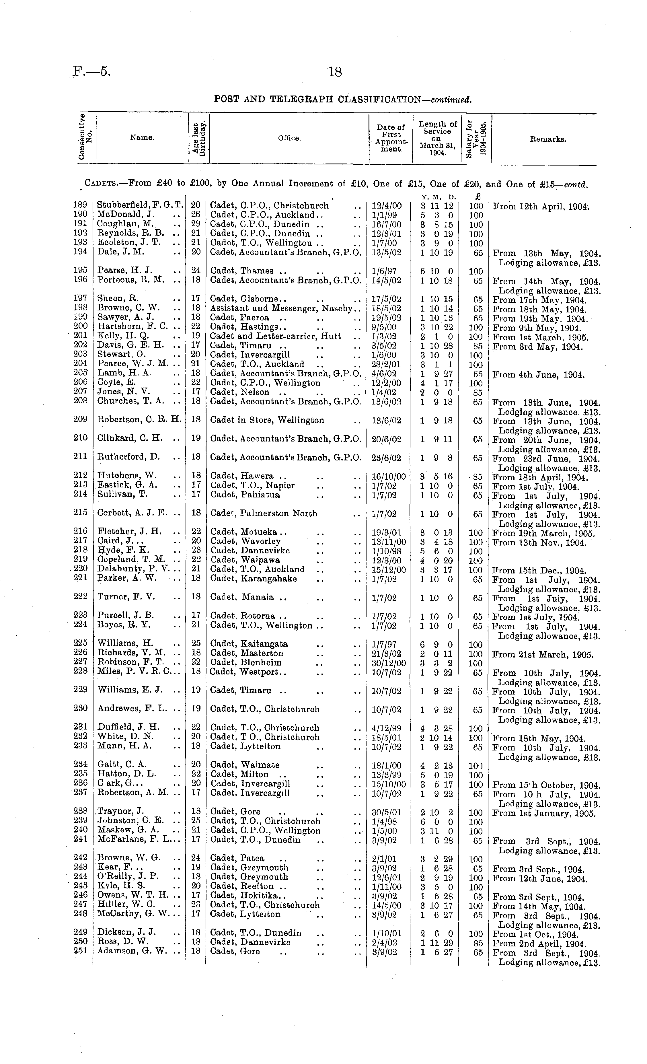 9 > gd a o o Name. S «" 03 _| ex" Office. Date of L | n S tb of £ _ Firs? Se ™ *„§ A 5, P a °Bt nt " MarSiSl. liS_ meat 1904. _ g Remarks. C. iDETS. —From £40 to £101 I, by One Annual Inorement of £1( I, One of 115, One ol £20, £ 100 100 100 100 100 65 ,nd One of £15 — contd. 189 190 191 192 193 194 Stubberfield.F.G.T. McDonald, J. Coughlan, M. Reynolds, R. B. Eccleton, J. T. .. Dale, J. M. 20 26 29 21 21 20 Cadet, C.P.O., Christchuroh Cadet, C.P.O., Auckland.. Cadet, C.P.O., Dunedin .. Cadet, C.P.O., Dunedin Cadet, T.O., Wellington Cadet, Accountant's Branch, G.P.O. 12/4/00 1/1/99 16/7/00 12/3/01 1/7/00 13/5/02 Y. M. D. 3 11 12 5 3 0 3 8 15 3 0 19 3 9 0 1 10 19 From 12th April, 1904. From 13th May, 1904 Lodging allowance, £13. 195 196 Pearse, H. J. Porteous, R. M. 24 18 Cadet, Thames Cadet, Accountant's Branoh, G.P.O. 1/6/97 14/5/02 6 10 0 1 10 18 100 65 From 14th May, 1904, Lodging allowance, £13, From 17th May, 1904. From 18th May, 1904. From 19th May, 1904. From 9th May, 1904. From 1st March, 1905. From 3rd May, 1904. 197 198 199 200 201 202 203 204 205 206 207 208 Sheen, R. Browne, C W. Sawyer, A. J. Hartshorn, F. C. Kelly, H. Q. Davis, G. E. H. Stewart, O. Pearoe, W. J. M. Lamb, H. A. Coyle, E. Jones, N. V. Churches, T. A. 17 18 18 22 19 17 20 21 18 22 17 18 Cadet, Gisborne.. Assistant and Messenger, Naseby.. Cadet, Paeroa Cadet, Hastings.. Cadet and Letter-carrier, Hutt Cadet, Timaru Cadet, Invercargill Cadet, T.O., Auckland Cadet, Accountant's Branch, G.P.O. Cadet, C.P.O., Wellington Cadet, Nelson Cadet, Accountant's Branch, G.P.O. 17/5/02 18/5/02 19/5/02 9/5/00 1/3/02 3/5/02 1/6/00 28/2/01 4/6/02 12/2/00 1/4/02 13/6/02 1 10 15 1 10 14 1 10 13 3 10 22 2 10 1 10 28 3 10 0 3 11 1 9 27 4 1 17 2 0 0 1 9 18 65 65 65 100 100 85 100 100 65 100 85 65 From 4th June, 1904. 209 210 211 212 213 214 Robertson, C. R. H. Clinkard, 0. H. Rutherford, D. Hutchens, W. Eastick, G. A. Sullivan, T. 18 19 18 18 17 17 Cadet in Store, Wellington Cadet, Accountant's Branoh, G.P.O. Cadet, Accountant's Branch, G.P.O. Cadet, Hawera Cadet, T.O., Napier Cadet, Pahiatua 13/6/02 20/6/02 23/6/02 16/10/00 1/7/02 1/7/02 1 9 18 1 9 11 19 8 3 5 16 1 10 0 1 10 0 65 65 65 ■85 65 65 From 13th June, 1904, Lodging allowanoe. £13, From 13th June, 1904, Lodging allowance, £13, From 20th June, 1904, Lodging allowance, £13. From 23rd June, 1904. Lodging allowance, £13, From 18th April, 1904. From 1st July, 1904. From 1st July, 1904. Lodging allowance, £13. From 1st July, 1904. Lodging allowance, £13. From 19th March, 1905. From 13th Nov., 1904. 215 Corbett, A. J. E. 18 Cadet, Palmerston North 1/7/02 1 10 0 65 216 217 218 219 220 221 Fletoher, J. H. .. Caird, J... Hyde, F. K. Copeland, T. M. Delahunty, P. V. .. Parker, A. W. 22 20 23 22 21 18 Cadet, Motueka Cadet, Waverley Cadet, Dannevirke Cadet, Waipawa Cadet, T.O., Auckland Cadet, Karangahake 19/3/01 13/11/00 1/10/98 12/3/00 15/12/00 1/7/02 3 0 13 3 4 18 5 6 0 4 0 20 3 3 17 1 10 0 100 100 100 100 100 65 222 Turner, F. V. 18 Cadet, Manaia .. 1/7/02 1 10 0 65 From 15th Dec, 1904. From 1st July, 1904. Lodging allowance, £13, From 1st July, 1904. Lodging allowance, £13, From 1st July, 1904. From 1st July, 1904. Lodging allowance, £13. 223 224 Purcell, J. B. Boyes, R. Y. 17 21 Cadet, Rotorua Cadet, T.O., Wellington 1/7/02 1/7/02 1 10 0 1 10 0 65 65 225 226 227 228 Williams, H. Richards, V. M. Robinson, F. T. Miles, P. V. R.C.. 25 18 22 18 Cadet, Kaitangata Cadet, Masterton Cadet, Blenheim Cadet, Westport.. 1/7/97 21/3/02 30/12/00 10/7/02 6 9 0 2 0 11 3 3 2 1 9 22 100 100 100 65 From 21st March, 1905. 229 Williams, E. J. .. 19 Cadet, Timaru 10/7/02 1 9 22 65 From 10th July, 1904 Lodging allowance, £13, From 10th July, 1904. Lodging allowance, £13, From 10th July, 1904, Lodging allowance, £13, 230 Andrewes, F. L. 19 Cadet, T.O., Christchurch 10/7/02 1 9 22 65 231 232 233 Duffield, J. H. White, D. N. Munn, H. A. 22 20 18 Cadet, T.O., Christchurch Cadet, T 0., Christchurch Cadet, Lyttelton 4/12/99 18/5/01 10/7/02 4 3 28 2 10 14 1 9 22 100 100 65 From 18th May, 1904. From 10th July, 1904, Lodging allowance, £13, 234 235 236 237 Gaitt, C A. Hatton.D. L. dark, G... Robertson, A. M. 20 22 20 17 Cadet, Waimate Cadet, Milton Cadet, Invercargill Cadet, Invercargill 18/1/00 13/3/99 15/10/00 10/7/02 4 2 13 5 0 19 3 5 17 1 9 22 10) 100 100 65 From 15th October, 1904, From 10 h July, 1904. Lodging allowance, £13. From 1st January, 1905. 238 239 240 241 Traynor, J. Johnston, C E. Maskew, G. A. McFarlane, F. L... 18 25 21 17 Cadet, Gore Cadet, T.O., Christchurch Cadet, C.P.O., Wellington Cadet, T.O., Dunedin 30/5/01 1/4/98 1/5/00 3/9/02 2 10 2 6 0 0 3 11 0 1 6 28 100 100 100 65 From 3rd Sept., 1904. Lodging allowance, £13, 242 243 244 245 246 247 248 Browne, W. G. Kear, F. .. O'Reilly, J. P. .. Kvle, H. S. Owens, W. T. H. .. Hillier, W. C. McCarthy, G. W. .. 24 19 18 20 17 23 17 Cadet, Patea Cadet, Greymouth Cadet, Greymouth Cadet, Reefton Cadet, Hokitika.. Cadet, T.O., Christchurch Cadet, Lyttelton 2/1/01 3/9/02 12/6/01 1/11/00 3/9/02 14/5/00 3/9/02 3 2 29 1 6 28 2 9 19 3 5 0 1 6 28 3 10 17 1 6 27 100 65 100 100 65 100 65 From 3rd Sept., 1904. From 12th June, 1904. 249 250 251 Dickson, J. J. Ross, D. W. Adamson, G. W. 18 18 18 Cadet, T.O., Dunedin Cadet, Dannevirke Cadet, Gore 1/10/01 2/4/02 3/9/02 2 6 0 1 11 29 1 6 27 100 85 65 From 3rd Sept., 1904. From 14th May, 1904. From 3rd Sept., 1904, Lodging allowance, £13. From 1st Oct., 1904. From 2nd April, 1904. From 3rd Sept., 1904. Lodging allowance, £13.
