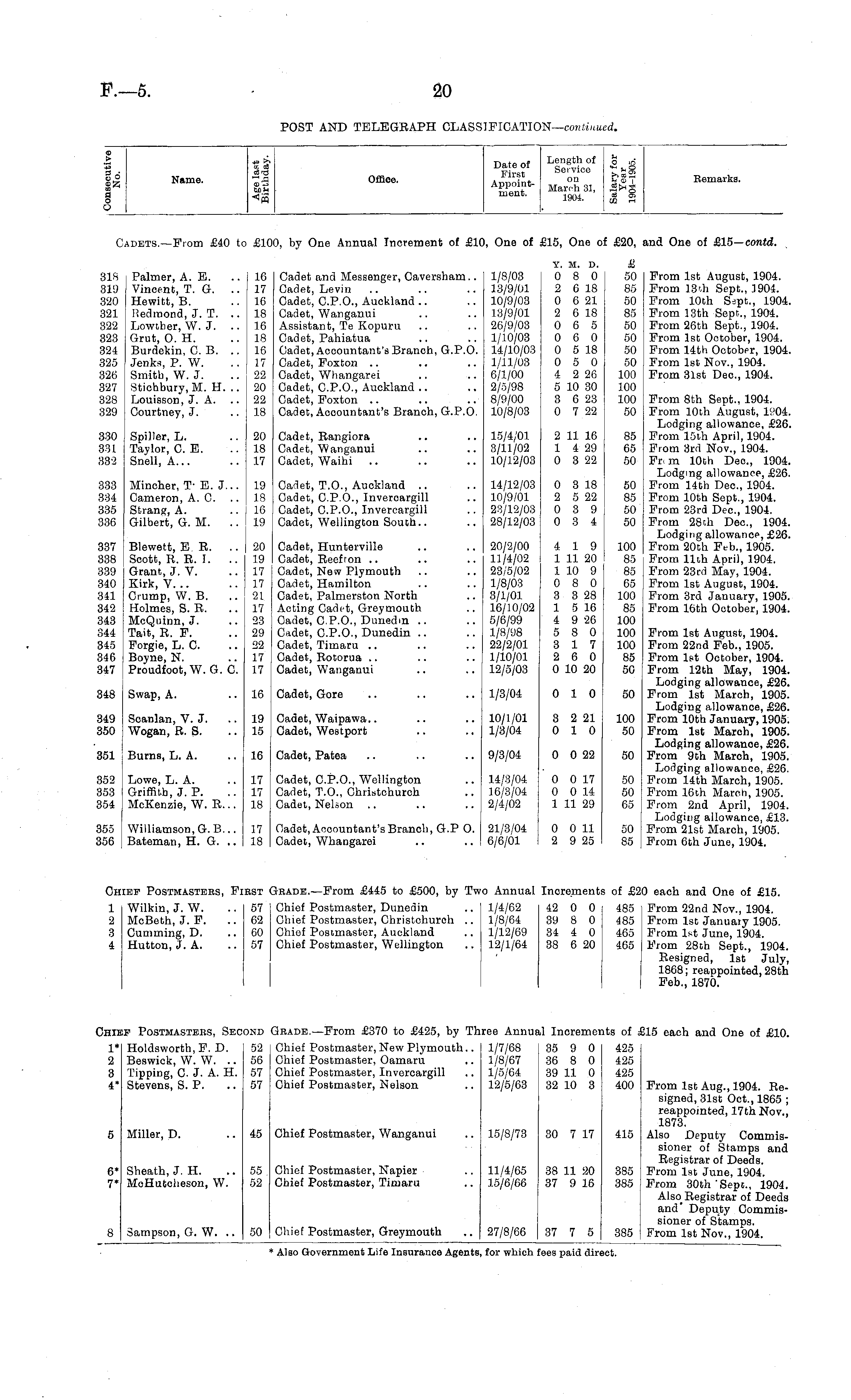 > °S a o o Name. ■» 6 it. o3 o3^3 za Office. Date of First Appointment. Length of Service on March 31, 1904. O in >* « °* IS <=> CD Oi 02 n Remarks. Cadets.—From £40 to £100, by One Annual Increment of £10, One of £15, One of £20, and One of £15—cont'd 31S 319 320 321 322 323 324 325 326 327 328 329 330 331 332 333 334 335 336 337 338 339 340 341 342 343 344 345 346 347 Y. M. D. £ SIS Palmer, A. E. ..16 Cadet and Messenger, Caversham.. 1/8/03 0 8 0 50 From 1st August, 1904. 319 Vincent, T. G. ..17 Cadet, Levin .. .. .. 13/9/01 2 6 18 85 From 18ih Sept., 1904. 320 Hewitt, B. .. 16 Cadet, C.P.O., Auckland .. .. 10/9/03 0 6 21 50 From 10th Sept., 1904. 121 Redmond, J. T. .. 18 Cadet, Wanganui .. .. 13/9/01 2 6 18 85 From 13th Sept., 1904. 122 Lowther, W.J. .. 16 Assistant, Te Kopuru .. .. 26/9/03 0 6 5 50 From 26th Sept., 1904. 123 Grut, O. H. .. 18 Cadet, Pahiatua .. .. 1/10/03 0 6 0 50 From 1st October, 1904. 124 Burdekin, C B. .. 16 Cadet, Accountant's Branch, G.P.O. 14/10/03 0 5 18 50 From 14th October, 1904. 125 Jenks, P. W. .. 17 Cadet, Foxton .. .. .. 1/11/03 0 5 0 50 From 1st Nov., 1904. 126 Smith, W. J. .. 22 Cadet, Whangarei .. .. 6/1/00 4 2 26 100 From 31st Dec, 1904. 127 Stiohbury, M. H. .. 20 Cadet, C.P.O., Auckland .. .. 2/5/98 5 10 30 100 128 Louisson, J. A. .. 22 Cadet, Foxton .. .. .. 8/9/00 3 6 23 100 From 8th Sept., 1904. 129 Courtney, J. .. 18 Cadet, Accountant's Branch, G.P.O. 10/8/03 0 7 22 50 From 10th August, 1904. Lodging allowance, £26. 130 Spiller, L. .. 20 Cadet, Rangiora .. .. 15/4/01 2 11 16 85 From 15th April, 1904. 131 Taylor, C. E. .. 18 Cadet, Wanganui .. .. 3/11/02 1 4 29 65 From 3rd Nov., 1904. 32 Snell, A... .. 17 Cadet, Waihi .. .. .. 10/12/03 0 3 22 50 Fnm 10th Dec, 1904. Lodging allowance, £26. 33 Mincher, T-E. J... 19 Cadet, T.O., Auckland .. .. 14/12/03 0 3 18 50 From 14th Dec, 1904. 34 Cameron, A. C. .. 18 Cadet, C.P.O., Invercargill .. 10/9/01 2 5 22 85 From 10th Sept., 1904. 35 Strang, A. .. 16 Cadet, C.P.O., Invercargill .. 23/12/03 0 3 9 50 From 23rd Dec, 1904. 36 Gilbert, G. M. .. 19 Cadet, Wellington South.. .. 28/12/03 0 3 4 50 From 28th Dec, 1904. Lodging allowance, £26. 37 Blewett, E R. .. 20 Cadet, Hunterville .. .. 20/2/00 4 19 100 From 20th Feb., 1905. 38 Scott, R. R. I. .. 19 Cadet, Reef ton .. .. .. 11/4/02 11120 85 From 11th April, 1904. 39 Grant, J. V. .. 17 Cadet, New Plymouth .. .. 23/5/02 1 10 9 85 From 23rd May, 1904. 40 Kirk, V. .. .. 17 Cadet, Hamilton .. .. 1/8/03 0 8 0 65 From 1st August, 1904. 41 Crump, W. B. .. 21 Cadet, Palmerston North .. 3/1/01 3 3 28 100 From 3rd January, 1905. 42 : Holmes, S. R. .. 17 Acting Cadet, Greymouth .. 16/10/02 1 5 16 85 From 16th October, 1904. 43 McQuinn, J. .. 23 Cadet, C.P.O., Dunedm .. .. 5/6/99 4 9 26 100 44 Tait, R. F. .. 29 Cadet, C.P.O., Dunedm .. .. 1/8/98 5 8 0 100 From 1st August, 1904. 45 Forgie, L. C. .. 22 Cadet, Timaru .. .. .. 22/2/01 3 17 100 From 22nd Feb., 1905. 46 i Boyne, N. .. 17 Cadet, Rotorua .. .. .. 1/10/01 2 6 0 85 From 1st Ootober, 1904. 47 |Proudfoot,W. G. C. 17 Cadet, Wanganui .. .. 12/5/03 0 10 20 50 From 12th May, 1904. Lodging allowance, £26. 48 Swap, A. .. 16 Cadet, Gore .. .. .. 1/3/04 0 10 50 From 1st March, 1905. Lodging allowanoe, £26. 49 i Soanlan, V. J. .. 19 Cadet, Waipawa.. .. .. 10/1/01 3 2 21 100 From 10th January, 1905. 50 I Wogan, R. S. .. 15 Cadet, Westport .. .. 1/3/04 0 10 50 From 1st Maroh, 1905. Lodging allowanoe, £26. 51 Burns, L. A. .. 16 Cadet, Patea .. .. .. 9/3/04 0 0 22 50 From 9th Maroh, 1905. Lodging allowance, £26. 52 Lowe, L. A. .. 17 Cadet, C.P.O., Wellington .. 14/3/04 0 0 17 50 From 14th March, 1905. 53 Griffith, J. P. .. 17 Cadet, T.O., Christchurch .. 16/3/04 0 0 14 50 From 16th March, 1905. 54 McKenzie, W. R... 18 Cadet, Nelson .. .. .. 2/4/02 1 11 29 65 From 2nd April, 1904. Lodging allowance, £13. 55 Williamson, G.B... 17 Cadet, Accountant's Branch, G.P O. 21/3/04 0 0 11 50 From 21st March, 1905. 56 Bateman, H. G. .. 18 Cadet, Whangarei .. ..16/6/01 2 9 25 85 From 6th June, 1904. 348 349 350 351 352 353 354 355 356 Chief Postmasters, Fiest Gbade. —From £445 to £500, by Two Annual Increments of £20 each and One of £15. 1 Wilkin, J. W. .. 57 Chief Postmaster, Dunedin .. 1/4/62 42 0 0 485 From 22nd Nov., 1904. 2 McBeth, J. F. .. 62 Chief Postmaster, Christchuroh .. 1/8/64 39 8 0 485 From 1st January 1905. 3 Cumming, D. .. 60 Chief Postmaster, Auckland .. 1/12/69 34 4 0 465 From 1st June, 1904. 4 Hutton, J. A. .. 57 Chief Postmaster, Wellington .. 12/1/64 38 6 20 465 From 28ch Sept., 1904. Resigned, 1st July, 1868; reappointed, 28th Feb., 1870. Inn 1* 2 3 4* hief Postmasters, Second Grade.—From £370 to £425, by Three Annual Increments of £15 each and One of £10. 1* Holdsworth, F. D. 52 Chief Postmaster, New Plymouth.. 1/7/68 35 9 0 425 2 Beswick, W. W. .. 56 Chief Postmaster, Oamaru .. 1/8/67 36 8 0 425 3 Tipping, 0. J. A. H. 57 Chief Postmaster, Invercargill .. 1/5/64 39 11 0 425 4* Stevens, S. P. .. 57 Chief Postmaster, Nelson .. 12/5/63 32 10 3 400 From 1st Aug., 1904. Resigned, 31st Oct., 1865 ; reappointed, 17th Nov., 1873. 5 Miller, D. .. 45 Chief Postmaster, Wanganui .. 15/8/73 30 7 17 415 Also Deputy Commissioner of Stamps and Registrar of Deeds. 6* Sheath, J. H. .. 55 Chief Postmaster, Napier .. 11/4/65 38 11 20 385 From 1st June, 1904. 7* McHutcheson, W. 52 Chief Postmaster, Timaru .. 15/6/66 37 9 16 385 From 30th'Sept., 1904. Also Registrar of Deeds and Deputy Commissioner of Stamps. 8 Sampson, G. W. .. 50 Chief Postmaster, Greymouth .. 27/8/66 37 7 5 385 From 1st Nov., 1904. 45 415 6* 7* 55 52 385 385 50 27/8/66 385 * Also Government Life Insurance Agents, for which fees laid direct.