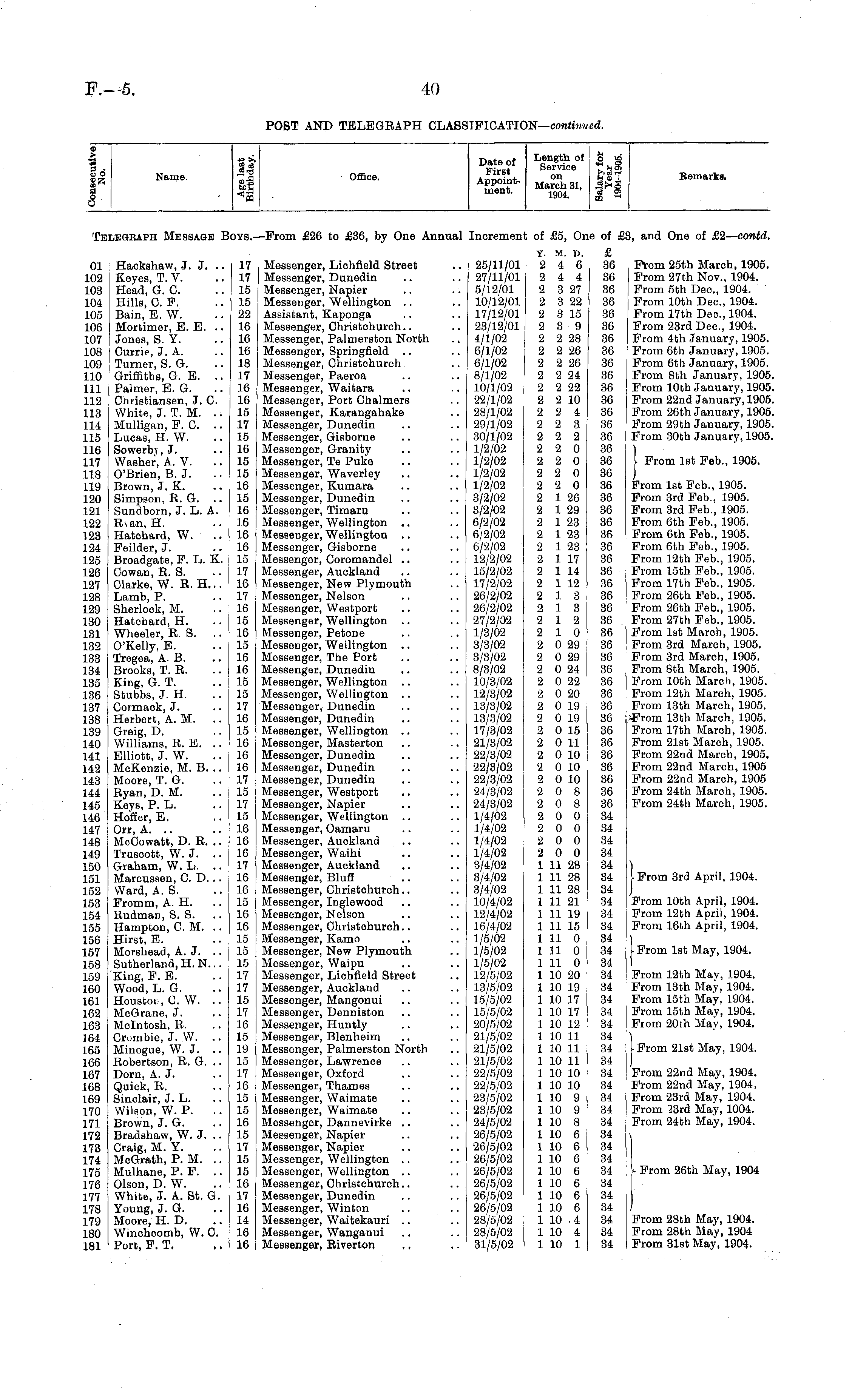 Id g O Name. -a >< 03 ,Q o_ Office. Date of L | n e th of First Servloe ment. lg04 to £ 8 & S3 £&& o3 oo CO rt Remarks. Te: legraph Message Bi >ys.—From £26 to £36, by One Annual Incremen of £5, Om of £1 3, and One of £2— contd. 01 102 103 104 105 106 107 108 109 110 HI 112 113 114 115 116 117 118 119 120 121 122 123 124 125 126 127 128 129 130 131 132 133 134 135 136 137 138 139 140 141 142 143 144 145 146 147 148 149 150 151 152 153 154 155 156 157 158 159 160 161 162 163 164 165 166 167 168 169 170 171 172 173 174 175 176 177 178 179 180 181 Hackshaw, J. J. Keyes, T. V. Head, G. 0. Hills, C F. Bain, E. W. Mortimer, E. E. .. Jones, S. Y. Currie, J. A. Turner, S. G. Griffiths, G. E. Palmer, E. G. Christiansen, J. C. White, J. T. M. .. Mulligan, F. C .. Lucas, H. W. Sowerbv, J. Washer, A. V. O'Brien, B. J. Brown, J. K. Simpson, R. G. Sundborn, J. L. A. Rvan, H. Hatohard, W. Feilder, J. Broadgate, F. L. K. Cowan, R. S. Clarke, W. R. H... Lamb, P. Sherlock, M. Hatchard, H. Wheeler, R. S. O'Kelly, E. Tregea, A. B. Brooks, T. R. King, G. T. Stubbs, J. H. Cormack, J. Herbert, A. M. Greig, D. Williams, R. E. Elliott, J. W. McKenzie, M. B. .. Moore, T. G. Ryan, D. M. Keys, P. L. Hoffer, E. Orr, A. .. McCowatt, D. R. .. Trusoott, W. J. Graham, W. L. Marcussen, CD... Ward, A. S. Fromm, A. H. Rudman, S. S. Hampton, CM. Hirst, E. Morshead, A. J. .. Sutherland, H. N... King, F. E. Wood, L. G. Houston, C W. McGrane, J. Mcintosh, R. Crombie, J. W. .. Minogue, W. J. Robertson, R. G. Dorn, A. J. Quick, R. Sinclair, J. L. Wilson, W. P. Brown, J. G. Bradshaw, W. J. Craig, M. Y. McGrath, P. M. Mulhane, P. F. Olson, D.W. White, J. A. St. G. Young, J. G. Moore, H. D. Winchcomb, W. C Port, F. T. 17 . Messenger, Lichfield Street 17 Messenger, Dunedin 15 Messenger, Napier 15 Messenger, Wellington 22 Assistant, Kaponga 16 Messenger, Christchurch.. 16 Messenger, Palmerston North 16 Messenger, Springfield 18 Messenger, Christchurch 17 Messenger, Paeroa 16 Messenger, Waitara 16 Messenger, Port Chalmers 15 Messenger, Karangahake 17 Messenger, Dunedin 15 Messenger, Gisborne 16 Messenger, Granity 15 Messenger, Te Puke 15 Messenger, Waverley 16 Messenger, Kumara 15 Messenger, Dunedin 16 Messenger, Timaru 16 Messenger, Wellington 16 Messenger, Wellington 16 Messenger, Gisborne 15 Messenger, Coromandel 17 Messenger, Auckland 16 Messenger, New Plymouth 17 Messenger, Nelson 16 Messenger, Westport 15 Messenger, Wellington 16 Messenger, Petone 15 Messenger, Wellington 16 Messenger, The Port 16 Messenger, Dunedin 15 Messenger, Wellington 15 Messenger, Wellington 17 Messenger, Dunedin 16 Messenger, Dunedin 15 Messenger, Wellington 16 Messenger, Masterton 16 Messenger, Dunedin 16 Messenger, Dunedin 17 Messenger, Dunedin 15 Messenger, Westport 17 Messenger, Napier 15 Messenger, Wellington 16 Messenger, Oamaru 16 Messenger, Auckland 16 Messenger, Waihi 17 Messenger, Auckland 16 Messenger, Bluff 16 Messenger, Christchurch.. 15 Messenger, Inglewood 16 Messenger, Nelson 16 Messenger, Christohuroh.. 15 Messenger, Kamo 15 Messenger, New Plymouth 15 Messenger, Waipu 17 Messenger, Lichfield Street 17 Messenger, Auckland 15 Messenger, Mangonui 17 Messenger, Denniston 16 Messenger, Huntly 15 Messenger, Blenheim 19 Messenger, Palmerston North 15 Messenger, Lawrenoe 17 Messenger, Oxford 16 Messenger, Thames 15 Messenger, Waimate 15 Messenger, Waimate 16 Messenger, Dannevirke 15 Messenger, Napier 17 Messenger, Napier 15 Messenger, Wellington 15 Messenger, Wellington 16 Messenger, Christchurch.. 17 Messenger, Dunedin 16 Messenger, Winton 14 Messenger, Waitekauri 16 Messenger, Wanganui 16 Messenger, Riverton 25/11/01 27/11/01 5/12/01 10/12/01 17/12/01 23/12/01 4/1/02 6/1/02 6/1/02 8/1/02 10/1/02 22/1/02 28/1/02 29/1/02 30/1/02 1/2/02 1/2/02 1/2/02 1/2/02 3/2/02 3/2/02 6/2/02 6/2/02 6/2/02 12/2/02 15/2/02 17/2/02 26/2/02 26/2/02 27/2/02 1/3/02 3/3/02 3/3/02 8/3/02 10/3/02 12/3/02 13/3/02 13/3/02 17/3/02 21/3/02 22/3/02 22/3/02 22/3/02 24/3/02 24/3/02 1/4/02 1/4/02 1/4/02 1/4/02 3/4/02 3/4/02 3/4/02 10/4/02 12/4/02 16/4/02 1/5/02 1/5/02 1/5/02 12/5/02 13/5/02 15/5/02 15/5/02 20/5/02 21/5/02 21/5/02 21/5/02 22/5/02 22/5/02 23/5/02 23/5/02 24/5/02 26/5/02 26/5/02 26/5/02 26/5/02 26/5/02 26/5/02 26/5/02 28/5/02 28/5/02 31/5/02 Y. M. D. 2 4 6 2 4 4 2 3 27 2 3 22 2 3 15 2 3 9 2 2 28 2 2 26 2 2 26 2 2 24 2 2 22 2 2 10 2 2 4 2 2 3 2 2 2 2 2 0 2 2 0 2 2 0 2 2 0 2 1 26 2 1 29 2 1 23 2 1 23 2 1 23 2 1 17 2 1 14 2 1 12 2 13 2 1 3 2 12 2 10 2 0 29 2 0 29 2 0 24 2 0 22 2 0 20 2 0 19 2 0 19 2 0 15 2 0 11 2 0 10 2 0 10 2 0 10 2 0 8 2 0 8 2 0 0 2 0 0 2 0 0 2 0 0 1 11 28 1 11 28 1 11 28 1 11 21 1 11 19 1 11 15 1 11 0 1 11 0 1 11 0 1 10 20 1 10 19 1 10 17 1 10 17 1 10 12 1 10 11 1 10 11 1 10 11 1 10 10 1 10 10 1 10 9 1 10 9 1 10 8 1 10 6 1 10 6 1 10 6 1 10 6 1 10 6 1 10 6 1 10 6 1 10 4 1 10 4 1 10 1 £ 36 36 36 36 36 36 36 36 36 36 36 36 36 36 36 36 36 36 36 36 36 36 36 36 36 36 36 36 36 36 36 36 36 36 36 36 36 36 36 36 36 36 36 36 36 34 34 34 34 34 34 34 34 34 34 34 34 34 34 34 34 34 34 34 34 34 34 34 34 34 34 34 34 34 34 34 34 34 34 34 34 From 25th March, 1905. From 27th Nov., 1904. From 5th Dec, 1904. From 10th Dec, 1904. From 17th Dec, 1904. From 23rd Dec, 1904. From 4th January, 1905. From 6th January, 1905. From 6th January, 1905. From 8th January, 1905, From 10th January, 1905, From 22nd January, 1905, From 26th January, 1905, From 29th January, 1905, From 30th January, 1905. [ From 1st Feb., 1905. From 1st Feb., 1905. From 3rd Feb., 1905. From 3rd Feb., 1905. From 6th Feb., 1905. From 6th Feb., 1905. From 6th Feb., 1905. From 12th Feb., 1905. From 15th Feb., 1905. From 17th Feb., 1905. From 26th Feb., 1905. From 26th Feb., 1905. From 27th Feb., 1905. From 1st Maroh, 1905. From 3rd Maroh, 1905. From 3rd March, 1905. From 8th Maroh, 1905. From 10th March, 1905. From 12th Maroh, 1905. From 13th March, 1905. -From 13th March, 1905. From 17th March, 1905. From 21st March, 1905. From 22nd March, 1905. From 22nd Maroh, 1905 From 22nd March, 1905 From 