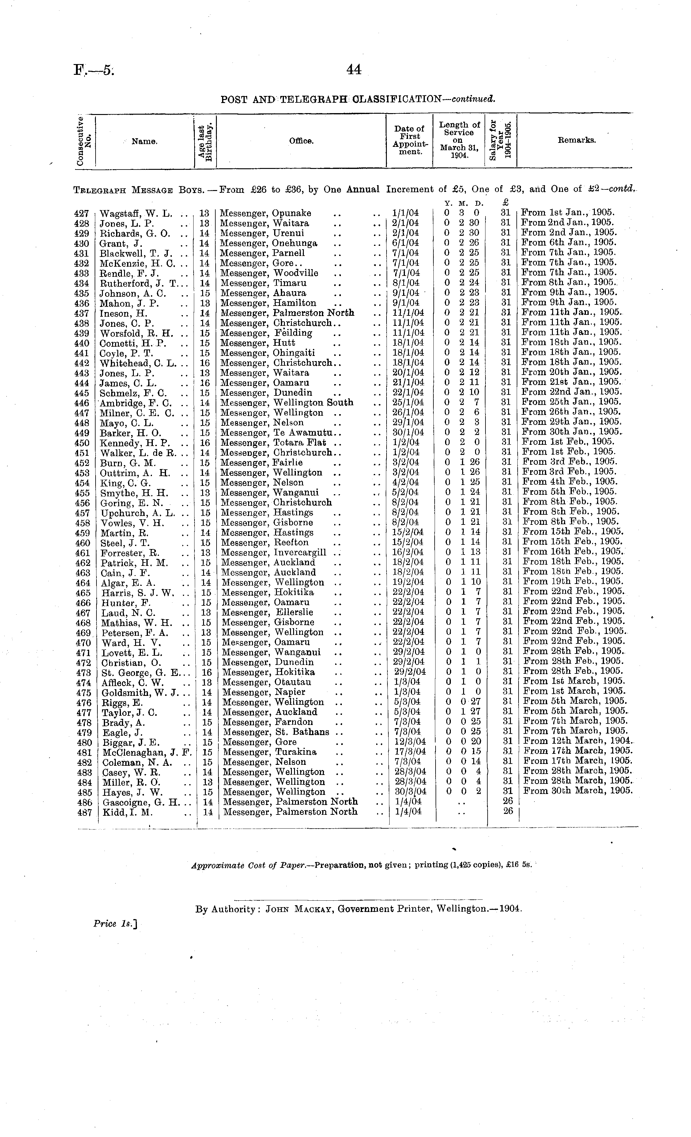 > go 1* a o o Name. at! Office. Date of First Appointment. Length of Service on March 31, 1904. to o !5 ® J. £$toO 03 _ Remarks. Tew igraph Message Bo' p s. — From £26 to £36, by One Annual .ncremen of £5, On. of £: i, and One of £2 — contd. 427 428 429 430 431 432 433 434 435 436 437 438 439 440 441 442 443 444 445 446 447 448 449 450 451 452 453 454 455 456 457 458 459 460 461 462 463 464 465 466 467 468 469 470 471 472 473 474 475 476 477 478 479 480 481 482 483 484 485 486 487 Wagstafi, W. L. Jones, L. P. Richards, G. 0. Grant, J. Blackwell, T. J. McKenzie, H. 0. Rendle, F. J. Rutherford, J. T... Johnson, A. C. Mahon, J. P. Ineson, H. Jones, C. P. Worsfold, R. H. Cometti, H. P. Coyle, P. T. Whitehead, C. L. .. Jones, L. P. James, C. L. Schmelz, F. C. Ambridge, F. C. Milner, C E. 0. Mayo, C.L, Barker, H. 0. Kennedy, H. P. Walker, L. de R. .. Burn, G. M. Outtrim, A. H. King, C. G. Smythe, H. H. Goring, E.N. Upchurch, A. L. Vowles, V. H. Martin, R. Steel, J. T. Forrester, R. Patrick, H. M. .. Cain, J. F. Algar, E. A. Harris, S. J. W. Hunter, F. Laud, N. 0. Mathias, W. H. Petersen, F. A. Ward, H. V. Lovett, E. L. Christian, 0. St. George, G. E... Affleck, C W. Goldsmith, W. J. .. Riggs, E. Taylor, J. C. Brady, A. Eagle, J. Biggar, J. E. McClenaghan, J. F. Coleman, N. A. Casey, W. R. Miller, R. O. Hayes, J. W. Gascoigne, G. H. .. Kidd,I. M. 13 13 14 14 14 14 14 14 15 13 14 14 15 15 15 16 13 16 15 14 15 15 15 16 14 15 14 15 13 15 15 15 14 15 13 15 14 14 15 15 13 15 13 15 15 15 16 13 14 14 14 15 ■ 14 i 15 15 i 15 ! U 13 15 14 1 14 Messenger, Opunake Messenger, Waitara Messenger, Urenui Messenger, Onehunga Messenger, Parnell Messenger, Gore Messenger, Woodville Messenger, Timaru Messenger, Ahaura Messenger, Hamilton Messenger, Palmerston North Messenger, Christchuroh.. Messenger, Feilding Messenger, Hutt Messenger, Ohingaiti Messenger, Christchurch.. Messenger, Waitara Messenger, Oamaru Messenger, Dunedin Messenger, Wellington South Messenger, Wellington Messenger, Nelson Messenger, Te Awamutu.. Messenger, Totara Flat Messenger, Christchurch.. Messenger, Fairlie Messenger, Wellington Messenger, Nelson Messenger, Wanganui Messenger, Christchurch Messenger, Hastings Messenger, Gisborne Messenger, Hastings Messenger, Reefton Messenger, Invercargill Messenger, Auckland Messenger, Auckland Messenger, Wellington Messenger, Hokitika Messenger, Oamaru Messenger, Ellerslie Messenger, Gisborne Messenger, Wellington Messenger, Oamaru Messenger, Wanganui Messenger, Dunedin Messenger, Hokitika Messenger, Otautau Messenger, Napier Messenger, Wellington Messenger, Auckland Messenger, Farndon Messenger, St. Bathans Messenger, Gore Messenger, Turakina Messenger, Nelson Messenger, Wellington Messenger, Wellington Messenger, Wellington Messenger, Palmerston North Messenger, Palmerston North 1/1/04 2/1/04 2/1/04 6/1/04 7/1/04 7/1/04 7/1/04 8/1/04 9/1/04 9/1/04 11/1/04 11/1/04 11/1/04 18/1/04 18/1/04 18/1/04 20/1/04 21/1/04 22/1/04 25/1/04 26/1/04 29/1/04 30/1/04 1/2/04 1/2/04 3/2/04 3/2/04 4/2/04 5/2/04 8/2/04 8/2/04 8/2/04 15/2/04 15/2/04 16/2/04 18/2/04 18/2/04 19/2/04 22/2/04 22/2/04 22/2/04 22/2/04 22/2/04 22/2/04 29/2/04 29/2/04 29/2/04 1/3/04 1/3/04 5/3/04 5/3/04 7/3/04 7/3/04 12/3/04 17/3/04 7/3/04 28/3/04 28/3/04 30/3/04 1/4/04 1/4/04 Y. M. D. 0 3 0 0 2 30 0 2 30 0 2 26 0 2 25 0 2 25 0 2 25 0 2 24 0 2 23 0 2 23 0 2 21 0 2 21 0 2 21 0 2 14 0 2 14 0 2 14 0 2 12 0 2 11 0 2 10 0 2 7 0 2 6 0 2 3 0 2 2 0 2 0 0 2 0 0 1 26 0 1 26 0 1 25 0 1 24 0 1 21 0 1 21 0 1 21 0 1 14 0 1 14 0 1 13 0 1 11 0 1 11 0 1 10 0 17 0 17 0 17 0 17 0 17 0 17 0 10 0 1 1 0 10 0 10 0 10 0 0 27 0 1 27 0 0 25 0 0 25 0 0 20 0 0 15 0 0 14 0 0 4 0 0 4 0 0 2 £ 31 31 31 31 31 31 31 31 31 31 31 31 31 31 31 31 31 31 31 31 31 31 31 31 31 31 31 31 31 31 31 31 31 31 31 31 31 31 31 31 31 31 31 31 31 31 31 31 31 31 31 31 31 31 31 31 31 31 31 26 26 From 1st Jan., 1905. From 2nd Jan.,1905. From 2nd Jan., 1905. From 6th Jan., 1905. From 7th Jan., 1905. From 7th Jan., 1905. From 7th Jan., 1905. From 8th Jan., 1905. From 9th Jan., 1905. From 9th Jan., 1905. From 11th Jan., 1905. From 11th Jan., 1905. From 11th Jan., 1905. From 18th Jan., 1905. From 18th Jan., 1905. From 18th Jan., 1905. From 20th Jan., 1905. From 21st Jan., 1905. From 22nd Jan., 1905. From 25th Jan., 1905. From 26th Jan., 1905. From 29th Jan., 1905. From 30th Jan., 1905. From 1st Feb., 1905. From 1st Feb., 1905. From 3rd Feb., 1905. From 3rd Feb., 1905. From 4th Feb., 1905. From 5th Feb., 1905. From 8th Feb., 1905. From 8chFeb., 1905. From 8th Feb., 1905. From 15th Feb., 1905. From 15th Feb., 1905. From 16th Feb., 1905. From 18th Feb., 1905. From 18th Feb., 1905. From 19th Feb., 1905. From 22nd Feb., 1905. From 22nd Feb., 1905. From 22nd Feb., 1905. From 22nd Feb., 1905. From 22nd Feb,, 1905. From 22nd Feb., 1905. From 28th Feb., 1905. From 28th Feb., 1905. From 28th Feb., 1905. From 1st March, 1905. From 1st March, 1905. From 5th March, 1905. From 5th March, 1905. From 7th March, 1905. From 7th March, 1905. From 12th March, 1904. From 17th March, 1905. From 17th March, 1905. From 28th March, 1905. From 28th Maroh, 1905. From 30th March, 1905.