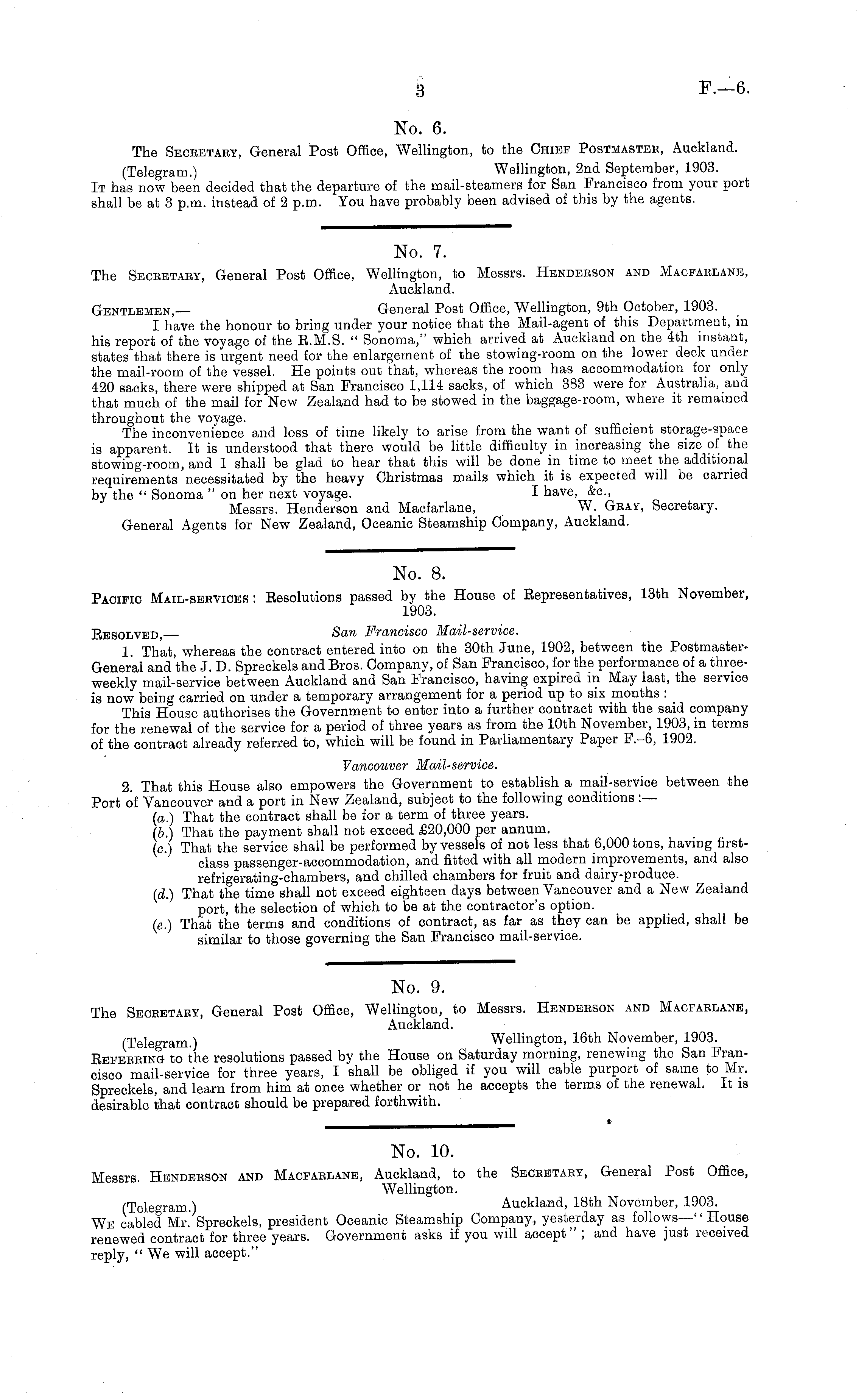 No. 10. Messrs. Hendeeson and Macfaelane, Auckland, to the Seceetaey, General Post Office, Wellington. (Telegram.) Auckland, 18th November, 1903. We cabled Mr.' Spreckels, president Oceanic Steamship Company, yesterday as follows—'' House renewed contract for three years. Government asks if you will accept" ; and have just received reply, " We will accept."