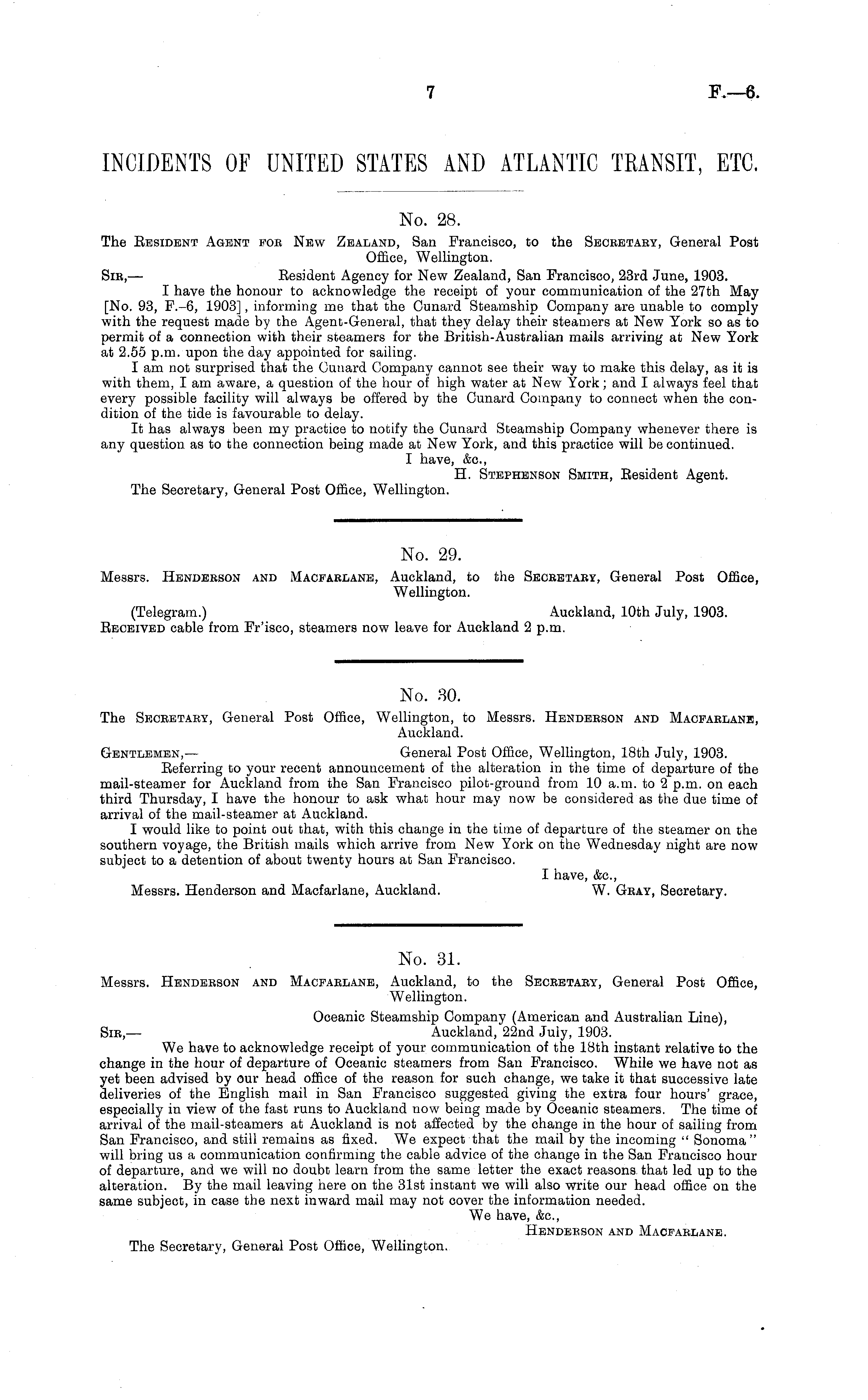 No. 30. The Seceetaey, General Post Office, Wellington, to Messrs. Hendeeson and Macfaelane, Auckland. Gentlemen, — General Post Office, Wellington, 18th July, 1903. Referring to your recent announcement of the alteration in the time of departure of the mail-steamer for Auckland from the San Francisco pilot-ground from 10 a.m. to 2 p.m. on each third Thursday, I have the honour to ask what hour may now be considered as the due time of arrival of the mail-steamer at Auckland. I would like to point out that, with this change in the time of departure of the steamer on the southern voyage, the British mails which arrive from New York on the Wednesday night are now subject to a detention of about twenty hours at San Francisco. I have, &c, Messrs. Henderson and Macfarlane, Auckland. W. Geay, Secretary.