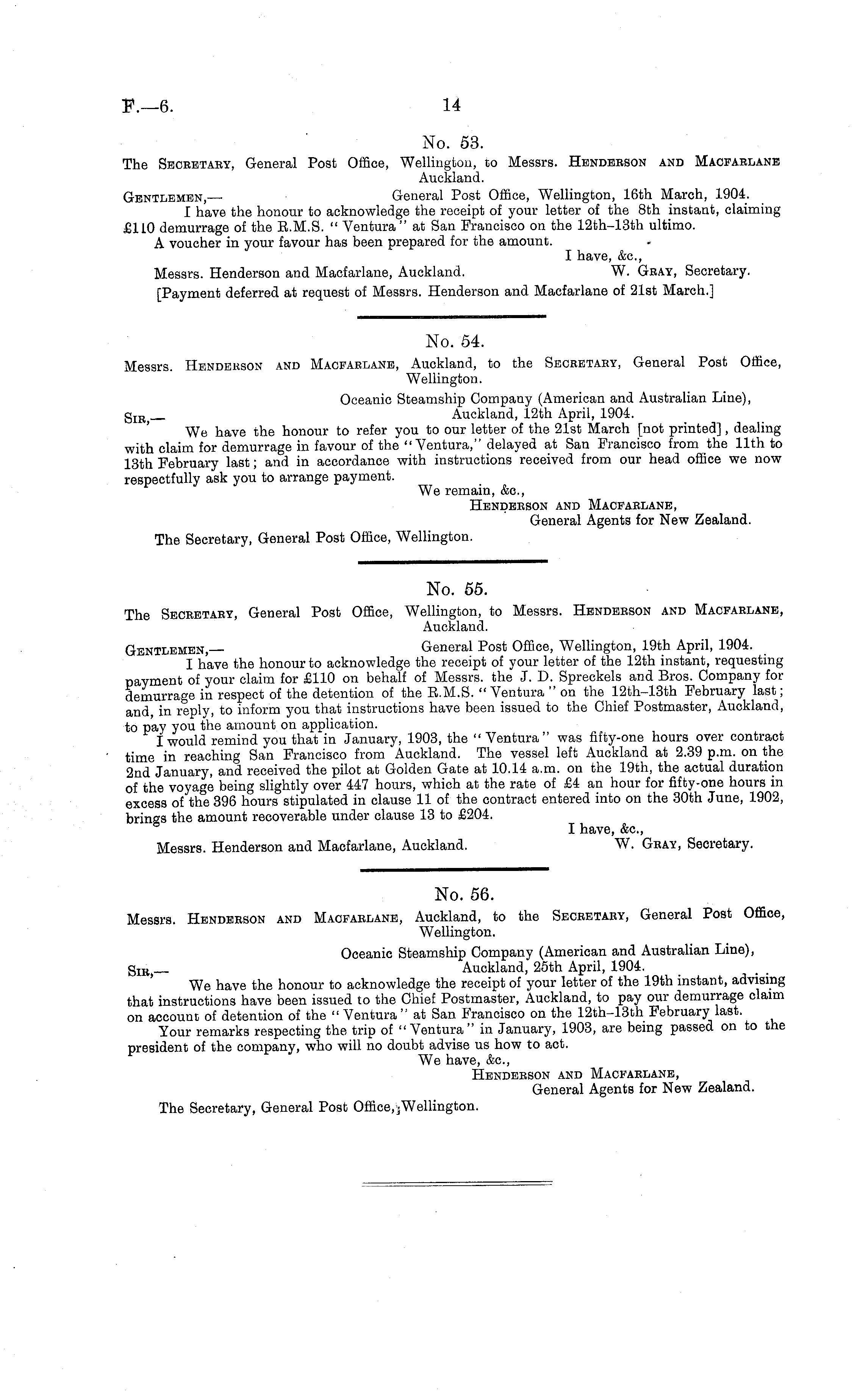 No. 54. Messrs. Hendeeson and Macfaelane, Auckland, to the Seceetaey, General Post Office, Wellington. Oceanic Steamship Company (American and Australian Line), SIX _ Auckland, 12th April, 1904. We have the honour to refer you to our letter of the 21st March [not printed], dealing with claim for demurrage in favour of the "Ventura," delayed at San Francisco from the 11th to 13th February last; and in accordance with instructions received from our head office we now respectfully ask you to arrange payment. We remain, &c, Hendeeson and Macfaelane, General Agents for New Zealand. The Secretary, General Post Office, Wellington.