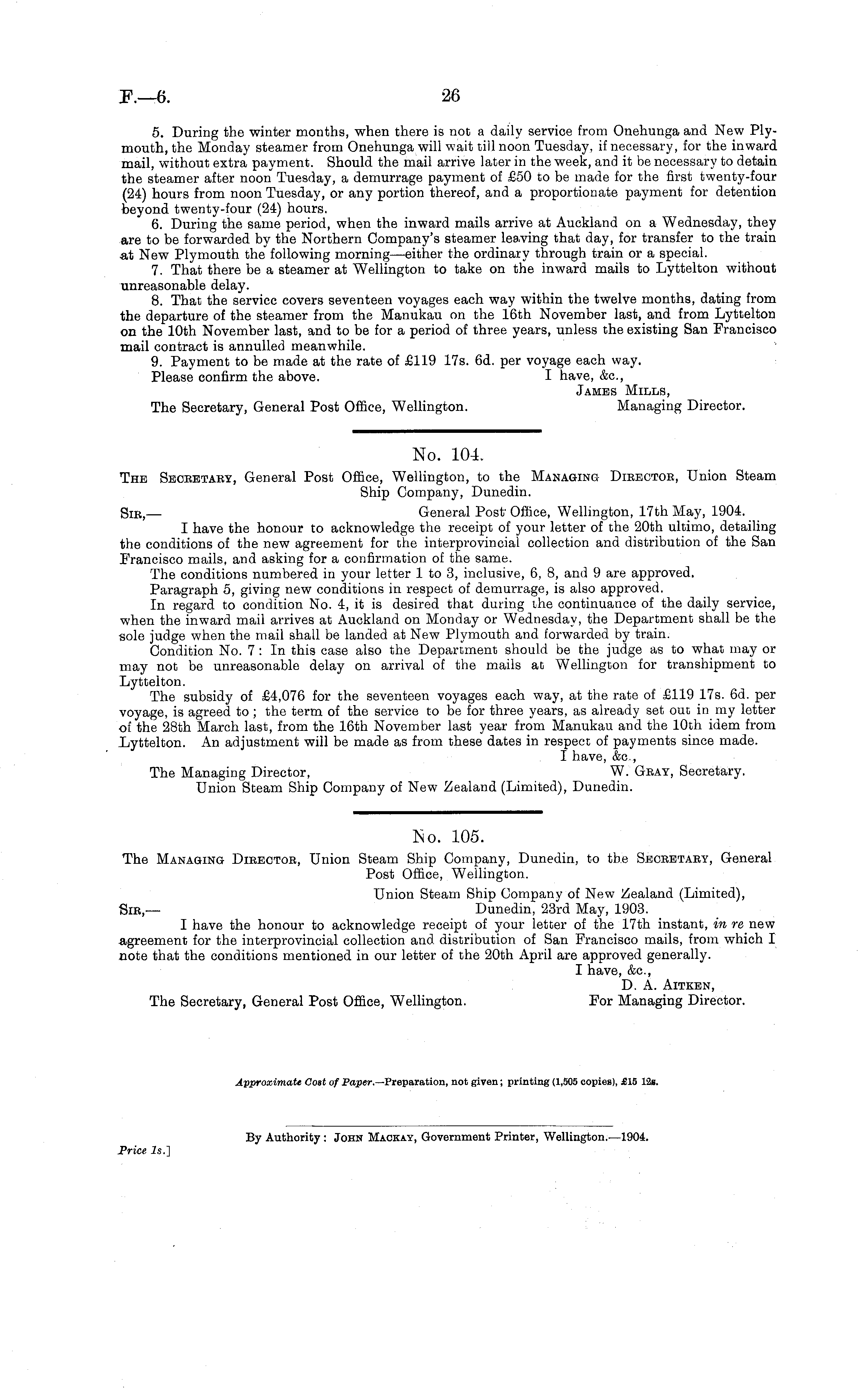 No. 105. The Managing Dieectoe, Union Steam Ship Company, Dunedin, to the Seceetaey, General Post Office, Wellington. Union Steam Ship Company of New Zealand (Limited), Sib— Dunedin, 23rd May, 1903. I have the honour to acknowledge receipt of your letter of the 17th instant, in re new agreement for the interprovincial collection and. distribution of San Francisco mails, from which I note that the conditions mentioned in our letter of the 20th April are approved generally. I have, &c, D. A. Aitken, The Secretary, General Post Office, Wellington. For Managing Director. Approximate Cost of Paper.— Preparation, not given; printing (1,605 copies), £15 12b.