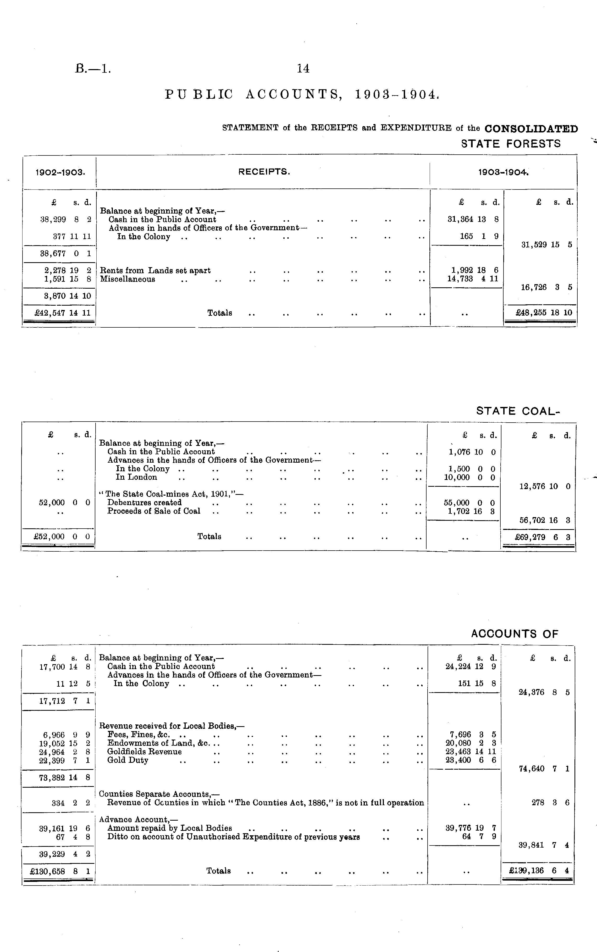 1902-1903. RECEIPTS. 1903-1904. £ s. d. Balance at beginning of Year, — Cash in the Public Account Advances in hands of Officers of the Government — In the Colony £ s. d. 31,364 13 8 £ s. d. 38,299 8 2 377 11 11 165 1 9 31,529 15 5 38,677 0 1 2,278 19 2 1,591 15 8 Rents from Lands set apart Miscellaneous 1,992 18 6 14,733 4 11 16,726 3 5 3,870 14 10 Totals £42,547 14 11 £48,255 18 10 STATE COAL- £ s. d. £ s. d. £ s. d. Balance at beginning of Year, — Cash in the Public Acoount Advances in the hands of Officers of the Government — In the Colony In London 1,076 10 0 1,500 0 0 10,000 0 0 12,576 10 0 52,000 0 0 " The State Coal-mines Act, 1901,"— Debentures created Proceeds of Sale of Coal 55,000 0 0 1,702 16 3 56,702 16 3 Totals £69,279 6 3 £52,000 0 0 ACC UNTS OF £ s. d. 17,700 14 8 Balance at beginning of Year, — Cash in the Public Account Advances in the hands of Officers of the Government— In the Colony £ s. d. 24,224 12 9 £ s. d. 11 12 5 17,712 7 1 151 15 8 24,376 8 5 6,966 9 9 19,052 15 2 24,964 2 8 22,399 7 1 Revenue received for Local Bodies, — Fees, Fines, &c. .. Endowments of Land, &c. .. Goldfields Revenue Gold Duty 7,696 3 5 20,080 2 3 23,463 14 11 23,400 6 6 74,640 7 1 73,382 14 8 Counties Separate Acoounts, — Revenue of Counties in which "The Counties Act, 1886," is not in full operation 334 2 2 278 3 6 39,161 19 6 67 4 8 Advance Account, — Amount repaid by Local Bodies Ditto on account of Unauthorised Expenditure of previous years 39,776 19 7 64 7 9 39,841 7 4 39,229 4 2 Totals £139,136 6 4 £130,658 8 1