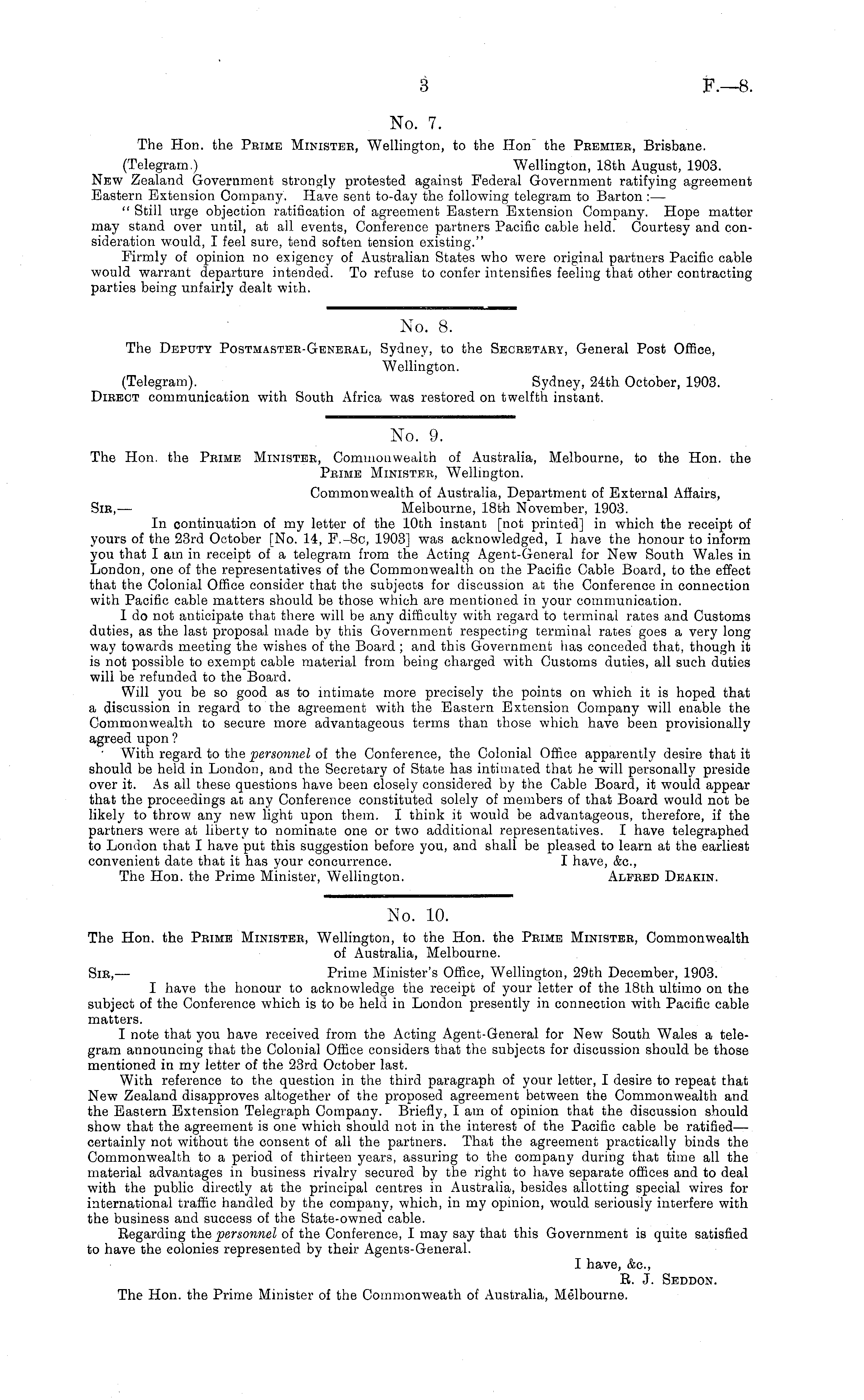 No. 10. The Hon. the Prime Minister, Wellington, to the Hon. the Prime Minister, Commonwealth of Australia, Melbourne. Sir, — Prime Minister's Office, Wellington, 29th December, 1903. I have the honour to acknowledge the receipt of your letter of the 18th ultimo on the subject of the Conference which is to be held in London presently in connection with Pacific cable matters. I note that you have received from the Acting Agent-General for New South Wales a telegram announcing that the Colonial Office considers that the subjects for discussion should be those mentioned in my letter of the 23rd October last. With reference to the question in the third paragraph of your letter, I desire to repeat that New Zealand disapproves altogether of the proposed agreement between the Commonwealth and the Eastern Extension Telegraph Company. Briefly, lam of opinion that the discussion should show that the agreement is one which should not in the interest of the Pacific cable be ratified— certainly not without the consent of all the partners. That the agreement practically binds the Commonwealth to a period of thirteen years, assuring to the company during that time all the material advantages in business rivalry secured by the right to have separate offices and to deal with the public directly at the principal centres in Australia, besides allotting special wires for international traffic handled by the company, which, in my opinion, would seriously interfere with the business and success of the State-owned cable. Regarding the personnel of the Conference, I may say that this Government is quite satisfied to have the colonies represented by their Agents-General. I have, &c, R. J. Seddon. The Hon. the Prime Minister of the Commonweath of Australia, Melbourne.