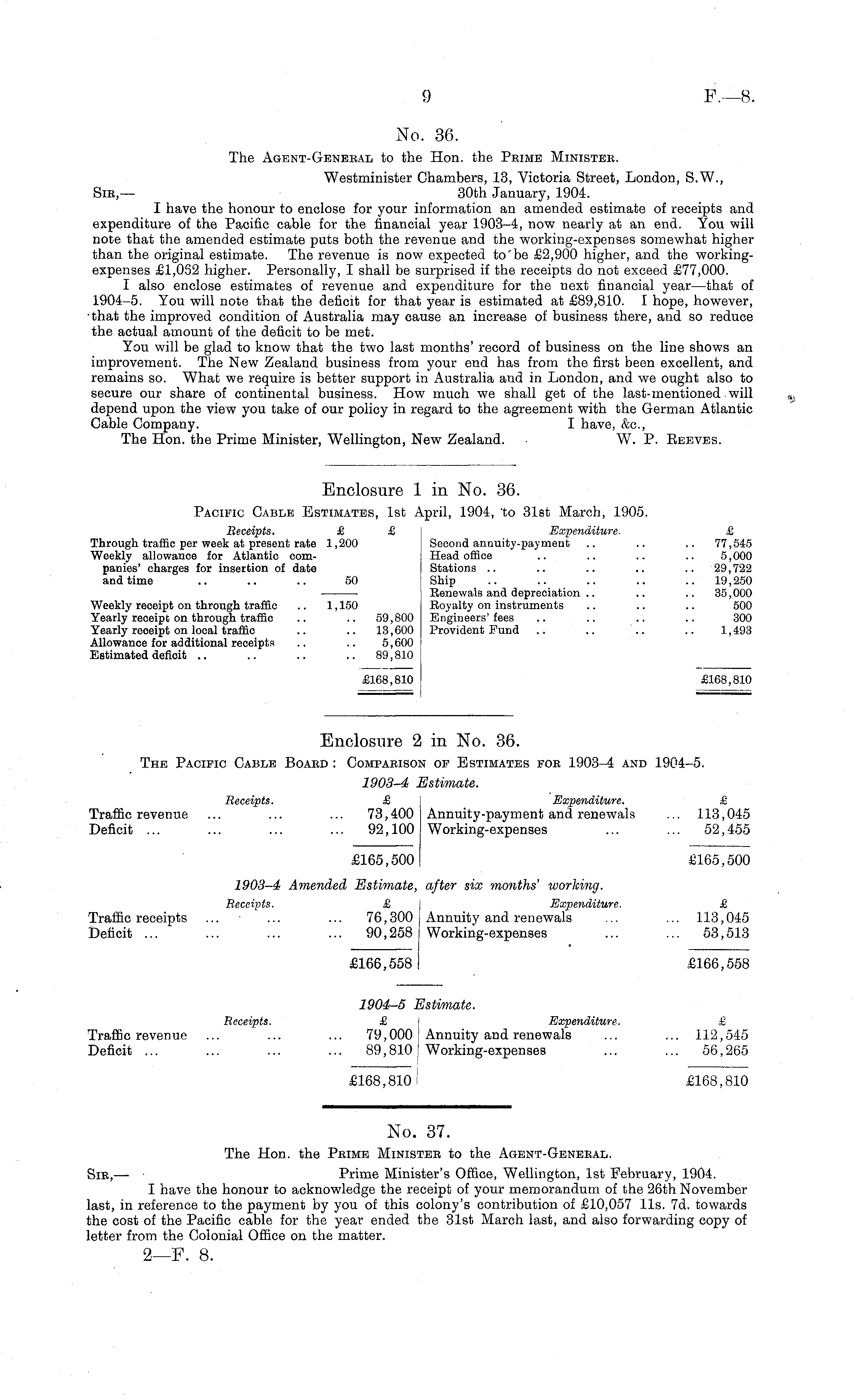No. 36. The Agent-General to the Hon. the Prime Minister. Westminister Chambers, 13, Victoria Street, London, S.W., Sib,— 30th January, 1904. I have the honour to enclose for your information an amended estimate of receipts and expenditure of the Pacific cable for the financial year 1903-4, now nearly at an end. You will note that the amended estimate puts both the revenue and the working-expenses somewhat higher than the original estimate. The revenue is now expected to be £2,900 higher, and the workingexpenses £1,052 higher. Personally, I shall be surprised if the receipts do not exceed £77,000. I also enclose estimates of revenue and expenditure for the next financial year —that of 1904-5. You will note that the deficit for that year is estimated at £89,810. I hope, however, that the improved condition of Australia may cause an increase of business there, and so reduce the actual amount of the deficit to be met. You will be glad to know that the two last months' record of business on the line shows an improvement. The New Zealand business from your end has from the first been excellent, and remains so. What we require is better support in Australia and in London, and we ought also to secure our share of continental business. How much we shall get of the last-mentioned will depend upon the view you take of our policy in regard to the agreement with the German Atlantic Cable Company. I have, &c, The Hon. the Prime Minister, Wellington, New Zealand. • W. P. Reeves.