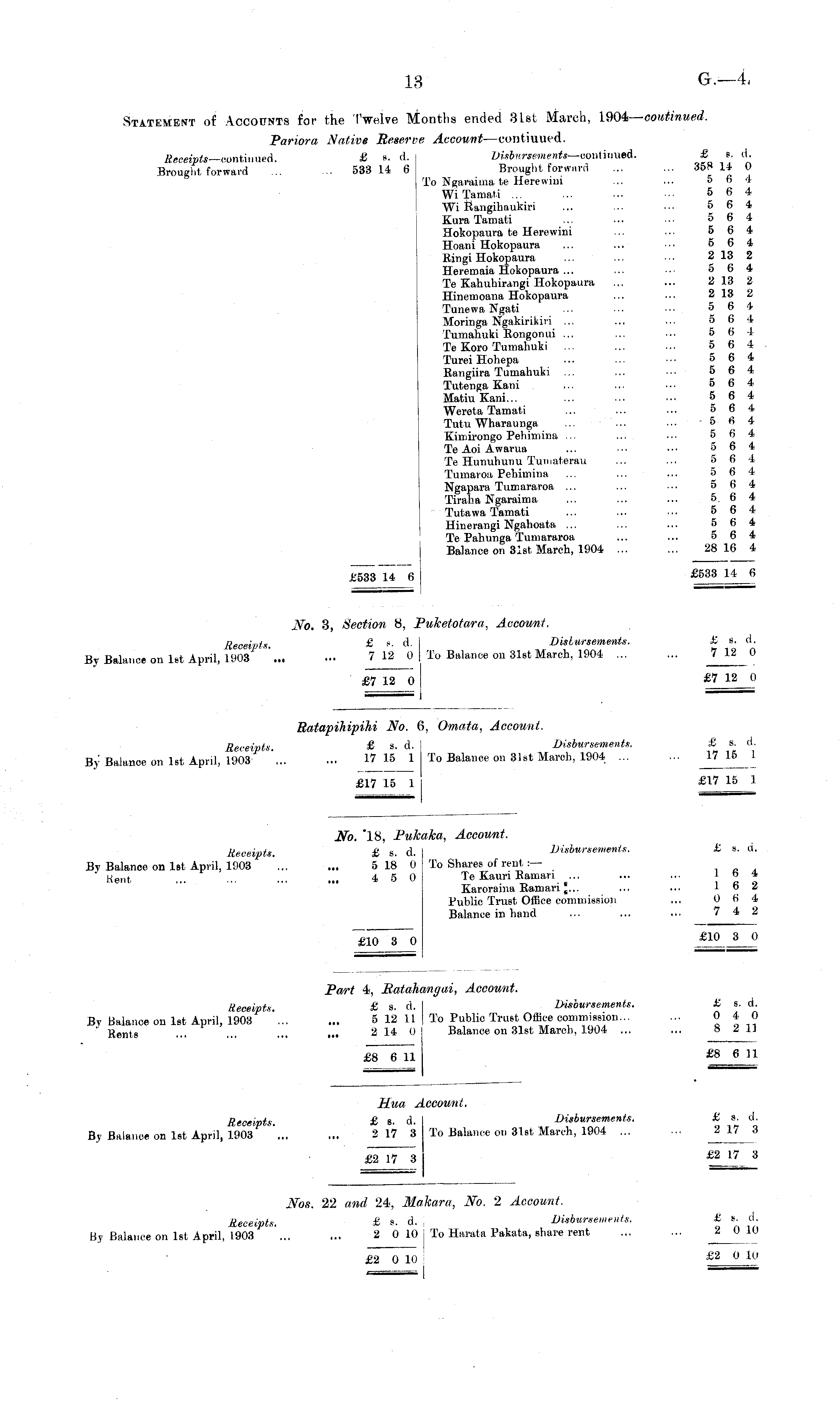 Mua Account. Receipts. £ c. d. Disbursements. £ s. d. By Balance on Ist April, 1903 2173 To Balance on 31st March, 1904 ... ... 217 3 £2 17 3 £2 17 3 Not. 22 and 24, Makara, No. 2 Account. Receipts. £ 8. d. Disbursements. £ s- d. By Balance on Ist April, 1903 ... ... 2010 To Harata Pakata, share rent ... ... 20 10 £2 0 10 £g_ 0 10