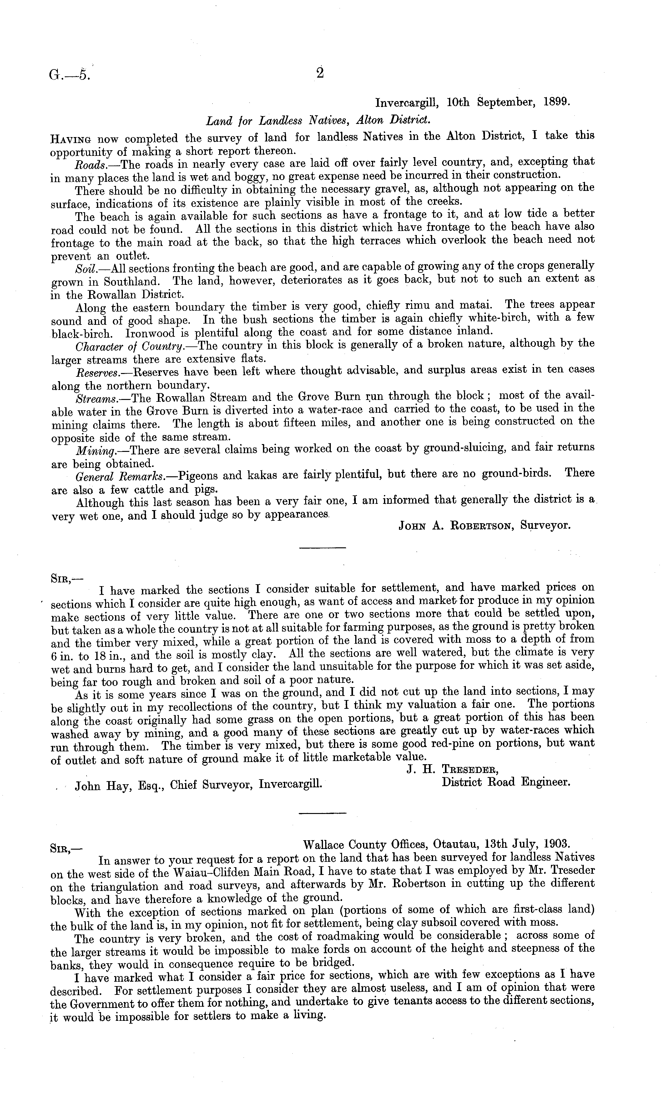 Invercargill, 10th September, 1899. Land for Landless Natives, Alton District. Having now completed the survey of land for landless Natives in the Alton District, I take this opportunity of making a short report thereon. Roads.— The roads in nearly every case are laid off over fairly level country, and, excepting that in many places the land is wet and boggy, no great expense need be incurred in their construction. There should be no difficulty in obtaining the necessary gravel, as, although not appearing on the surface, indications of its existence are plainly visible in most of the creeks. The beach is again available for such sections as have a frontage to it, and at low tide a better road could not be found. All the sections in this district which have frontage to the beach have also frontage to the main road at the back, so that the high terraces which overlook the beach need not prevent an outlet. Soil.— All sections fronting the beach are good, and are capable of growing any of the crops generally grown in Southland. The land, however, deteriorates as it goes back, but not to such an extent as in the Rowallan District. Along the eastern boundary the timber is very good, chiefly rimu and matai. The trees appear sound and of good shape. In the bush sections the timber is again chiefly white-birch, with a few black-birch. Ironwood is plentiful along the coast and for some distance inland. Character of Country.—The country in this block is generally of a broken nature, although by the larger streams there are extensive flats. Reserves.— Reserves have been left where thought advisable, and surplus areas exist in ten cases along the northern boundary. Streams.— The Rowallan Stream and the Grove Burn run through the block; most of the available water in the Grove Burn is diverted into a water-race and carried to the coast, to be used in the mining claims there. The length is about fifteen miles, and another one is being constructed on the opposite side of the same stream. Mining—There are several claims being worked on the coast by ground-sluicing, and fair returns are being obtained. General Remarks.— Pigeons and kakas are fairly plentiful, but there are no ground-birds. I here are also a few cattle and pigs. _ Although this last season has been a very fair one, I am informed that generally the district is a very wet one, and I should judge so by appearances. John A. Robertson, Surveyor.