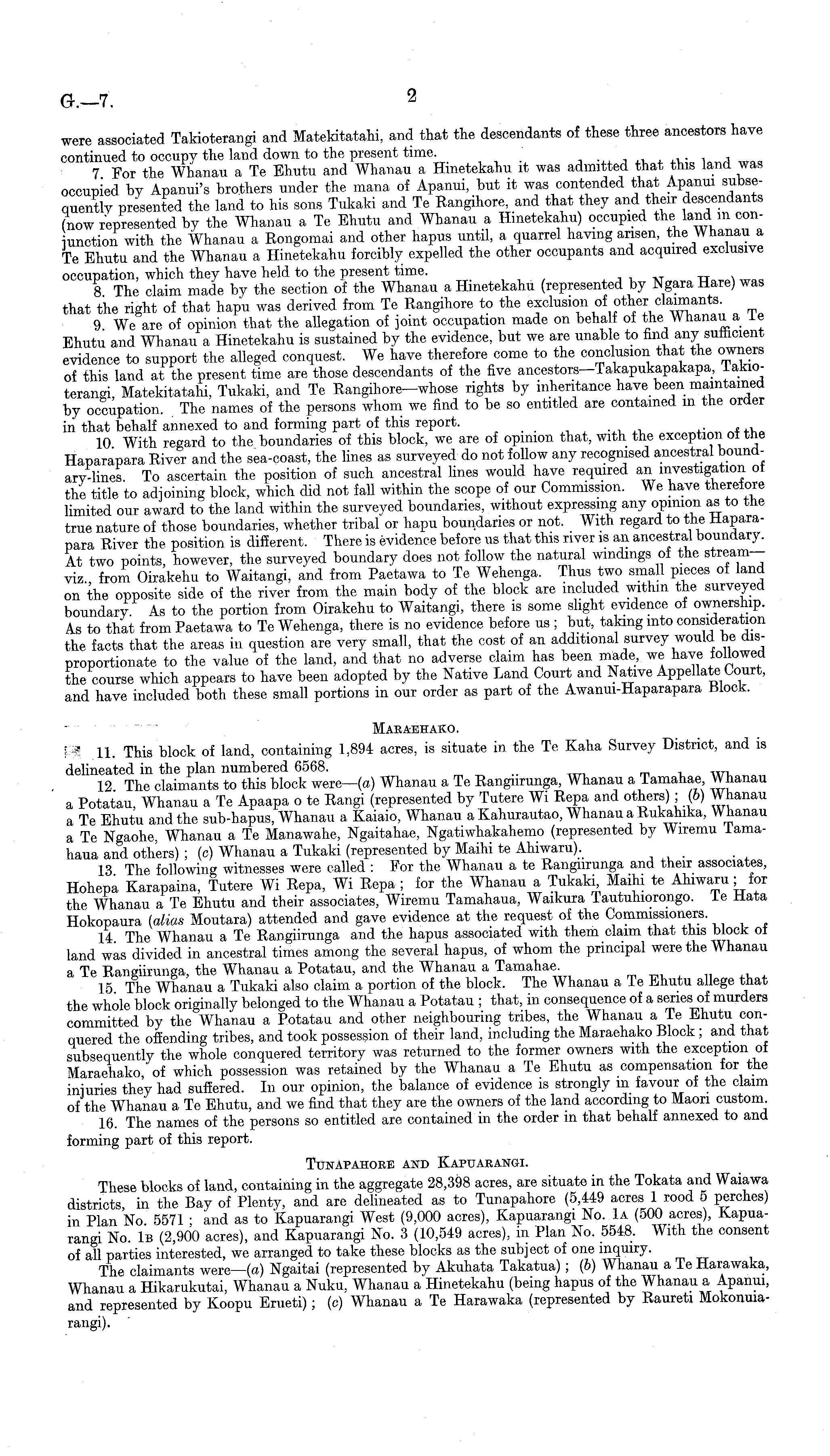 were associated Takioterangi and Matekitatahi, and that the descendants of these three ancestors have continued to occupy the land down to the present time. _ 7 For the Whanau a Te Ehutu and Whanau a Hinetekahu it was admitted that this land was occupied by Apanui's brothers under the mana of Apanui, but it was contended that Apanui subsequently presented the land to his sons Tukaki and Te Rangihore, and that they and their descendants (now represented by the Whanau a Te Ehutu and Whanau a Hinetekahu) occupied the, land in conunction with the Whanau a Rongomai and other hapus until, a quarrel having arisen, the Whanau a Te Ehutu and the Whanau a Hinetekahu forcibly expelled the other occupants and acquired exclusive occupation, which they have held to the present time. 8 The claim made by the section of the Whanau a Hinetekahu (represented by Ngara Hare) was that the right of that hapu was derived from Te Rangihore to the exclusion of other claimants. 9 We are of opinion that the allegation of joint occupation made on behalf of the Whanau a le Ehutu and Whanau a Hinetekahu is sustained by the evidence, but we are unable to find any sufficient evidence to support the alleged conquest. We have therefore come to the conclusion that the owners of this land at the present time are those descendants of the five ancestors—Takapukapakapa, lakioterangi Matekitatahi, Tukaki, and Te Rangihore-whose rights by inheritance have been maintained by occupation. The names of the persons whom we find to be so entitled are contained in the order in that behalf annexed to and forming part of this report. 10 With regard to the boundaries of this block, we are of opinion that, with the exception ol the Haparapara River and the sea-coast, the lines as surveyed do not follow any recognised ancestral bound-ary-lines. To ascertain the position of such ancestral lines would have required an investigation ol the title to adjoining block, which did not fall within the scope of our Commission. We have therefore limited our award to the land within the surveyed boundaries, without expressing any opinion as to the true nature of those boundaries, whether tribal or hapu boundaries or not. With regard to the Haparapara River the position is different. There is evidence before us that this river is an ancestral boundary. At two points, however, the surveyed boundary does not follow the natural windings of the streamviz from Oirakehu to Waitangi, and from Paetawa to Te Wehenga. Thus two small pieces of land on the opposite side of the river from the main body of the block are included within the surveyed boundary As to the portion from Oirakehu to Waitangi, there is some slight evidence of ownership. As to that from Paetawa to Te Wehenga, there is no evidence before us ; but, taking into consideration the facts that the areas in question are very small, that the cost of an additional survey would be disproportionate to the value of the land, and that no adverse claim has been made, we have followed the course which appears to have been adopted by the Native Land Court and Native Appellate Court, and have included both these small portions in our order as part of the Awanui-Haparapara Block. Maraehako. 11. This block of land, containing 1,894 acres, is situate in the Te Kaha Survey District, and is delineated in the plan numbered 6568. 12 The claimants to this block were—(a) Whanau aTe Rangnrunga, Whanau a Tamahae Whanau a Potatau, Whanau a Te Apaapa o te Rangi (represented by Tutere Wi Repa and others) ; (6) Whanau a Te Ehutu and the sub-hapus, Whanau a Kaiaio, Whanau a Kahurautao, Whanau a Rukahika, Whanau a Te Ngaohe, Whanau a Te Manawahe, Ngaitahae, Ngatiwhakahemo (represented by Wiremu lamahaua and others) ; (c Whanau a Tukaki (represented by Maihi te Ahiwaru). _ 13 The following witnesses were called : For the Whanau a te Rangnrunga and their associates, Hohepa Karapaina, Tutere Wi Repa, Wi Repa ; for the Whanau a Maihi te Ahiwaru; for the Whanau aTe Ehutu and their associates, Wiremu Tamahaua, Waikura Tautuhiorongo. le Hata Hokopaura (alias Moutara) attended and gave evidence at the request of the Commissioners. 14 The Whanau a Te Rangiirunga and the hapus associated with them claim that this block ol land was divided in ancestral times among the several hapus, of whom the principal were the Whanau a Te Rangiirunga, the Whanau a Potatau, and the Whanau a Tamahae. 15 The Whanau a Tukaki also claim a portion of the block. The Whanau aTe Ehutu allege that the whole block originally belonged to the Whanau a Potatau ; that, in consequence of a series of murders committed by the Whanau a Potatau and other neighbouring tribes, the Whanau a Te Ehutu conquered the offending tribes, and took possession of their land, including the Maraehako Block ; and that subsequently the whole conquered territory was returned to the former owners with the exception of Maraehako of which possession was retained by the Whanau a Te Ehutu as compensation for the injuries they had suffered. In our opinion, the balance of evidence is strongly in favour of the claim of the Whanau a Te Ehutu, and we find that they are the owners of the land according to Maori custom 16. The names of the persons so entitled are contained in the order in that behalf annexed to and forming part of this report. TunApahore and Kapuarangi. These blocks of land, containing in the aggregate 28,398 acres, are situate in the Tokata and Waiawa districts in the Bay of Plenty, and are delineated as to Tunapahore (5,449 acres 1 rood 5 perches) in Plan No 5571 ; and as to Kapuarangi West (9,000 acres), Kapuarangi No. 1a (500 acres), Kapuarangi No. 1b (2,900 acres), and Kapuarangi No. 3 (10,549 acres), in Plan No. 554.8. With the consent of all parties interested, we arranged to take these blocks as the subject of one inquiry. The claimants were—(a) Ngaitai (represented by Akuhata Takatua) ; (b) Whanau ale Harawaka, Whanau a Hikarukutai, Whanau a Nuku, Whanau a Hinetekahu (be