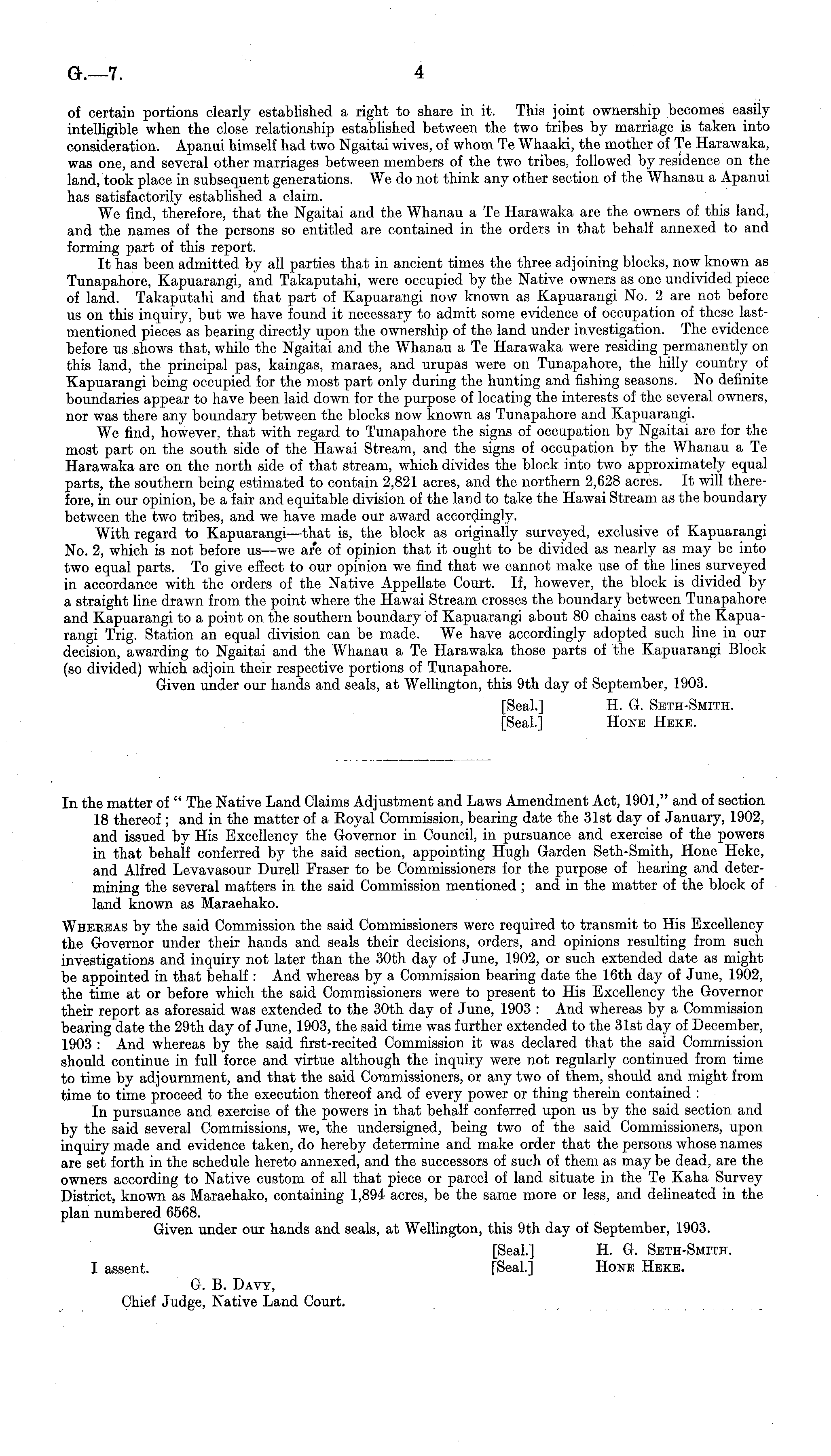 of certain portions clearly established a right to share in it. This joint ownership becomes easily intelligible when the close relationship established between the two tribes by marriage is taken into consideration. Apanui himself had two Ngaitai wives, of whom Te Whaaki, the mother of Te Harawaka, was one, and several other marriages between members of the two tribes, followed by residence on the land, took place in subsequent generations. We do not think any other section of the Whanau a Apanui has satisfactorily established a claim. We find, therefore, that the Ngaitai and the Whanau a Te Harawaka are the owners of this land, and the names of the persons so entitled are contained in the orders in that behalf annexed to and forming part of this report. It has been admitted by all parties that in ancient times the three adjoining blocks, now known as Tunapahore, Kapuarangi, and Takaputahi, were occupied by the Native owners as one undivided piece of land. Takaputahi and that part of Kapuarangi now known as Kapuarangi No. 2 are not before us on this inquiry, but we have found it necessary to admit some evidence of occupation of these lastmentioned pieces as bearing directly upon the ownership of the land under investigation. The evidence before us shows that, while the Ngaitai and the Whanau a Te Harawaka were residing permanently on this land, the principal pas, kaingas, maraes, and urupas were on Tunapahore, the hilly country of Kapuarangi being occupied for the most part only during the hunting and fishing seasons. No definite boundaries appear to have been laid down for the purpose of locating the interests of the several owners, nor was there any boundary between the blocks now known as Tunapahore and Kapuarangi. We find, however, that with regard to Tunapahore the signs of occupation by Ngaitai are for the most part on the south side of the Hawai Stream, and the signs of occupation by the Whanau a Te Harawaka are on the north side of that stream, which divides the block into two approximately equal parts, the southern being estimated to contain 2,821 acres, and the northern 2,628 acres. It will therefore, in our opinion, be a fair and equitable division of the land to take the Hawai Stream as the boundary between the two tribes, and we have made our award accordingly. With regard to Kapuarangi —that is, the block as originally surveyed, exclusive of Kapuarangi No. 2, which is not before vs —we are of opinion that it ought to be divided as nearly as may be into two equal parts. To give effect to our opinion we find that we cannot make use of the lines surveyed in accordance with the orders of the Native Appellate Court. If, however, the block is divided by a straight line drawn from the point where the Hawai Stream crosses the boundary between Tunapahore and Kapuarangi to a point on the southern boundary of Kapuarangi about 80 chains east of the Kapuarangi Trig. Station an equal division can be made. We have accordingly adopted such line in our decision, awarding to Ngaitai and the Whanau a Te Harawaka those parts of the Kapuarangi Block (so divided) which adjoin their respective portions of Tunapahore. Given under our hands and seals, at Wellington, this 9th day of September, 1903. [Seal.] H. G. Seth-Smith. [Seal.] Hone Heke. In the matter of " The Native Land Claims Adjustment and Laws Amendment Act, 1901," and of section 18 thereof ; and in the matter of a Royal Commission, bearing date the 31st day of January, 1902, and issued by His Excellency the Governor in Council, in pursuance and exercise of the powers in that behalf conferred by the said section, appointing Hugh Garden Seth-Smith, Hone Heke, and Alfred Levavasour Durell Fraser to be Commissioners for the purpose of hearing and determining the several matters in the said Commission mentioned ; and in the matter of the block of land known as Maraehako. Whereas by the said Commission the said Commissioners were required to transmit to His Excellency the Governor under their hands and seals their decisions, orders, and opinions resulting from such investigations and inquiry not later than the 30th day of June, 1902, or such extended date as might be appointed in that behalf : And whereas by a Commission bearing date the 16th day of June, 1902, the time at or before which the said Commissioners were to present to His Excellency the Governor their report as aforesaid was extended to the 30th day of June, 1903 : And whereas by a Commission bearing date the 29th day of June, 1903, the said time was further extended to the 31st day of December, 1903 : And whereas by the said first-recited Commission it was declared that the said Commission should continue in full force and virtue although the inquiry were not regularly continued from time to time by adjournment, and that the said Commissioners, or any two of them, should and might from time to time proceed to the execution thereof and of every power or thing therein contained : In pursuance and exercise of the powers in that behalf conferred upon us by the said section and by the said several Commissions, we, the undersigned, being two of the said Commissioners, upon inquiry made and evidence taken, do hereby determine and make order that the persons whose names are set forth in the schedule hereto annexed, and the successors of such of them as may be dead, are the owners according to Native custom of all that piece or parcel of land situate in the Te Kaha Survey District, known as Maraehako, containing 1,894 acres, be the same more or less, and delineated in the plan numbered 6568. Given under our hands and seals, at Wellington, this 9th day of September, 1903. [Seal] H. G. Seth-Smith. I assent. [Seal.] Hone Heke. G. B. Davy, Chief Judge, Native Land Court.