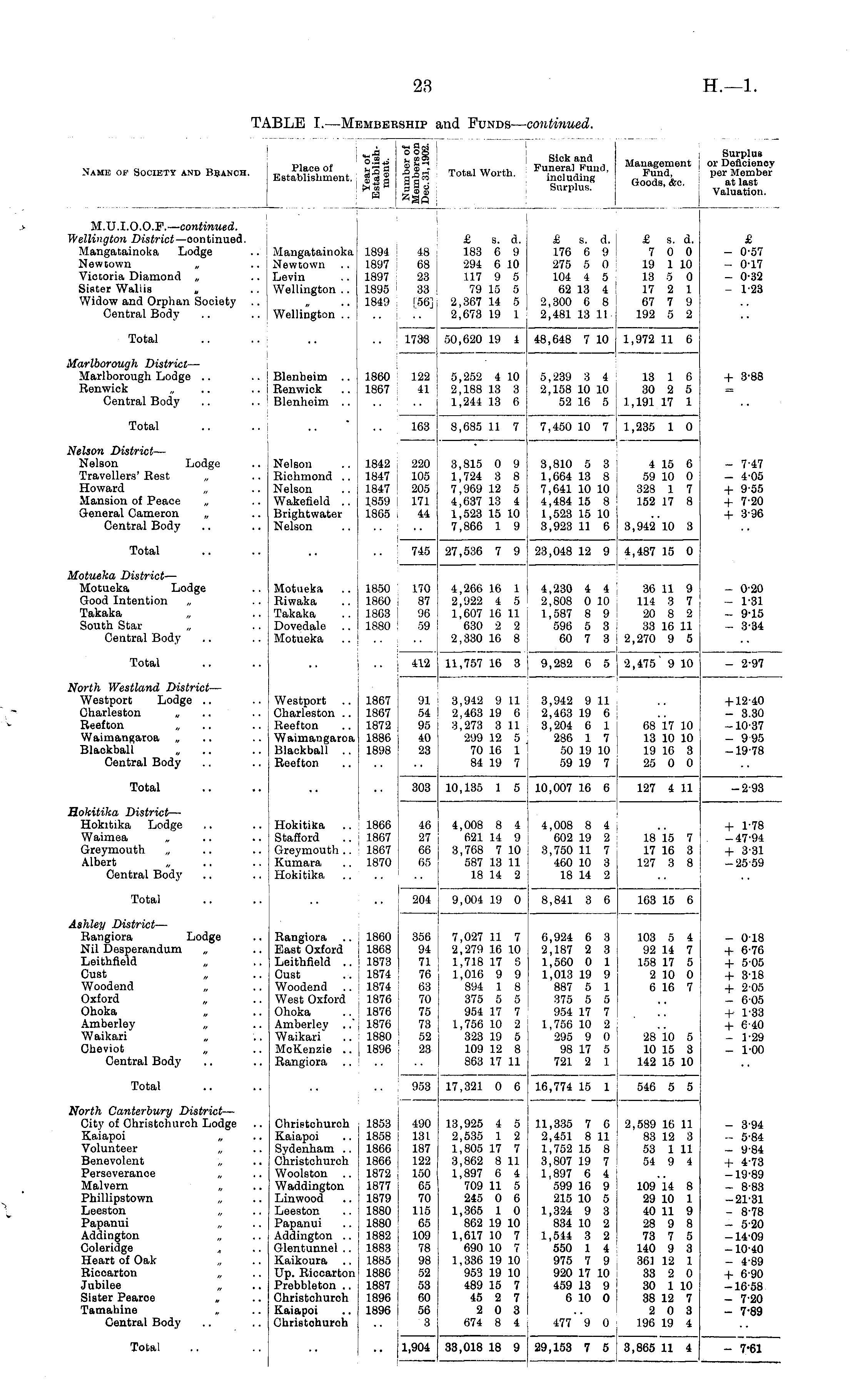 Name op Society and Bbanoh. Place of Z%a |S^ Establishment. , g d 2 g-5S Total Worth. Sick and Funeral Fund, including Surplus. Management Fund, Goods, &C. Surplus or Deficiency per Member at last Valuation. ■ :^q M.U.I.O.O.F.— continued. 'Wellington District— continued. Mangatainoka Lodge New [own „ Victoria Diamond „ Siater Waliis Widow and Orphan Society .. Central Body Mangatainoka I 1894 48 Newtown .. ! 1897 68 Levin .. 1897 23 Wellington .. 1895 33 1894 48 1897 68 1897 23 1895 33 1849 [56] £ s. d. 183 6 9 294 6 10 117 9 5 79 15 5 2,367 14 5 2,673 19 1 £ s. d. 176 6 9 275 6 0 104 4 5 62 13 4 2,300 6 8 2,481 13 11 £ s. d. 7 0 0 19 1 10 13 5 0 17 2 1 67 7 9 192 5 2 £ - 0-57 - 0-17 - 0-32 - 1-23 .. 1849 [56; Wellington .. Total .. 1736 1733 50,620 19 4 48,648 7 10 1,972 11 (i Marlborough Districc — Marlborough Lodge Renwick „ Central Body Blenheim .. 1860 122 Renwick .. 1867 41 Blenheim .. 1860 122 1867 41 + 3-88 5,252 4 10 2,188 13 3 1,244 13 6 5, '239 8 4 2,158 10 10 52 16 5 13 1 6 30 2 5 1,191 17 1 Total IRQ 163 163 8,685 11 7 7,450 10 7 1,235 1 0 Nelson District — Nelson Lodge Travellers' Rest „ Howard Mansion of Peace „ General Cameron „ Central Body Nelson .. 1842 , 220 Richmond .. 1847 | 105 Nelson .. 1847 ' 205 Wakefield .. 1859 171 Brightwater 1865 44 Nelson i 3,815 0 9 1,724 8 8 7,969 12 5 4,637 13 4 1,523 15 10 7,866 1 9 3,810 5 3 1,664 13 8 7,641 10 10 4,484 15 8 1,523 15 10 3,923 11 6 4 15 6 59 10 0 328 1 7 152 17 8 - 7-47 - 4-05 + 9-55 + 7-20 + 396 3,942 10 3 Total ..745 745 27,536 7 9 23,048 12 9 4,487 15 0 Motueka District — Motueka Lodge Good Intention Takaka South Star „ Central Body Motueka .. 1850 170 Riwaka .. 1860 | 87 Takaka .. j 1863 I 96 Dovedale .. i 1880 ! 59 Motueka 170 87 96 59 4,266 16 1 2,922 4 5 1,607 16 11 630 2 2 2,330 16 8 4,230 4 4 2,808 0 10 1,587 8 9 596 5 3 60 7 3 36 11 9 114 8 7 20 8 2 33 16 11 2,270 9 5 - 0-20 - 1-31 - 9-15 - 3-34 Total ..412 412 11,757 16 3 9,282 6 6 2,475' 9 10 - 2-97 North Westland District — Westport Lodge Charleston „ Reef ton „ Waimangaroa „ Blackball Central Body Westport .. 1867 91 Charleston .. 1867 54 Reefton .. 1872 ! 95 Waimangaroa 1886 ; 40 Blackball .. 1898 23 Reefton 91 54 95 40 23 3,942 9 11 2,463 19 6 3,273 3 11 299 12 5 70 16 1 84 19 7 3,942 9 11 2,463 19 6 3,204 6 1 286 1 7 50 19 10 59 19 7 68 17 10 13 10 10 19 16 3 25 0 0 + 12-40 - 3.30 -10-37 - 9 90 -19-78 Total 303 303 10,135 1 5 10,007 16 6 127 4 11 -2-93 Hokitika District — Hokitika Lodge Waimea „ Greymouth „ Albert Central Body Hokitika .. 1866 j 46 Stafford .. 1867 i 27 Greymouth .. 1867 66 Kumara .. 1870 65 Hokitika 46 27 66 65 4,008 8 4 621 14 9 a,768 7 10 587 13 11 18 14 2 4,008 8 4 602 19 2 3,750 11 7 460 10 8 18 14 2 18 15 7 17 16 3 127 3 8 + 1-78 -47-94 + 3-31 -25-59 Total ..204 204 9,004 19 0 8,841 8 6 163 15 6 Ashley District — Rangiora Lodge Nil Desperandum „ Leithfield Cust Woodend „ Oxford Ohoka Amberley Waikari Cheviot „ Central Body Rangiora .. 1860 356 East Oxford '. 1868 94 Leithfield .. 1873 71 Cust .. ! 1874 ' 76 Woodend .. i 1874 63 West Oxford 1876 ! 70 Ohoka .. i 1876 j 75 Amberley ..', 1876 ' 73 Waikari .. 1880 , 52 McKenzie .. j 1896 23 Rangiora .. I 356 94 71 76 63 70 75 73 52 23 7,027 11 7 2,279 16 10 1,718 17 6 1,016 9 9 894 1 8 375 5 5 954 17 7 1,756 10 2 323 19 5 109 12 8 863 17 11 6,924 6 3 2,187 2 3 1,560 0 1 1,013 19 9 887 5 1 375 5 5 954 17 7 1,756 10 2 295 9 0 98 17 5 721 2 1 103 5 4 92 14 7 158 17 5 2 10 0 6 16 7 - 0-18 + 6-76 + 5-05 + 3-18 + 205 - 605 + 1-33 + 6-40 - 1-29 - 1-00 28 10 5 10 15 3 142 15 10 Total ..953 953 17,321 0 6 16,774 15 1 546 5 5 North Canterbury District — City of Christehurch Lodge Kaiapoi „ Volunteer „ Benevolent Perseveranoe Malvern Phillipstown „ Leeston „ Papanui „ Addington Coleridge , Heart of Oak Ricoarton „ Jubilee „ Sister Pearoe „ Tamahine „ Central Body Christehurch , 1853 490 Kaiapoi .. ; 1858 i 131 Sydenham .. ; 1866 | 187 Christehurch ; 1866 | 122 Woolston .. '■ 1872 , 150 Waddington 1877 65 Linwood .. 1879 ! 70 Leeston .. 1880 i 115 Papanui .. 1880 ; 65 Addington .. ' 1882 \ 109 Glentunnel .. ' 1883 ! 78 Kaikoura .. I 1885 ; 98 Up. Ricoarton 1886 52 Prebbleton .. 1887 53 Christehurch ! 1896 60 Kaiapoi .. | 1896 i 56 Christohurch .. 3 490 131 187 122 150 65 70 115 65 109 78 98 52 53 60 56 3 13,925 4 5 2,535 1 2 1,805 17 7 3,862 8 11 1,897 6 4 709 11 5 245 0 6 1,365 1 0 862 19 10 1,617 10 7 690 10 7 1,336 19 10 953 19 10 489 15 7 45 2 7 2 0 3 674 8 4 11,335 7 6 2,451 8 11 1,752 15 8 3,807 19 7 1,897 6 4 599 16 9 215 10 5 1,324 9 3 834 10 2 1,544 8 2 550 1 4 975 7 9 920 17 10 459 13 9 6 10 0 2,589 16 11 83 12 3 53 1 11 54 9 4 109 14 8 29 10 1 40 11 9 28 9 8 73 7 5 140 9 3 361 12 1 33 2 0 30 1 10 38 12 7 2 0 3 196 19 4 - 3-94 - 5-84 - 9-84 + 4-73 -19-89 - 8-83 -21-31 - 8-78 - 5-20 -14-09 -10-40 - 4-89 + 6-90 -16-58 - 7-20 - 7-89 477 9 0 Total .. 1,904 1,904 33,018 18 9 29,153 7 5 3,865 11 4 - 7-61