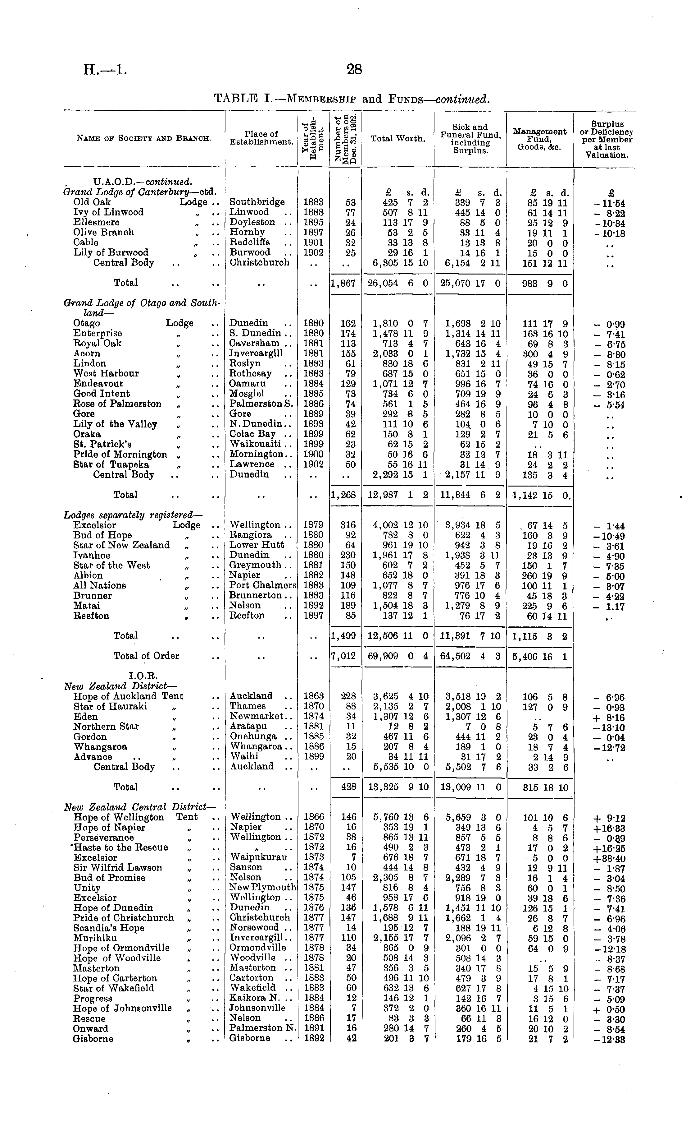 Name of Society and Branch. Place of Establishment. o oo Total Worth. Sick and Funeral Fund, including Surplus. Management Fund, Goods, &o. Surplus or Deficienc per Membei at last Valuation. U.A.O.D.— continued. Grand Lodge of Canterbury —otd. Old Oak Lodge .. Ivy of Linwood „ Ellesmere „ Olive Branch „ Cable „ .. Lily of Burwood „ Central Body Southbridge Linwood Doyleston .. Hornby Redcliffs Burwood Christchuroh 1883 1888 1895 1897 1901 1902 53 77 24 ■26 32 25 £ s. d. 425 7 2 507 8 11 113 17 9 53 2 5 33 13 8 29 16 1 6,305 15 10 £ s. d. 339 7 3 445 14 0 88 5 0 33 11 4 13 13 8 14 16 1 6,154 2 11 £ s. d. 85 19 11 61 14 11 25 12 9 19 11 1 20 0 0 15 0 0 151 12 11 £ -11-54 - 8-22 -10-34 -10-18 Total 1,867 26,054 6 0 25,070 17 0 983 9 0 Orand Lodge of Otago and Southland — Otago Lodge Enterprise Royal Oak Acorn „ Linden „ West Harbour „ Endeavour „ Good Intent Rose of Palmeraton „ Gore Lily of the Valley Oraka St. Patrick's Pride of Mornington „ Star of Tuapeka „ Central Body Dunedin S. Dunedin .. Caversham .. Inveroargill Roslyn Rothesay Oamaru Mosgiel PalmerstonS. Gore N. Dunedin.. Colae Bay .. Waikouaiti .. Mornington.. Lawrence .. Dunedin 1880 1880 1881 1881 1883 1883 1884 1885 1886 1889 1893 1899 1899 1900 1902 162 174 113 155 61 79 129 73 74 39 42 62 23 32 50 1,810 0 7 1,478 11 9 713 4 7 2,033 0 1 880 18 6 687 15 0 1,071 12 7 734 6 0 561 1 5 292 8 5 111 10 6 150 8 1 62 15 2 50 16 6 55 16 11 2,292 15 1 1,698 2 10 1,314 14 11 643 16 4 1,732 15 4 831 2 11 651 15 0 996 16 7 709 19 9 464 16 9 282 8 5 104 0 6 129 2 7 62 15 2 32 12 7 31 14 9 2,157 11 9 111 17 9 163 16 10 69 8 3 300 4 9 49 15 7 36 0 0 74 16 0 24 6 3 96 i 8 10 0 0 7 10 0 21 5 6 - 0-99 - 7-41 - 6-75 - 8-80 - 815 - 0-62 - 2-70 - 316 - 554 18 3 11 24 2 2 135 3 4 Total 1,268 12,987 1 2 11,844 6 2 1,142 15 0. Lodges separately registered — Excelsior Lodge Bud of Hope „ Star of New Zealand Ivanhoe „ Star of the West Albion „ All Nations „ Brunner Matai „ Reefton . Wellington .. Rangiora Lower Hutt Dunedin Greymouth .. Napier Port Chalmers Brunnerton.. Nelson Reefton 1879 1880 1880 1880 1881 1882 1883 1883 1892 1897 316 92 64 230 150 148 109 116 189 85 4,002 12 10 782 8 0 961 19 10 1,961 17 8 602 7 2 652 18 0 1,077 8 7 822 8 7 1,504 18 3 137 12 1 3,934 18 5 622 4 3 942 3 8 1,938 3 11 452 5 7 391 18 3 976 17 6 776 10 4 1,279 8 9 76 17 2 , 67 14 5 160 3 9 19 16 2 23 13 9 150 1 7 260 19 9 100 11 1 45 18 3 225 9 6 60 14 11 - 1-44 -10-49 - 361 - 4-90 - 7-35 - 500 - 307 - 4-22 - 1.17 Total 1,499 12,506 11 0 11,391 7 10 1,115 3 2 Total of Order 7,012 69,909 0 4 64,502 4 3 5,406 16 1 i.q.R. New Zealand District — Hope of Auckland Tent Star of Hauraki „ Eden Northern Star Gordon Whangaroa Advance .. „ Central Body Auckland .. Thames Newmarket.. Aratapu Onehunga .. Whangaroa .. Waihi Auckland 1863 1870 1874 1881 1885 1886 1899 228 88 34 11 32 15 20 3,625 4 10 2,135 2 7 1,307 12 6 12 8 2 467 11 6 207 8 4 34 11 11 5,535 10 0 3,518 19 2 2,008 1 10 1,307 12 6 7 0 8 444 11 2 189 1 0 31 17 2 5,502 7 6 106 5 8 127 0 9 5 7 6 23 0 4 18 7 4 2 14 9 33 2 6 - 696 - 093 + 8-16 -1310 - 004 -12-72 Total 428 13,325 9 10 13,009 11 0 315 18 10 New Zealand Central District — Hope of Wellington Tent Hope of Napier „ Perseverance „ "Haste to the Rescue „ Excelsior „ Sir Wilfrid Lawson „ Bud of Promise Unity Excelsior ., Hope of Dunedin „ Pride of Christchurch „ Seandia's Hope „ Murihiku Hope of Ormondville „ Hope of Woodville „ Masterton „ Hope of Carterton „ Star of WakeBeld Progress Hope of Johnsonville „ Rescue ,, Onward „ Gisborne . Wellington .. Napier Wellington .. Waipukurau Sanson Nelson New Plymouth Wellington .. Dunedin .. j Christchurch Norsewood .. Invercargill.. Ormondville Woodville .. Masterton .. Oarterton Wakofield .. Kaikora N. .. Johnsonville Nelson Palmerston N. Gisborne 1866 1870 1872 1872 1873 1874 1874 1875 1875 1876 1877 1877 1877 1878 1878 1881 1883 1883 1884 1884 1886 1891 1892 146 16 38 16 7 10 105 147 46 136 147 14 110 34 20 47 50 60 12 7 17 16 42 5,760 13 6 353 19 1 865 13 11 490 2 3 676 18 7 444 14 8 2,305 8 7 816 8 4 958 17 6 1,578 6 11 1,688 9 11 195 12 7 2,155 17 7 365 0 9 508 14 3 356 3 5 496 11 10 632 13 6 146 12 1 372 2 0 83 3 3 280 14 7 201 3 7 5,659 3 0 349 13 6 857 5 5 473 2 1 671 18 7 432 4 9 2,289 7 3 756 8 3 918 19 0 1,451 11 10 1,662 1 4 188 19 11 2,096 2 7 301 0 0 508 14 3 340 17 8 479 3 9 627 17 8 142 16 7 360 16 11 66 11 3 260 4 5 179 16 5 101 10 6 4 5 7 8 8 6 17 0 2 5 0 0 12 9 11 16 1 4 60 0 1 39 18 6 126 15 1 26 8 7 6 12 8 59 15 0 64 0 9 + 9-12 + 16-33 - 0-39 + 16-25 + 38-40 - 1-87 - 304 - 8-50 - 7-36 - 7-41 - 6-96 - 4-06 - 3-78 -12-18 - 8-37 - 8-68 - 7-17 - 7-37 - 5-09 + 0-50 - 3-30 - 8-54 -12-33 15 5 9 17 8 1 4 15 10 3 15 6 11 5 1 16 12 0 20 10 2 21 7 2