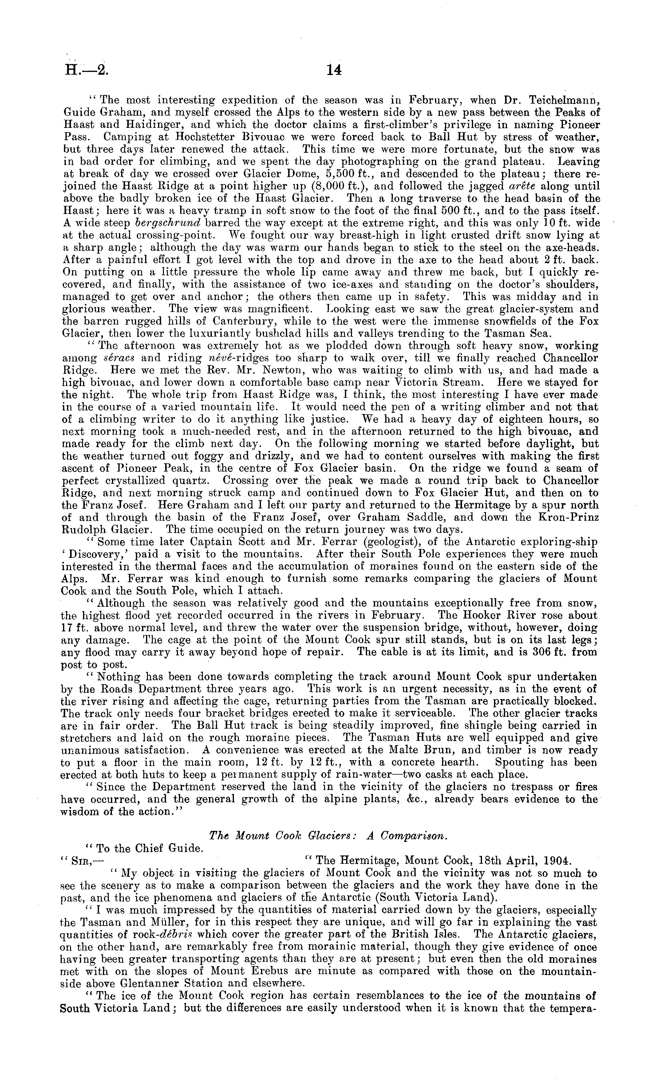 " The most interesting expedition of the season was in February, when Dr. Teichelmann, Guide Graham, and myself crossed the Alps to the western side by a new pass between the Peaks of Haast and Haidinger, and which the doctor claims a first-climber's privilege in naming Pioneer Pass. Camping at Hochstetter Bivouac we were forced back to Ball Hut by stress of weather, but three days later renewed the attack. This time we were more fortunate, but the snow was in bad order for climbing, and we spent the day photographing on the grand plateau. Leaving at break of day we crossed over Glacier Dome, 5,500 ft., and descended to the plateau; there rejoined the Haast Ridge at a point higher up (8,000 ft.), and followed the jagged arete along until above the badly broken ice of the Haast Glacier. Then a long traverse to the head basin of the Haast; here it was a heavy tramp in soft snow to the foot of the final 500 ft., and to the pass itself. A wide steep bergschrund barred the way except at the extreme right, and this was only 10 ft. wide at the actual crossing-point. We fought our way breast-high in light crusted drift snow lying at a sharp angle; although the day was warm our hands began to stick to the steel on the axe-heads. After a painful effort I got level with the top and drove in the axe to the head about 2 ft. back. On putting on a little pressure the whole lip came away and threw me back, but I quickly recovered, and finally, with the assistance of two ice-axes and standing on the doctor's shoulders, managed to get over and anchor; the others then came up in safety. This was midday and in glorious weather. The view was magnificent. Looking east we saw the great glacier-system and the barren rugged hills of Canterbury, while to the west were the immense snowfields of the Fox Glacier, then lower the luxuriantly bushclad hills and valleys trending to the Tasman Sea. " The afternoon was extremely hot as we plodded down through soft heavy snow, working among seracs and riding reeve-ridges too sharp to walk over, till we finally reached Chancellor Ridge. Here we met the Rev. Mr. Newton, who was waiting to climb with us, and had made a high bivouac, and lower down a comfortable base camp near Victoria Stream. Here we stayed for the night. The whole trip from Haast Ridge was, I think, the most interesting I have ever made in the course of a varied mountain life. It would need the pen of a writing climber and not that of a climbing writer to do it anything like justice. We had a heavy day of eighteen hours, so next morning took a much-needed rest, and in the afternoon returned to the high bivouac, and made ready for the climb next day. On the following morning we started before daylight, but the weather turned out foggy and drizzly, and we had to content ourselves with making the first ascent of Pioneer Peak, in the centre of Fox Glacier basin. On the ridge we found a seam of perfect crystallized quartz. Crossing over the peak we made a round trip back to Chancellor Ridge, and next morning struck camp and continued down to Fox Glacier Hut, and then on to the Franz Josef. Here Graham and I left our party and returned to the Hermitage by a spur north of and through the basin of the Franz Josef, over Graham Saddle, and down the Kron-Prinz Rudolph Glacier. The time occupied on the return journey was two days. " Some time later Captain Scott and Mr. Ferrar (geologist), of the Antarctic exploring-ship 'Discovery,' paid a visit to the mountains. After their South Pole experiences they were much interested in the thermal faces and the accumulation of moraines found on the eastern side of the Alps. Mr. Ferrar was kind enough to furnish some remarks comparing the glaciers of Mount Cook and the South Pole, which I attach. " Although the season was relatively good and the mountains exceptionally free from snow, the highest flood yet recorded occurred in the rivers in February. The Hooker River rose about 17 ft. above normal level, and threw the water over the suspension bridge, without, however, doing any damage. The cage at the point of the Mount Cook spur still stands, but is on its last legs; any flood may carry it away beyond hope of repair. The cable is at its limit, and is 306 ft. from post to post. " Nothing has been done towards completing the track around Mount Cook spur undertaken by the Roads Department three years ago. This work is an urgent necessity, as in the event of the river rising and affecting the cage, returning parties from the Tasman are practically blocked. The track only needs four bracket bridges erected to make it serviceable. The other glacier tracks are in fair order. The Ball Hut track is being steadily improved, fine shingle being carried in stretchers and laid on the rough moraine pieces. The Tasman Huts are well equipped and give unanimous satisfaction. A convenience was erected at the Malte Brun, and timber is now ready to put a floor in the main room, 12 ft. by 12 ft., with a concrete hearth. Spouting has been erected at both huts to keep a permanent supply of rain-water —two casks at each place. " Since the Department reserved the land in the vicinity of the glaciers no trespass or fires have occurred, and the general growth of the alpine plants, &c, already bears evidence to the wisdom of the action." The Mount Cook Glaciers: A Comparison. " To the Chief Guide. " Sir,— " The Hermitage, Mount Cook, 18th April, 1904. " My object in visiting the glaciers of Mount Cook and the vicinity was not so much to see the scenery as to make a comparison between the glaciers and the work they have done in the past, and the ice phenomena and glaciers of tne Antarctic (South Victoria Land). " I was much impressed by the quantities of material carried down by the glaciers, especially the Tasman and Muller, for in this respect they are unique, and will go far in explaining the vast quantities of rock-debris which cover the greater part of the British Isles. The Antarctic glaciers, on 
