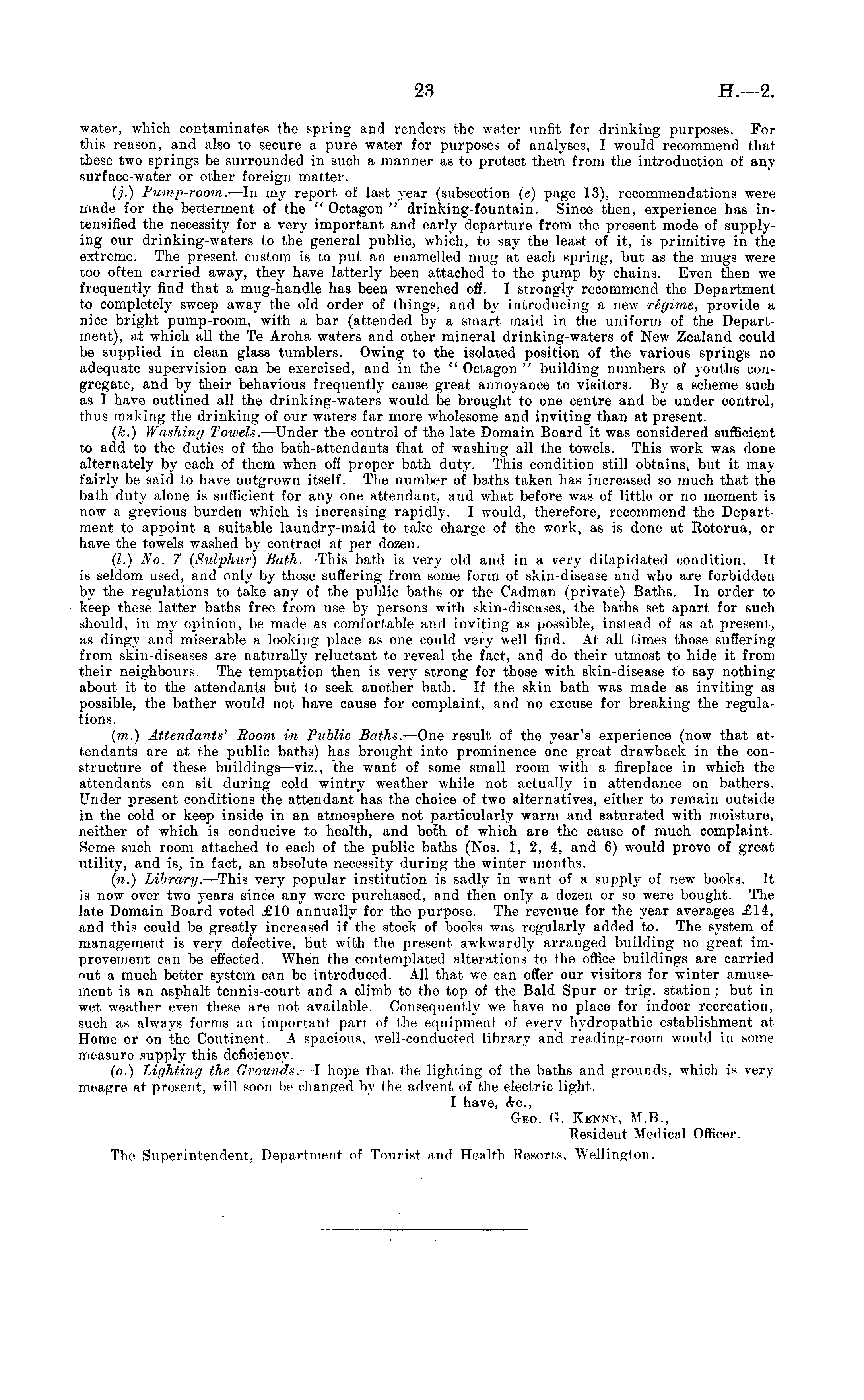 water, which contaminates the spring and renders the water unfit for drinking purposes. For this reason, and also to secure a pure water for purposes of analyses, I would recommend that these two springs be surrounded in such a manner as to protect them from the introduction of any surface-water or other foreign matter. (j.) Fump-room. —ln my report of last year (subsection (c) page 13), recommendations were made for the betterment of the " Octagon " drinking-fountain. Since then, experience has intensified the necessity for a very important and early departure from the present mode of supplying our drinking-waters to the general public, which, to say the least of it, is primitive in the extreme. The present custom is to put an enamelled mug at each spring, but as the mugs were too often carried away, they have latterly been attached to the pump by chains. Even then we frequently find that a mug-handle has been wrenched off. I strongly recommend the Department to completely sweep away the old order of things, and by introducing a new regime, provide a nice bright pump-room, with a bar (attended by a smart maid in the uniform of the Department), at which all the Te Aroha waters and other mineral drinking-waters of New Zealand could be supplied in clean glass tumblers. Owing to the isolated position of the various springs no adequate supervision can be exercised, and in the " Octagon " building numbers of youths congregate, and by their behavious frequently cause great annoyance to visitors. By a scheme such as I have outlined all the drinking-waters would be brought to one centre and be under control, thus making the drinking of our waters far more wholesome and inviting than at present. (k.) Washing Towels. —Under the control of the late Domain Board it was considered sufficient to add to the duties of the bath-attendants that of washing all the towels. This work was done alternately by each of them when off proper bath duty. This condition still obtains, but it may fairly be said to have outgrown itself. The number of baths taken has increased so much that the bath duty alone is sufficient for any one attendant, and what before was of little or no moment is now a grevious burden which is increasing rapidly. I would, therefore, recommend the Department to appoint a suitable laundry-maid to take charge of the work, as is done at Rotorua, or have the towels washed by contract at per dozen. (I.) No. 7 (Sulphur) Bath. —This bath is very old and in a very dilapidated condition. It is seldom used, and only by those suffering from some form of skin-disease and who are forbidden by the regulations to take any of the public baths or the Cadman (private) Baths. In order to keep these latter baths free from use by persons with skin-diseases, the baths set apart for such should, in my opinion, be made as comfortable and inviting as possible, instead of as at present, as dingy and miserable a looking place as one could very well find. At all times those suffering from skin-diseases are naturally reluctant to reveal the fact, and do their utmost to hide it from their neighbours. The temptation then is very strong for those with skin-disease to say nothing about it to the attendants but to seek another bath. If the skin bath was made as inviting as possible, the bather would not have cause for complaint, and no excuse for breaking the regulations. (m.) Attendants' Room in Public Baths. —One result of the year's experience (now that attendants are at the public baths) has brought into prominence one great drawback in the constructure of these buildings —viz., the want of some small room with a fireplace in which the attendants can sit during cold wintry weather while not actually in attendance on bathers. Under present conditions the attendant has the choice of two alternatives, either to remain outside in the cold or keep inside in an atmosphere not particularly warm and saturated with moisture, neither of which is conducive to health, and both of which are the cause of much complaint. Seme such room attached to each of the public baths (Nos. 1, 2, 4, and 6) would prove of great utility, and is, in fact, an absolute necessity during the winter months. (n.) Library. —This very popular institution is sadly in want of a supply of new books. It is now over two years since any were purchased, and then only a dozen or so were bought. The late Domain Board voted £10 annually for the purpose. The revenue for the year averages £14, and this could be greatly increased if the stock of books was regularly added to. The system of management is very defective, but with the present awkwardly arranged building no great improvement can be effected. When the contemplated alterations to the office buildings are carried out a much better system can be introduced. All that we can offer our visitors for winter amusement is an asphalt tennis-court and a climb to the top of the Bald Spur or trig, station ; but in wet weather even these are not available. Consequently we have no place for indoor recreation, such as always forms an important part of the equipment of every hydropathic establishment at Home or on the Continent. A spacious, well-conducted library and reading-room would in some measure supply this deficiency. (o.) Lighting the Grounds. —l hope that the lighting of the baths and grounds, which is very meagre at present, will soon be changed by the advent of the electric light. I have, &c, Ttko. Gγ. Kknny, M.8., Resident Medical Officer. The Superintendent, Department nf Tourist and Health Resorts, Wellington.