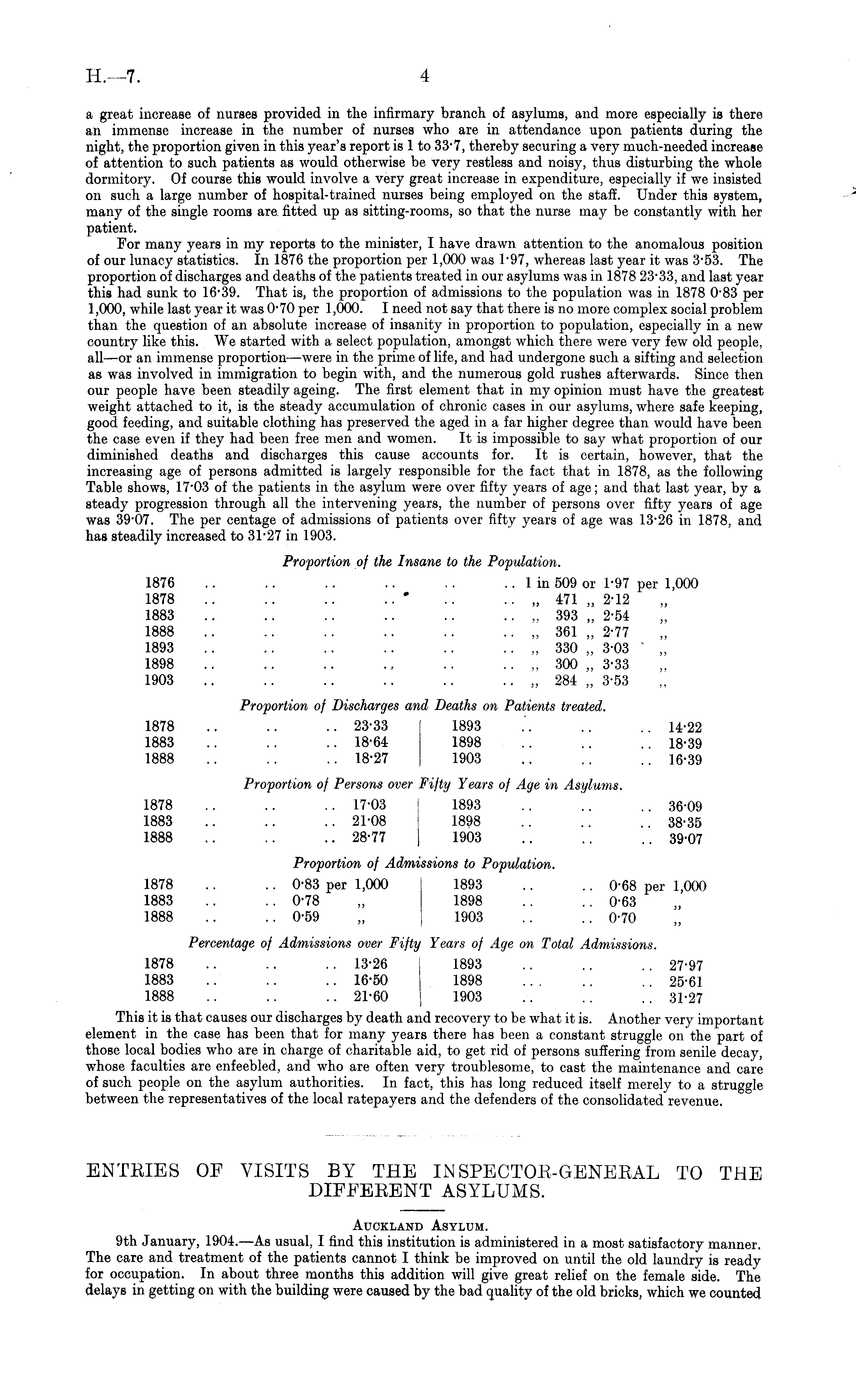 ENTRIES OF VISITS BY THE INSPECTOR-GENERAL TO THE DIFFERENT ASYLUMS. Auckland Asylum. 9th January, 1904.—As usual, I find this institution is administered in a most satisfactory manner. The care and treatment of the patients cannot I think be improved on until the old laundry is ready for occupation. In about three months this addition will give great relief on the female side. The delays in getting on with the building were caused by the bad quality of the old bricks, which we counted
