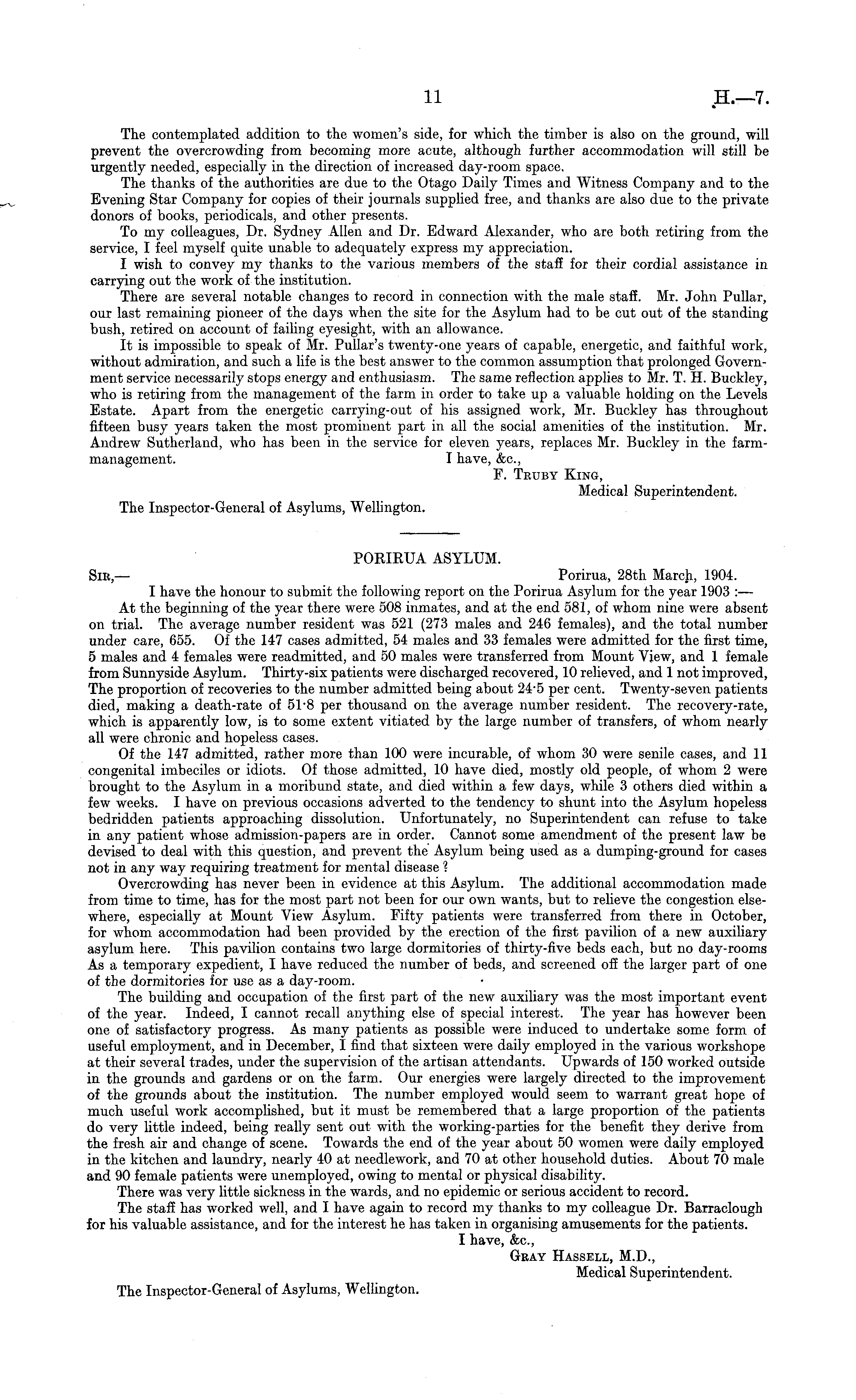 The contemplated addition to the women's side, for which the timber is also on the ground, will prevent the overcrowding from becoming more acute, although further accommodation will still be urgently needed, especially in the direction of increased day-room space. The thanks of the authorities are due to the Otago Daily Times and Witness Company and to the Evening Star Company for copies of their journals supplied free, and thanks are also due to the private donors of books, periodicals, and other presents. To my colleagues, Dr. Sydney Allen and Dr. Edward Alexander, who are both retiring from the service, I feel myself quite unable to adequately express my appreciation. I wish to convey my thanks to the various members of the staff for their cordial assistance in carrying out the work of the institution. There are several notable changes to record in connection with the male staff. Mr. John Pullar, our last remaining pioneer of the days when the site for the Asylum had to be cut out of the standing bush, retired on account of failing eyesight, with an allowance. It is impossible to speak of Mr. Pullar's twenty-one years of capable, energetic, and faithful work, without admiration, and such a life is the best answer to the common assumption that prolonged Government service necessarily stops energy and enthusiasm. The same reflection applies to Mr. T. H. Buckley, who is retiring from the management of the farm in order to take up a valuable holding on the Levels Estate. Apart from the energetic carrying-out of his assigned work, Mr. Buckley has throughout fifteen busy years taken the most prominent part in all the social amenities of the institution. Mr. Andrew Sutherland, who has been in the service for eleven years, replaces Mr. Buckley in the farmmanagement. I have, &c, F. Teuby King, Medical Superintendent. The Inspector-General of Asylums, Wellington.