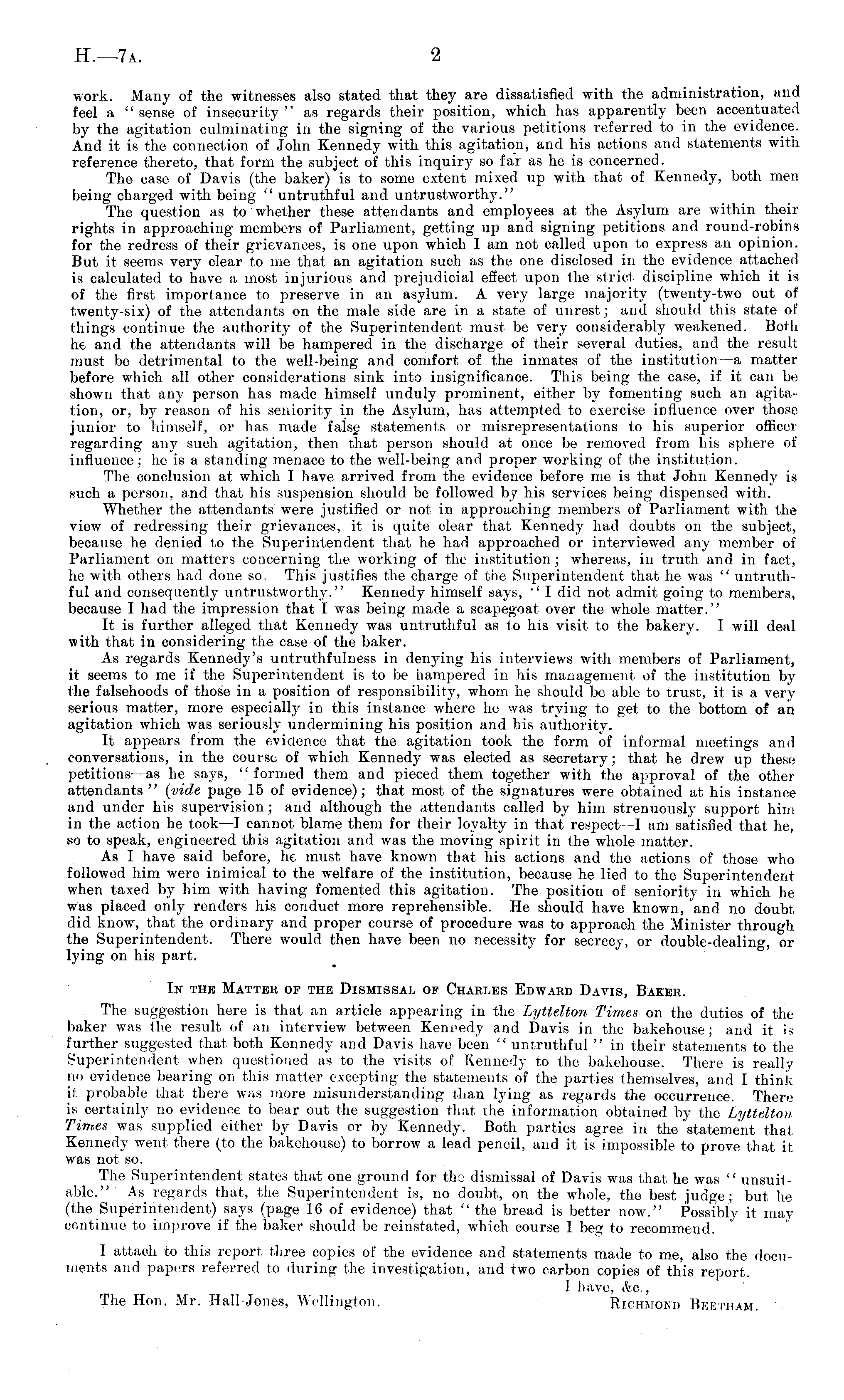 work. Many of the witnesses also stated that they are dissatisfied with the administration, and feel a "sense of insecurity" as regards their position, which has apparently been accentuated by the agitation culminating in the signing of the various petitions referred to in the evidence, xlnd it is the connection of John Kennedy with this agitation, and his actions and statements with reference thereto, that form the subject of this inquiry so far as he is concerned. The case of Davis (the baker) is to some extent mixed up with that of Kennedy, both men being charged with being " untruthful and untrustworthy." The question as to whether these attendants and employees at the Asylum are within their rights in approaching members of Parliament, getting up and signing petitions and round-robins for the redress of their grievances, is one upon which I am not called upon to express an opinion. But it seems very clear to me that an agitation such as the one disclosed in the evidence attached is calculated to have a most injurious and prejudicial effect upon the strict discipline which it is of the first importance to preserve in an asylum. A very large majority (twenty-two out of twenty-six) of the attendants on the male side are in a state of unrest; and should this state of things continue the authority of the Superintendent must be very considerably weakened. Bolli he and the attendants will be hampered in the discharge of their several duties, and the result must be detrimental to the well-being and comfort of the inmates of the institution —a matter before which all other considerations sink into insignificance. This being the case, if it can be shown that any person has made himself unduly prominent, either by fomenting such an agitation, or, by reason of his seniority in the Asylum, has attempted to exercise influence over those junior to himself, or has made false statements or misrepresentations to his superior officer regarding any such agitation, then that person should at once be removed from his sphere of influence; he is a standing menace to the well-being and proper working of the institution. The conclusion at which I have arrived from the evidence before me is that John Kennedy is such a person, and that his suspension should be followed by his services being dispensed with. Whether the attendants were justified or not, in approaching members of Parliament with the view of redressing their grievances, it is quite clear that Kennedy had doubts on the subject, because he denied to the Superintendent that he had approached or interviewed any member of Parliament on matters concerning the working of the institution ; whereas, in truth and in fact, he with others had done so. This justifies the charge of the Superintendent that he was " untruthful and consequently untrustworthy." Kennedy himself says, " I did not admit going to members, because I had the impression that I was being made a scapegoat over the whole matter." It is further alleged that Kennedy was untruthful as to his visit to the bakery. I will deal with that in considering the case of the baker. As regards Kennedy's untruthfulness in denying his interviews with members of Parliament, it seems to me if the Superintendent is to be hampered in his management of the institution by the falsehoods of those in a position of responsibility, whom he should be able to trust, it is a very serious matter, more especially in this instance where he was trying to get to the bottom of an agitation which was seriously undermining his position and his authority. It appears from the evidence that the agitation took the form of informal meetings and conversations, in the course of which Kennedy was elected as secretary ; that he drew up these petitions —as he says, " formed them and pieced them together with the approval of the other attendants " (vide page 15 of evidence); that most of the signatures were obtained at his instance and under his supervision; and although the attendants called by him strenuously support him in the action he took —I cannot blame them for their loyalty in that respect —I am satisfied that he, so to speak, engineered this agitation and was the moving spirit in the whole matter. As I have said before, he must have known that his actions and the actions of those who followed him were inimical to the welfare of the institution, because he lied to the Superintendent when taxed by him with having fomented this agitation. The position of seniority in which he was placed only renders his conduct more reprehensible. He should have known, "and no doubt did know, that the ordinary and proper course of procedure was to approach the Minister through the Superintendent. There would then have been no necessity for secrecy, or double-dealing, or lying on his part. In the Matter op the Dismissal of Charles Edward Davis, Baker. The suggestion here is that an article appearing in the Lyttelton Times on the duties of the baker was the result of an interview between Kennedy and Davis in the bakehouse; and it is further suggested that both Kennedy and Davis have been " untruthful " in their statements to the Superintendent when questioned as to the visits of Kennedy to the bakehouse. There is really no evidence bearing on this matter excepting the statements of the parties themselves, and I think ii probable that there was more misunderstanding than lying as regards the occurrence. There is certainly no evidence to bear out the suggestion that the information obtained by the Lyttelton Times was supplied either by Davis or by Kennedy. Both parties agree in the statement that Kennedy went there (to the bakehouse) to borrow a lead pencil, and it is impossible to prove that il was not so. The Superintendent states that one ground for the dismissal of Davis was that he was " unsuitable." As regards that, the Superintendent is, no doubt, on the whole, the best judge; but he (the Superintendent) says (page 16 of evidence) that "t
