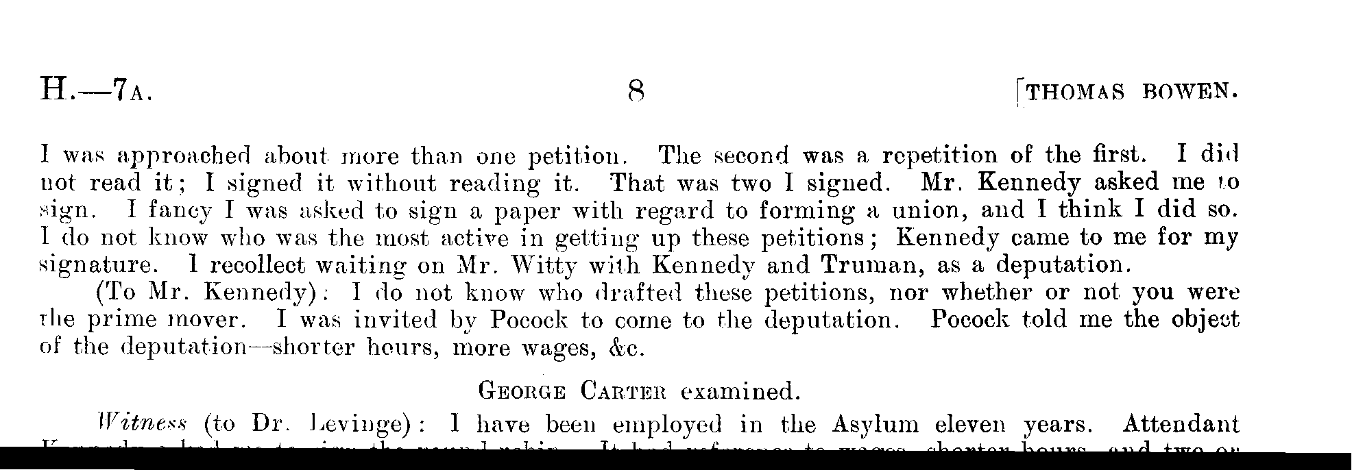 I was approached about more than one petition. The second was a repetition of the first. I did not read it; I signed it without reading it. That was two I signed. Mr. Kennedy asked me to sign. I fancy I was asked to sign a paper with regard to forming a union, and I think I did so. I do not know who was the most active in getting up these petitions; Kennedy came to me for my signature. 1 recollect waiting on Mr. Witty with Kennedy and Truman, as a deputation. (To Mr. Kennedy): Ido not know who drafted these petitions, nor whether or not you were the prime mover. I was invited by Pocock to come to the deputation. Pocock told me the object of the deputation —shorter hours, more wages, &c. George Carter examined. Witness (to Dr. Levinge) : I have been employed in the Asylum eleven years. Attendant