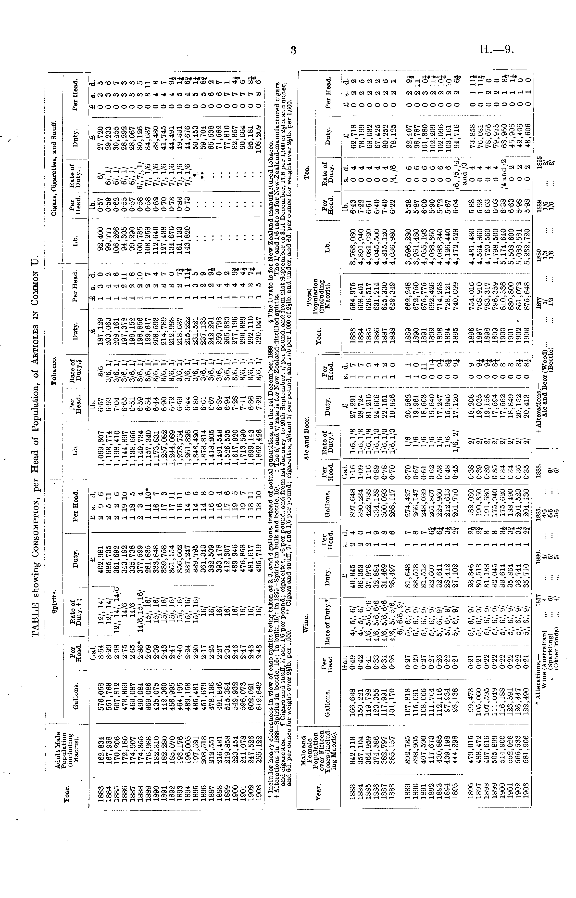 Spirits. Tobacco. Cigars, Cigarettes, and Snuff. Adult Male ear. (including Maoris). Per Head. , Bate of Duty, t : ! Duty. Per Head. Lb. Per Head. Eate ol Duty.§ Duty. Per Head. Lb. Per Head. Eate ol Duty.il ! Duty. Per Head. Gallons. 1883 1884 1885 1886 1887 1888 1889 1890 1891 1892 1893 1894 1895 1896 1897 1898 1899 1900 1901 1902 1903 162,834 167,938 170,206 172,180 174,907 174,355 176,988 182,310 182,280 185,070 193,176 396,005 197,521 208,518 212,551 216,431 219,858 223,454 241,078 247,526 255,122 576,058 551,763 507,812 473,369 463,087 499,084 369,086 435,075 442,360 456,995 464,195 439,153 435,431 451,679 478,136 491,846 515,384 549,932 596,073 602,021 619,649 Gal. 3-54 3-29 2-98 2-75 2-65 2-86* 209 2-39 2-43 2-47 2-40 2-24 2-20 2-17 2-25 2-27 2-34 2-46 2-47 243 2-43 12/, 14/ 12/, 14/ 12/, 14/, 14/6 14/6 14/6 14/6, 15/, 16/ 15/, 16/ 15/, 16/ 15/, 16/ 15/, 16/ 15/, 16/ 15/, 16/ 15/, 16/ 16/ 16/ 16/ 16/ 16/ 16/ 16/ 16/ I £ 402,981 385,735 361,692 343,192 335,738 377,599 281,835 333,848 339,758 351,154 356,602 337,247 339,795 361,343 382,509 393,478 412,307 439 946 476,858 481,617 495,719 £ s. d. 2 9 6 2 5 11 2 2 6 1 19 10 1 18 5 2 3 4 1 11 10' 1 16 7 1 17 3 1 17 11 1 16 11 1 14 5 1 14 5 1 14 8 1 16 0 1 16 4 1 17 6 1 19 5 1 19 7 1 18 11 1 18 10 1,069,307 1,163,774 1,198,410 1,144,897 1,138,655 1,149,734 1,157,340 1,173,831 1,257,082 1,244,089 1,273,754 1,261,826 1,343,420 1,378,814 1,418,205 1,491,543 1,526,505 1,617,920 1,713,590 1,699,143 ! 1,852,426 I lb. 6-57 3/6 6-93 I 3/6, 1/ 7-04 3/6, 1/ 665 3/6, 1/ 6-51 3/6, 1/ 6-59 3/6, 1/ 6-54 i 3/6, 1/ 6-44 : 3/6, 1/ 690 I 3/6, 1/ 672 ! 3/6, 1/ 6-59 3/6, 1/ 644 3/6, 1/ 6-80 j 3/6, 1/ 661 3/6, 1/ £-67 3/6, 1/ 6-89 ' 3/6, 1/ 6-94 j 3/6, 1/ 7-28 ' 3/6, 1/ 7-11 3/6, 1/ 686 3/6, 1/ 7-26 3/6, 1/ £ 187,129 203,063 208,161 197,378 198,152 198,856 199,617 203,593 214,789 212,998 218,637 j 215,222 231,521 237,135 : 242,291 259,798 265,380 277,196 293,389 292,110 320,047 £ s. d. I 13 0 14 2 14 6 1 2 11 12 8 1 2 10 12 7 12 4 13 7 13 0 1 2 7| 1 1 11J 13 5 12 9 1 2 9J 14 0 14 2 1 4 9| 1 4 4i 1 3 7J 15 1 92,400 99,777 106,266 94,305 99,290 100,785 103,258 112,640 127,438 134,670 161,133 143,820 lb. 0-57 0-59 062 055 0-57 0-58 0-58 0-62 070 0-73 0-83 0-73 6/ 6/, 1/ 6/, 1/ 6/,l/ 6/.7/.1/ 7/, 1/6 7/, 1/6 7/, 1/6 7/, 1/6 7/, 1/6 7/, 1/6 II £ 27,720 29,233 30,455 28,292 28,067 30,126 34,637 38,430 41,745 44,491 49,331 44,676 50,453 59,704 65,538 71,582 77,810 82,357 90,664 95,181 108,209 £ 9. a. 0 3 5 0 3 6 0 3 7 0 3 3 0 3 3 0 3 5 0 3 11 0 4 3 0 4 7 0 4 9i 0 5 It 0 4 6| 0 5 It 0 6 2 0 6 7 0 7 1 0 7 4* 0 7 6 0 7 81 0 8 6