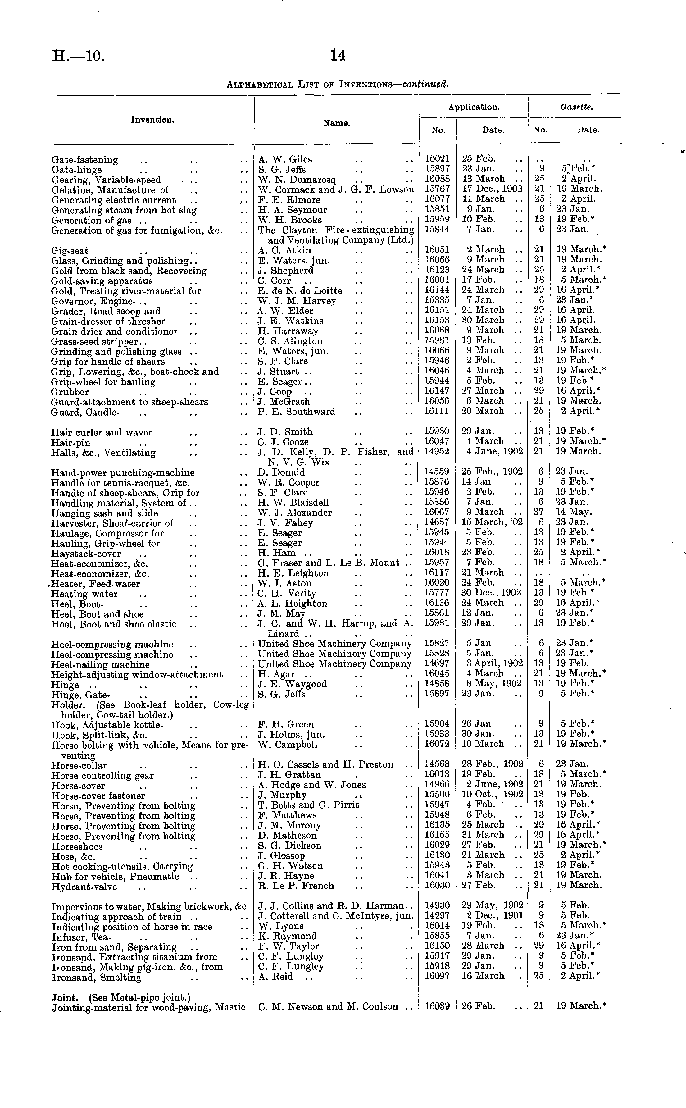 Application. Gazette. Invention. Name. No. Date. No. Date. Gate-fastening Gate-hinge Gearing, Variable-speed Gelatine, Manufacture of Generating electric current Generating steam from hot slag Generation of gas Generation of gas for fumigation, &c A. W. Giles S. G. Jeffs W. N. Dumaresq W. Cormack and J. G. F. Lowson F. E. Elmore H. A. Seymour W. H. Brooks The Clayton Fire - extinguishing and Ventilating Company (Ltd.) A. C. Atkin E. Waters, jun. J. Shepherd C. Corr E. de N. de Loitte .. W. J. M. Harvey A. W. Elder J. E. Watkins H. Harraway C. S. Alington E. Waters, jun. S. F. Clare J. Stuart E. Seager J. Coop J. McGrath P. E. Southward 16021 15897 16088 15707 16077 15851 15959 15844 25 Feb. 23 Jan. 13 March .. 17 Dec, 1902 11 March .. 9 Jan. 10 Feb. 7 Jan. 9 25 21 25 6 13 6 5"Feb.* 2 April. 19 March. 2 April. 23 Jan. 19 Feb.* 23 Jan. Gig-seat Glass, Grinding and polishing.. Gold from black sand, Recovering Gold-saving apparatus Gold, Treating river-material for Governor, EngineGrader, Road scoop and Grain-dresser of thresher Grain drier and conditioner Grass-seed stripper.. Grinding and polishing glass Grip for handle of shears Grip, Lowering, &c, boat-chock and Grip-wheel for hauling Grubber Guard-attachment to sheep-shears Guard, Candle16051 16066 16123 16001 16144 15S35 16151 16153 16068 15981 16066 15946 16046 15944 16147 16056 16111 2 March .. 9 March .. 24 March .. 17 Feb. 24 March .. 7 Jan. 24 March .. 30 March .. 9 March .. 13 Feb. 9 March .. 2 Feb. 4 March .. 5 Feb. 27 March .. 6 March .. 20 March .. 21 21 25 18 29 6 29 29 21 18 21 13 21 13 29 21 25 19 March.* 19 March. 2 April.* 5 March.* 16 April.* 23 Jan.* 16 April. 16 April. 19 March. 5 March. 19 March. 19 Feb.* 19 March.* 19 Feb.* 16 April.* 19 March. 2 April.* Hair curler and waver Hair-pin Halls, &c, Ventilating J. D. Smith C. J. Cooze J. D. Kelly, D. P. Fisher, and N. V. G. Wix D. Donald W. R. Cooper S. F. Clare H. W. Blaisdell W. J. Alexander J. V. Fahey E. Seager E. Seager H. Ham G. Fraser and L. Le B. Mount .. H. E. Leighton W. I. Aston C. H. Verity A. L. Heighton J. M. May J. C. and W. H. Harrop, and A. Linard United Shoe Machinery Company United Shoe Machinery Company United Shoe Machinery Company H. Agar J. E. Waygood S. G. Jeffs 15930 16047 14952 29 Jan. 4 March .. 4 June, 1902 13 21 21 19 Feb.* 19 March.* 19 March. Hand-power punching-machine Handle for tennis-racquet, &o. Handle of sheep-shears, Grip for Handling material, System of .. Hanging sash and slide Harvester, Sheaf-carrier of Haulage, Compressor for Hauling, Grip-wheel for Haystack-cover Heat-economizer, &c Heat-economizer, &c Heater, Feed-water Heating water Heel, BootHeel, Boot and shoe Heel, Boot and shoe elastic 14559 15876 15946 15836 16067 14637 15945 15944 .16018 15957 16117 16020 15777 16136 15861 15931 25 Feb., 1902 14 Jan. 2 Feb. 7 Jan. 9 March .. 15 March, '02 5 Feb. 5 Feb. 23 Feb. 7 Feb. 21 March .. 24 Feb. 30 Dec, 1902 24 March .. 12 Jan. 29 Jan. 6 9 13 6 37 6 13 13 25 18 23 Jan. 5 Feb.* 19 Feb.* 23 Jan. 14 May. 23 Jan. 19 Feb.* 19 Feb.* 2 April.* 5 March.* 18 13 29 6 13 5 March.* 19 Feb.* 16 April.* 23 Jan.* 19 Feb.* Heel-compressing machine Heel-compressing machine Heel-nailing machine Height-adjusting window-attachment Hinge Hinge, GateHolder. (See Book-leaf holder, Cow-leg holder, Cow-tail holder.) Hook, Adjustable kettleHook, Split-link, &c Horse bolting with vehicle, Means for preventing Horse-collar Horse-controlling gear Horse-cover Horse-cover fastener Horse, Preventing from bolting Horse, Preventing from boltingHorse, Preventing from bolting Horse, Preventing from bolting Horseshoes Hose, &c Hot cooking-utensils, Carrying Hub for vehicle, Pneumatic Hydrant-valve 15827 15828 14697 16045 14858 15897 5 Jan. 5 Jan. 3 April, 1902 4 March .. 8 May, 1902 23 Jan. 6 6 13 21 13 9 23 Jan.* 23 Jan.* 19 Feb. 19 March.* 19 Feb.* 5 Feb.* F. H. Green J. Holms, jun. W. Campbell 15904 15933 16072 26 Jan. 30 Jan. 10 March .. 9 18 21 5 Feb.* 19 Feb.* 19 March.* H. O. Cassels and H. Preston .. J. H. Grattan A. Hodge and W. Jones J. Murphy T. Betts and G. Pirrit F. Matthews J. M. Morony D. Matheson S. G. Dickson J. Glossop G. H. Watson J. R. Hayne R. Le P. French 14568 16013 14960 15500 15947 15948 16135 16155 16029 16130 15943 16041 16030 28 Feb., 1902 19 Feb. 2 June, 1902 10 Oct., 1902 4 Feb. 6 Feb. 25 March .. 31 March .. 27 Feb. 21 March .. 5 Feb. 3 March .. 27 Feb. 6 18 21 13 13 13 ■29 29 21 25 13 21 21 23 Jan. 5 March.* 19 March. 19 Feb. 19 Feb.* 19 Feb.* 16 April.* 16 April.* 19 March.* 2 April.* 19 Feb.* 19 March. 19 March. Impervious to water, Making brickwork, &c. Indicating approach of train Indicating position of horse in race Infuser, TeaIron from sand, Separating Ironsand, Extracting titanium from Iionsand, Making pig-iron, &c, from Ironsand, Smelting J. J. Collins and R. D. Harman.. J. Cotterell and C. Mclntyre, jun. W. Lyons K. Raymond F. W. Taylor C. F. Lungley C. F. Lungley A. Reid .. 14930 14297 16014 15855 16150 15917 15918 16097 29 May, 1902 2 Dec, 1901 19 Feb. 7 Jan. 28 March .. 29 Jan. 29 Jan. 16 March .. 9 9 18 6 29 9 9 25 5 Feb. 5 Feb. 5 March.* 23 Jan.* 16 April.* 5 Feb.* 5 Feb.* 2 April.* Joint. (See Metal-pipe joint.) Jointing-material for wood-paving, Mastic C. M. Newson and M. Coulson .. 16039 26 Feb. 19 March.* 21