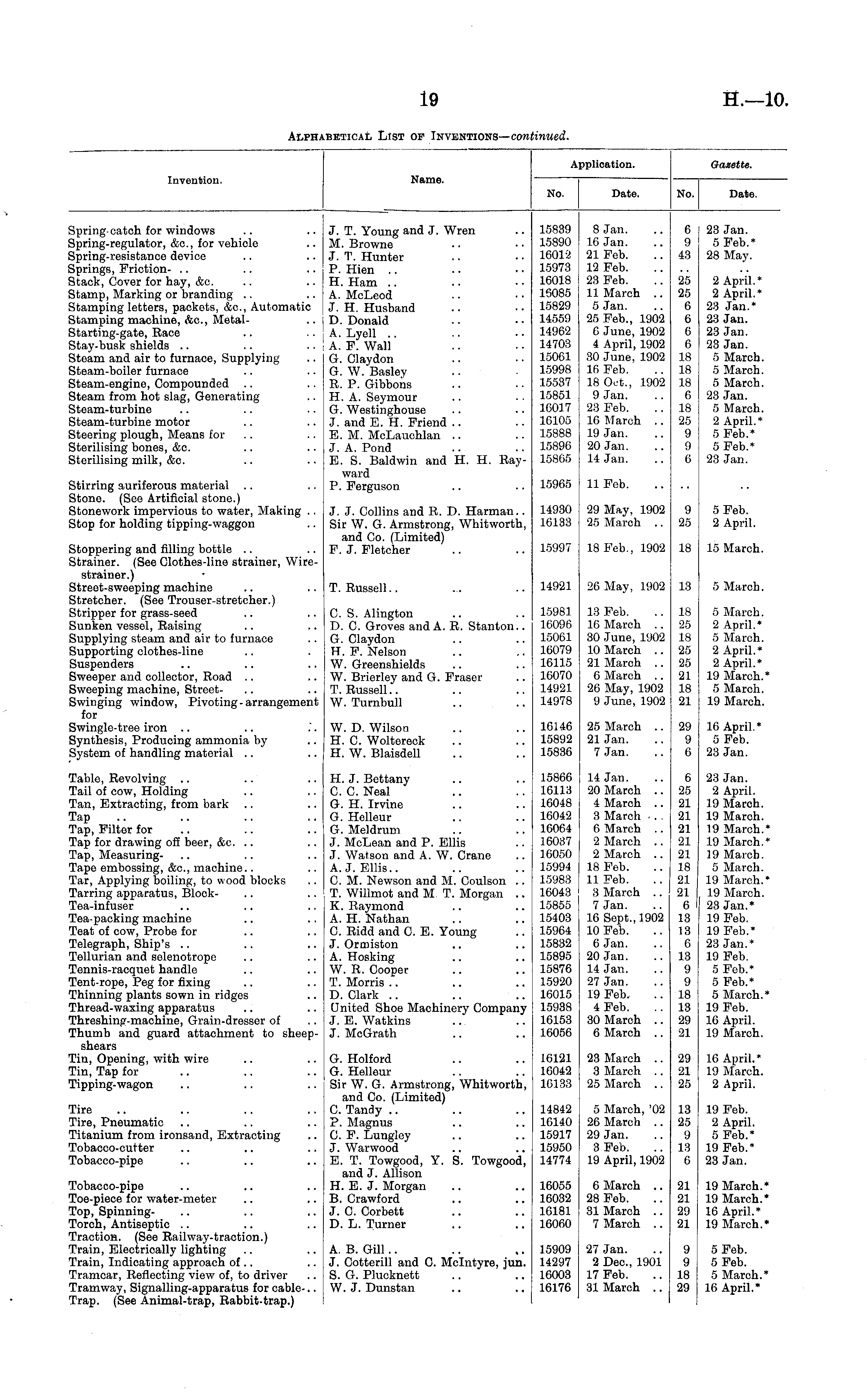Application. Gazette. Invention. Name. No. No. Date. Date. Spring-catch for windows Spring-regulator, &c, for vehicle Spring-resistance device Springs, FrictionStack, Cover for hay, &c Stamp, Marking or branding Stamping letters, packets, &c, Automatic Stamping machine, &c, Metal-Starting-gate, Race Stay-busk shields Steam and air to furnace, Supplying Steam-boiler furnace Steam-engine, Compounded Steam from hot slag, Generating Steam-turbine Steam-turbine motor Steering plough, Means for Sterilising bones, &c. Sterilising milk, &c J. T. Young and J. Wren M. Browne J. T. Hunter P. Hien H. Ham A. McLeod J. H. Husband D. Donald A. Lyell A. F. Wall G. Claydon G. W. Basley R. P. Gibbons H. A. Seymour G. Westinghouse J. and E. H. Friend .. E. M. McLauchlan J. A. Pond E. S. Baldwin and H. H. Rayward P. Ferguson 15839 15890 16012 15973 16018 16085 15829 14559 14902 14703 15061 15998 15537 15851 16017 10105 15888 15896 1.580.5 8 Jan. 16 Jan. 21 Feb. 12 Feb. 23 Feb. 11 March .. 5 Jan. 25 Feb., 1902 0 June, 1902 4 April, 1902 30 June, 1902 16 Feb. 18 Oct., 1902 9 Jan. 23 Feb. 10 March .. 19 Jan. 20 Jan. 14 Jan. 6 9 43 2.5 2.5 6 6 6 6 18 18 18 6 18 2.5 9 9 6 23 Jan. 5 Feb.* 28 May. 2 April.* 2 April.* 23 Jan.* 23 Jan. 23 Jan. 23 Jan. 5 March. 5 March. 5 March. 23 Jan. 5 March. 2 April.* 5 Feb.* 5 Feb.* 23 Jan. Stirring auriferous material Stone. (See Artificial stone.) Stonework impervious to water, Making .. Stop for holding tipping-waggon J. J. Collins and R. D. Harman.. Sir W. G. Armstrong, Whitworth, and Co. (Limited) F. J. Fletcher 15965 14930 16133 11 Feb. 29 May, 1902 2.5 Alavch .. 9 25 5 Feb. 2 April. Stoppering and filling bottle Strainer. (See Clothes-line strainer, Wirestrainer.) Street-sweeping machine Stretcher. (See Trouser-stretcher.) Stripper for grass-seed Sunken vessel, Raising Supplying steam and air to furnace Supporting clothes-line Suspenders Sweeper and collector, Road Sweeping machine, StreetSwinging window, Pivoting-arrangement for Swingle-tree iron Synthesis, Producing ammonia by System of handling material T.Russell.. C. S. Alington D. C. Groves and A. R. Stanton.. G. Claydon H.F.Nelson W. Greenshields W. Brierley and G. Fraser T.Russell.. W. Turnbull 15997 14921 15981 10091! 15061 16079 16115 16070 14921 14978 18 Feb., 1902 26 May, 1902 13 Feb. 10 March .. 30 June, 1902 10 March .. 21 March .. 6 March .. 26 May, 1902 9 June, 1902 18 13 18 25 18 25 2.5 21 18 21 15 March. 5 March. 5 March. 2 April.* 5 March. 2 April.* 2 April.* 19 March.* 5 March. 19 March. W. D. Wilson H. C. Woltereck H. W. Blaisdell 16146 15892 15836 25 March .. 21 Jan. 7 Jan. 29 9 6 16 April.* 5 Feb. 23 Jan. Table, Revolving Tail of cow, Holding Tan, Extracting, from bark Tap Tap, Filter for Tap for drawing off beer, &c Tap, MeasuringTape embossing, &c, machine.. Tar, Applying boiling, to wood blocks Tarring apparatus, Block-Tea-infuser Tea-packing machine Teat of cow, Probe for Telegraph, Ship's Tellurian and selenotrope Tennis-racquet handle Tent-rope, Peg for fixing Thinning plants sown in ridges Thread-waxing apparatus Threshing-machine, Grain-dresser of Thumb and guard attachment to sheepshears Tin, Opening, with wire Tin, Tap for Tipping-wagon H. J. Bettany C. C. Neal G. H. Irvine G. Helleur G. Mel drum J. McLean and P. Ellis J. Watson and A. W. Crane A.J.Ellis.. C. M. Newson and M. Coulson .. T. Willmot and M T. Morgan .. K. Raymond A. H. Nathan C. Ridd and C. E. Young J. Ormiston A. Hosking W.R.Cooper T. Morris D. Clark United Shoe Machinery Company J. E. Watkins J. McGrath 15866 16113 16048 16042 16064 16037 16050 15994 15983 16043 15855 15403 15964 15832 15895 15876 15920 16015 15938 16153 16056 14 Jan. 20 March .. 4 March .. 3 March . .. 6 March .. 2 March .. 2 March .. 18 Feb. 11 Feb. 8 March .. 7 Jan. 16 Sept., 1902 10 Feb. 6 Jan. 20 Jan. 14 Jan. 27 Jan. 19 Feb. 4 Feb. 30 March .. 6 March .. 6 25 21 21 21 21 21 IS 21 21 6 13 13 6 13 9 9 18 13 29 21 23 Jan. 2 April. 19 March. 19 March. 19 March.* 19 March.* 19 March. 5 March. 19 March.* 19 March. 23 Jan.* 19 Feb. 19 Feb.* 23 Jan.* 19 Feb. 5 Feb.* 5 Feb.* 5 March.* 19 Feb. 16 April. 19 March. Tire Tire, Pneumatic Titanium from ironsand, Extracting Tobacco-cutter Tobacco-pipe G. Holford G. Helleur Sir W. G. Armstrong, Whitworth, and Co. (Limited) C. Tandy P. Magnus C. F. Lungley J. Warwood E. T. Towgood, Y. S. Towgood, and J. Allison H. E. J. Morgan B. Crawford J. C. Corbett D. L. Turner 16121 16042 16133 14842 16140 15917 15950 14774 23 March .. 3 March .. 25 March .. 5 March, '02 26 March .. 29 Jan. 3 Feb. 19 April, 1902 29 21 25 13 25 9 1.3 6 16 April.* 19 March. 2 April. 19 Feb. 2 April. 5 Feb.* 19 Feb.* 23 Jan. Tobacco-pipe Toe-piece for water-meter Top, SpinningTorch, Antiseptic Traction. (See Railway-traction.) Train, Electrically lighting Train, Indicating approach of.. Tramcar, Reflecting view of, to driver Tramway, Signalling-apparatus for cable-.. Trap. (See Animal-trap, Rabbit-trap.) 16055 16032 10181 16060 0 March .. 28 Feb. 31 March .. 7 March .. 21 21 29 21 19 March.* 19 March.* 16 April.* 19 March.* A. B. Gill J. Cotterill and C. Mclntyre, jun. S. G. Plucknett W. J. Dunstan 15909 14297 16003 16176 27 Jan. 2 Dec, 1901 17 Feb. 81 March .. 9 9 18 29 5 Feb. 5 Feb. 5 March.* 16 April.*