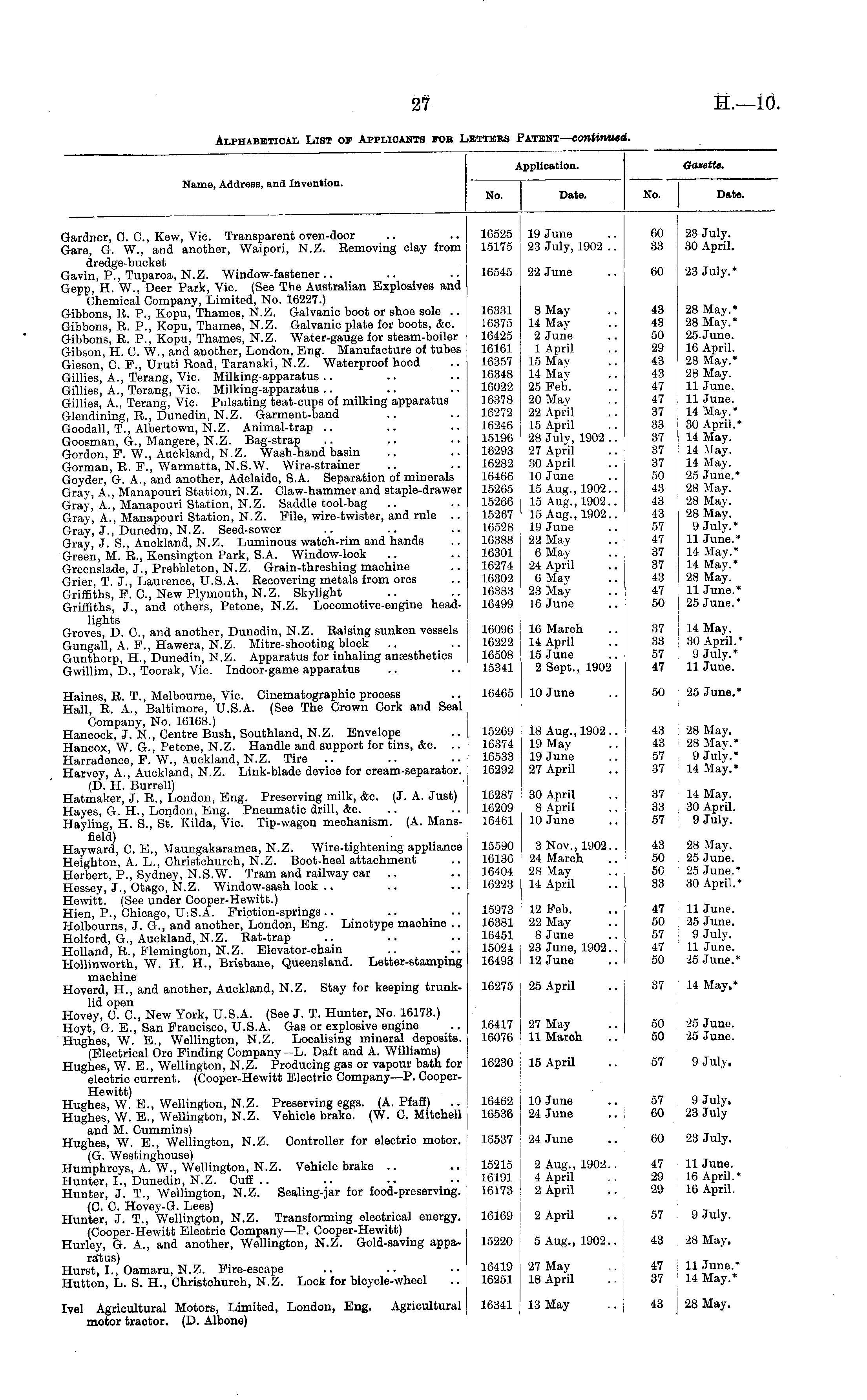 .pp] ical ;ion. Name, Address, and Invention. No. No. Date. Date. Gardner, C. C, Kew, Vic. Transparent oven-door Gare, G. W., and another, Waipori, N.Z. Removing clay from dredge-bucket Gavin, P., Tuparoa, N.Z. Window-fastener.. Gepp, H. W., Deer Park, Vic. (See The Australian Explosives and Chemical Company, Limited, No. 16227.) Gibbons, R. P., Kopu, Thames, N.Z. Galvanic boot or shoe sole .. Gibbons, R. P., Kopu, Thames, N.Z. Galvanic plate for boots, &c. Gibbons, R. P., Kopu, Thames, N.Z. Water-gauge for steam-boiler Gibson, H. C. W., and another, London, Eng. Manufacture of tubes Giesen, C. F., Uruti Road, Taranaki, N.Z. Waterproof hood Gillies, A., Terang, Vic. Milking-apparatus Gillies, A., Terang, Vic. Milking-apparatus Gillies, A., Terang, Vic. Pulsating teat-cups of milking apparatus Glendining, R., Dunedin, N.Z. Garment-band Goodall, T., Albertown, N.Z. Animal-trap .. Goosman, G., Mangere, N.Z. Bag-strap Gordon, F. W., Auckland, N.Z. Wash-hand basin Gorman, R. F., Warmatta, N.S.W. Wire-strainer Goyder, G. A., and another, Adelaide, S.A. Separation of minerals Gray, A., Manapouri Station, N.Z. Claw-hammer and staple-drawer Gray, A., Manapouri Station, N.Z. Saddle tool-bag Gray, A., Manapouri Station, N.Z. File, wire-twister, and rule .. Gray, J., Dunedin, N.Z. Seed-sower Gray, J. S., Auckland, N.Z. Luminous watch-rim and hands Green, M. R., Kensington Park, S.A. Window-lock Greenslade, J., Prebbleton, N.Z. Grain-threshing machine Grier, T. J., Laurence, U.S.A. Recovering metals from ores Griffiths, F. C, New Plymouth, N.Z. Skylight Griffiths, J., and others, Petone, N.Z. Locomotive-engine headlights Groves, D. C, and another, Dunedin, N.Z. Raising sunken vessels Gungall, A. F., Hawera, N.Z. Mitre-shooting block Gunthorp, H., Dunedin, N.Z. Apparatus for inhaling anaesthetics Gwillim, D., Toorak, Vic. Indoor-game apparatus 16525 15175 19 June 23 July, 1902 .. 60 23 July. 33 30 April. 16545 22 June 60 23 July.* 16331 16375 16425 16161 16357 16348 16022 16378 16272 16246 15196 16293 16282 16466 15265 15266 15267 16528 16388 16301 16274 16302 16383 16499 8 May 14 May 2 June 1 April 15 May 14 May 25 Feb. 20 May 22 April 15 April 28 July, 1902 .. 27 April 30 April 10 June 15 Aug., 1902.. 15 Aug., 1902.. 15 Aug., 1902.. 19 June 22 May 6 May 24 April 6 May 23 May 16 June 43 28 May.* 43 28 May.* 50 25 June. 29 16 April. 43 28 May.* 43 28 May. 47 11 June. 47 11 June. 37 14 May. * 33 30 April.* 37 ' 14 May. 37 14 May. 37 14 May. 50 25 June.* 43 28 May. 43 28 Mav. 43 28 May. 57 9 July.* 47 11 June.* 37 14 iMay.* 37 ! 14 May.* 43 i 28 May. 47 11 June.* 50 25 June.* 16096 16222 16508 15341 16 March 14 April 15 June 2 Sept., 1902 37 14 May. 33 30 April.* 57 9 July.* 47 11 June. Haines, R. T., Melbourne, Vic. Cinematographic process Hall, R. A., Baltimore, U.S.A. (See The Crown Cork and Seal Company, No. 16168.) Hancock, J. N., Centre Bush, Southland, N.Z. Envelope Hancox, W. G., Petone, N.Z. Handle and support for tins, &c .. Harradence, F. W., Auckland, N.Z. Tire .. Harvey, A., Auckland, N.Z. Link-blade device for cream-separator. (D. H. Burrell) Hatmaker, J. R., London, Eng. Preserving milk, &c (J. A. Just) Hayes, G. H., London, Eng. Pneumatic drill, &c Hayling, H. S., St. Kilda, Vic. Tip-wagon mechanism. (A. Mansfield) Hayward, C. E., Maungakaramea, N.Z. Wire-tightening appliance Heighton, A. L., Christchurch, N.Z. Boot-heel attachment Herbert, P., Sydney, N.S.W. Tram and railway car .. Hessey, J., Otago, N.Z. Window-sash lock .. Hewitt. (See under Cooper-Hewitt.) Hien, P., Chicago, U.S.A. Friction-springs.. Holbourns, J. G., and another, London, Eng. Linotype machine .. Holford, G., Auckland, N.Z. Rat-trap Holland, R., Flemington, N.Z. Elevator-chain Hollinworth, W. H. H., Brisbane, Queensland. Letter-stamping machine Hoverd, H., and another, Auckland, N.Z. Stay for keeping trunklid open Hovey, 0. C, New York, U.S.A. (See J. T. Hunter, No. 16173.) Hoyt, G. E., San Francisco, U.S.A. Gas or explosive engine Hughes, W. E., Wellington, N.Z. Localising mineral deposits. (Electrical Ore Finding Company—L. Daft and A. Williams) Hughes, W. E., Wellington, N.Z. Producing gas or vapour bath for electric current. (Cooper-Hewitt Electric Company—P. CooperHewitt) Hughes, W. E., Wellington, N.Z. Preserving eggs. (A. Pfaff) Hughes, W. E., Wellington, N.Z. Vehicle brake. (W. C. Mitchell and M. Cummins) Hughes, W. E., Wellington, N.Z. Controller for electric motor. (G. Westinghouse) Humphreys, A. W., Wellington, N.Z. Vehicle brake .. Hunter, I., Dunedin, N.Z. Cuff.. Hunter, J. T., Wellington, N.Z. Sealing-jar for food-preserving. (C. C. Hovey-G. Lees) Hunter, J. T., Wellington, N.Z. Transforming electrical energy. (Cooper-Hewitt Electric Company—P. Cooper-Hewitt) Hurley, G. A., and another, Wellington, N.Z. Gold-saving apparatus) Hurst, I., Oamaru, N.Z. Fire-escape Hutton, L. S. H., Christchurch, N.Z. Lock for bicycle-wheel 10465 10 June 50 25 June.* 15269 16374 16533 16292 18 Aug., 1902.. 19 May 19 June 27 April 43 28 May. 43 28 Mav.* 57 9 July.* 37 14 May.* 16287 16209 16461 30 April 8 April 10 June 37 14 May. 33 30 April. 57 9 July. 15590 16136 16404 16223 3 Nov., 1902.. 24 March 28 May 14 April 43 28 May. 50 25 June. 50 25 June.* 33 30 April.* 15973 16381 16451 15024 16493 12 F n eb. 22 May 8 June 23 June, 1902.. 12 June 47 11 June. 50 25 June. 57 9 July. 47 11 June. 50 25 June.* 16275 25 April 37 14 May.* 16417 16076 27 May 11 Maroh 50 25 June. 50 25 June. 16230 15 April 57 9 July. 16462 16536 10 June 24 June 57 9 July. 60 23 July 16537 24 June 60 23 July. 15215 16191 16173 2 Aug., 1902.. 4 April 2 April 47 11 June. 29 16 April.* 29 16 April. 16169 2 April 57 9 July. 15220 5 Aug., 1902.. 43 28 May. 16419 16251 27 May 18 April 13 May .. j 47 11 June.* 37 14 May.* 43 I 28 May. Ivel Agricultural Motors, Limited, London, Eng. Agricultural motor tractor. (D. Albone) 16341