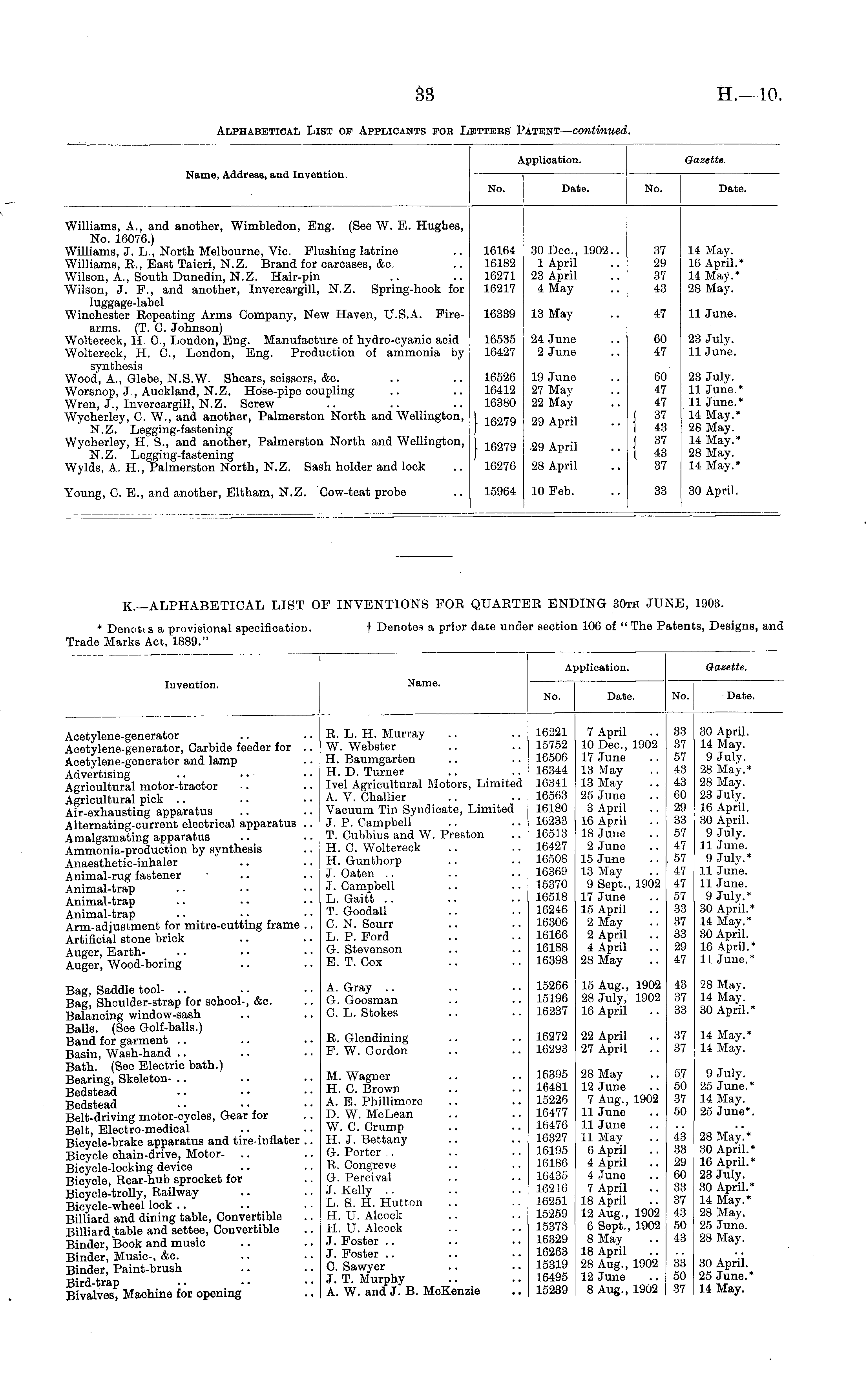 X.—ALPHABETICAL LIST OF INVENTIONS FOR QUARTER ENDING 30th JUNE, 1903. Denotes a provisional specification. Denotes a prior date under section 106 of "The Patents, Designs, and Trade Marks Act, 1889."