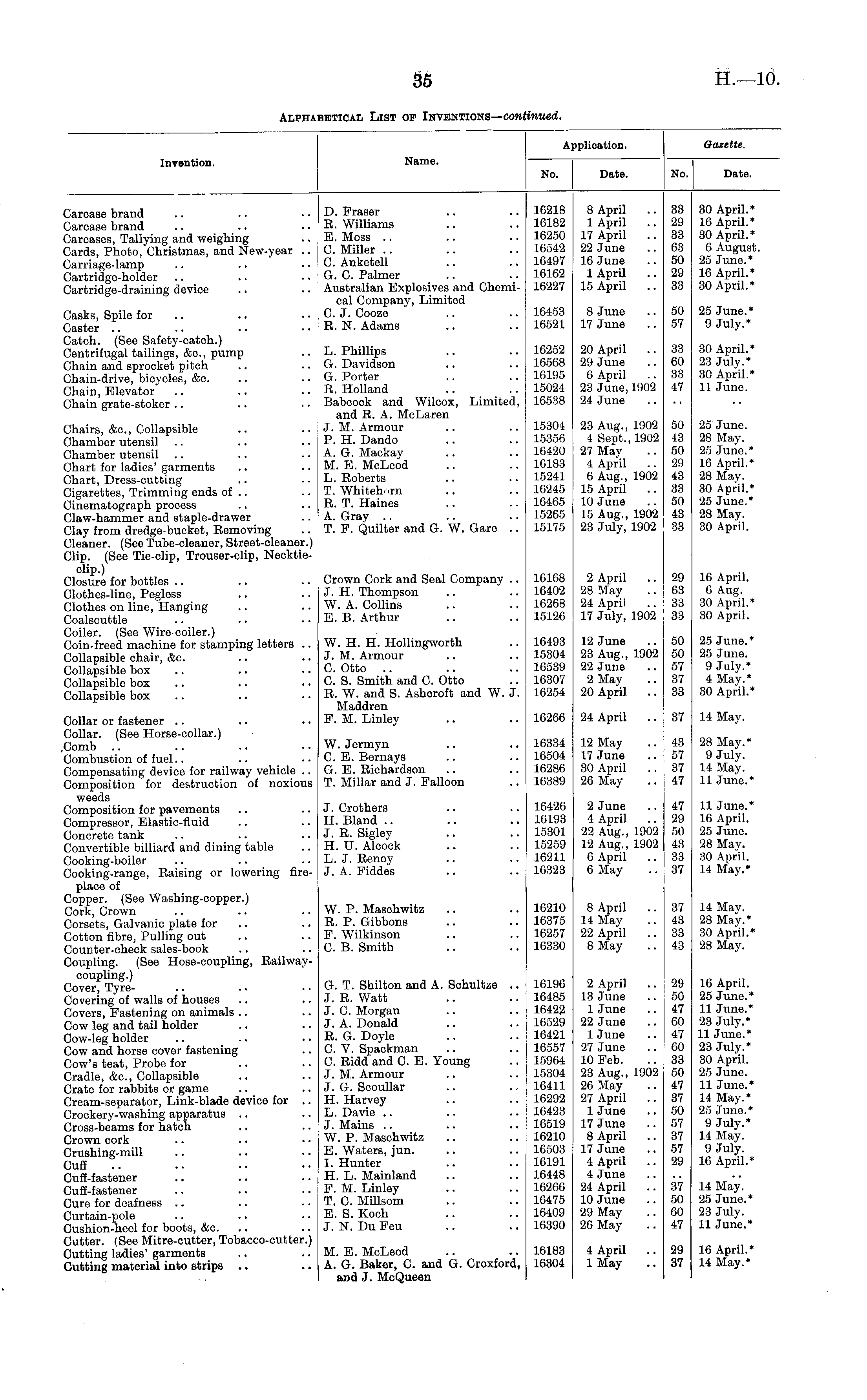 Application. Gazette. Invention. Name. No. Date. No. Date. Carcase brand Carcase brand Carcases, Tallying and weighing Cards, Photo, Christmas, and New-year .. Carriage-lamp Cartridge-holder Cartridge-draining device D. Fraser R. Williams E. Moss C. Miller C. Anketell G. C. Palmer Australian Explosives and Chemical Company, Limited C. J. Cooze R. N. Adams 16218 16182 16250 16542 16497 16162 16227 8 April 1 April 17 April 22 June 16 June 1 April 15 April 33 29 33 03 50 29 33 30 April.* 16 April.* 30 April.* 6 August. 25 June.* 16 April.* 30 April.* Casks, Spile for Caster Catch. (See Safety-catch.) Centrifugal tailings, &c, pump Chain and sprocket pitch Chain-drive, bicycles, &c Chain, Elevator Chain grate-stoker 16453 16521 8 June 17 June 50 57 25 June.* 9 July.* L. Phillips G. Davidson G. Porter R. Holland Babcock and Wilcox, Limited, and R. A. McLaren J. M. Armour P. H. Dando A. G. Mackay M. E. McLeod L. Roberts T. Whitehirn R. T. Haines A. Gray .. T. F. Quilter and G. W. Gare .. 16252 16568 16195 15024 16538 20 April 29 June 6 April 23 June, 1902 24 June 33 GO 47 30 April.* 23 July.* 30 April.* 11 June. Chairs, &c, Collapsible Chamber utensil Chamber utensil Chart for ladies' garments Chart, Dress-cutting Cigarettes, Trimming ends of .. Cinematograph process Claw-hammer and staple-drawer Clay from dredge-bucket, Removing Cleaner. (See Tube-cleaner, Street-cleaner.) Clip. (See Tie-clip, Trouser-elip, Necktieclip.) Closure for bottles Clothes-line, Pegless Clothes on line, Hanging Coalscuttle Coiler. (See Wire-coiler.) Coin-freed machine for stamping letters .. Collapsible chair, &c Collapsible box Collapsible box Collapsible box 15304 15350 16420 10183 15241 16245 16465 15265 15175 23 Aug., 1902 4 Sept., 1902 27 May 4 April 6 Aug., 1902 15 April 10 June 15 Aug., 1902 23 July, 1902 50 43 50 29 43 33 50 48 33 25 June. 28 May. 25 June.* 16 April.* 28 May. 30 April.* 25 June.* 28 May. 30 April. Crown Cork and Seal Company .. J. H. Thompson W. A. Collins E. B. Arthur 16168 16402 16268 15126 2 April 28 May 24 April 17 July, 1902 29 03 33 33 16 April. 6 Aug. 30 April.* 30 April. W. H. H. Hollingworth J. M. Armour C. Otto C. S. Smith and C. Otto R. W. and S. Ashcroft and W. J. Maddren F. M. Linley 16493 15304 16539 16307 16254 12 June 23 Aug., 1902 22 June 2 May 20 April 50 50 57 37 33 25 June.* 25 June. 9 July.* 4 May.* 30 April.* Collar or fastener Collar. (See Horse-collar.) Comb Combustion of fuel.. Compensating device for railway vehicle .. Composition for destruction of noxious weeds Composition for pavements Compressor, Elastic-fluid Concrete tank Convertible billiard and dining table Cooking-boiler Cooking-range, Raising or lowering fireplace of Copper. (See Washing-copper.) Cork, Crown Corsets, Galvanic plate for Cotton fibre, Pulling out Counter-check sales-book Coupling. (See Hose-coupling, Railwaycoupling.) Cover, TyreCovering of walls of houses Covers, Fastening on animals Cow leg and tail holder Cow-leg holder Cow and horse cover fastening Cow's teat, Probe for Cradle, &c, Collapsible Crate for rabbits or game Cream-separator, Link-blade device for .. Crockery-washing apparatus Cross-beams for hatch Crown cork Crushing-mill Cuff Cuff-fastener Cuff-fastener Cure for deafness Curtain-pole Cushion-heel for boots, &c. Cutter. (See Mitre-cutter, Tobacco-cutter.) Cutting ladies' garments Cutting material into strips 16266 24 April 37 14 May. W. Jermyn C. E. Bernays G. E. Richardson T. Millar and J. Falloon 16334 16504 16286 16389 12 May 17 June 30 April 26 May 43 57 37 47 28 May.* 9 July. 14 May. 11 June* J. Crothers H. Bland J. R. Sigley H. U. Alcock L. J. Renoy J. A. Fiddes 16426 16193 15301 15259 16211 16323 2 June 4 April 22 Aug., 1902 12 Aug., 1902 6 April 6 May 47 29 50 48 33 37 11 June.* 16 April. 25 June. 28 May. 30 April. 14 May.* W. P. Maschwitz R. P. Gibbons F. Wilkinson C. B. Smith 16210 16375 16257 16330 8 April 14 May 22 April 8 May 37 43 33 48 14 May. 28 May.* 30 April.* 28 May. G. T. Shilton and A. Schultze .. J. R. Watt J. C. Morgan J. A. Donald R. G. Doyle C. V. Spackman C. Ridd and C. E. Young J. M. Armour J. G. Scoullar H. Harvey L. Davie J. Mains .. W. P. Maschwitz E. Waters, jun. I. Hunter H. L. Mainland F. M. Linley T. C. Millsom E. S. Koch J. N. Du Feu 16196 16485 16422 16529 16421 16557 15964 15304 16411 16292 16423 16519 16210 16503 16191 16448 16266 16475 16409 16390 2 April 13 June 1 June 22 June 1 June 27 June 10 Feb. 23 Aug., 1902 26 May 27 April 1 June 17 June 8 April 17 June 4 April 4 June 24 April 10 June 29 May 26 May 29 50 47 60 47 GO 33 50 47 37 50 57 37 57 29 16 April. 25 June.* 11 June.* 23 July.* 11 June.* 23 July.* 30 April. 25 June 11 June.* 14 May.* 25 June.* 9 July.* 14 May. 9 July. 16 April.* 37 .50 GO 47 14 May. 25 June.* 23 July. 11 June.* M. E. McLeod A. G. Baker, C. and G. Croxford, and J. McQueen 16183 16304 4 April 1 May 29 37 16 April.* 14 May.*