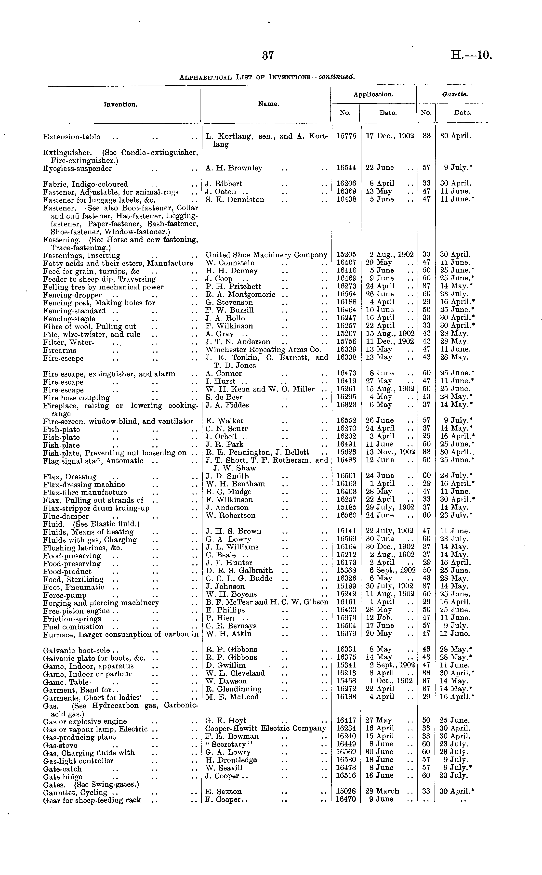 Invention. Name. Aj No. Application. No. Gazette. Date. Date. Extension-table L. Kortlang, sen., and A. Kortlang 15775 17 Dec, 1902 38 30 April. Extinguisher. (See Candle - extinguisher, Fire-extinguisher.) Eyeglass-suspender A. H. Brownley 16544 22 June 9 July.* .57 Fabric, Indigo-coloured Fastener, Adjustable, for animal-rugs Fastener for luggage-labels, &c Fastener. (See also Boot-fastener, Collar and cuff fastener, Hat-fastener, Leggingfastener, Paper-fastener, Sash-fastener, Shoe-fastener, Window-fastener.) Fastening. (See Horse and cow fastening, Trace-fastening.) Fastenings, Inserting Fatty acids and their esters, Manufacture Feed for grain, turnips, &c .. Feeder to sheep-dip, TraversingFelling tree by mechanical power Fencing-dropper Fencing-post, Making holes for Fencing-standard Fencing-staple Fibre of wool, Pulling out File, wire-twister, and rule Filter, WaterFirearms Fire-escape J. Ribbert J. Oaten S. E. Denniston 16206 16369 16438 8 April 13 May 5 June 33 17 30 April. 11 June. 11 June.* United Shoe Machinery Company W. Connstein H. H. Denney J. Coop P. H. Pritchott R. A. Montgomerie G. Stevenson F. W. Bursill J. A. Rollo F. Wilkinson A. Gray J. T. N. Anderson Winchester Repeating Arms Co. J. E. Tonkin, C. Barnett, and T. D. Jones A. Connor I. Hurst .. W. H. Keon and W. O. Miller .. S. de Beer J. A. Fiddes 15205 16407 16446 16469 16273 16554 16188 16464 16247 16257 15267 15756 16339 16338 2 Aug., 1902 29 May 5 June 9 June 24 April 26 June 4 April 10 Juno 16 April 22 April 15 Aug., 1902 11 Dec, 1902 13 May 13 May 83 47 50 50 87 60 29 GO 33 33 43 43 47 43 30 April. 11 June. 25 June.* 25 June.* 14 May.* 23 July. 16 April.* 25 June.* 30 April.* 30 April.* 28 May. 28 May. 11 June. 28 May. Fire escape, extinguisher, and alarm Fire-escape Fire-escape Fire-hose coupling Fireplace, raising or lowering cookingrange Fire-screen, window-blind, and ventilator Fish-plate Fish-plate Fish-plate Fish-plate, Preventing nut loosening on .. Flag-signal staff, Automatic 16473 16419 15261 16295 16323 8 June 27 May 15 Aug., 1902 4 May 6 May GO 47 50 48 37 25 June.* 11 June.* 25 June. 28 Mav.* 14 May.* E. Walker C. N. Scurr J. Orbell J. R. Park R. E. Pennington, J. Bellett J. T. Short, T. F. Rotheram, and J. W. Shaw J. D. Smith W. H. Bentham B. C. Mudge F. Wilkinson J. Anderson W. Robertson 16552 16270 16202 16491 15623 10483 26 June 24 April 3 April 11 June 13 Nov., 1902 12 June .57 37 29 50 88 50 9 July.* 14 May.* 16 April.* 25 June.* 30 April. 25 June.* Flax, Dressing Flax-dressing machine Flax-fibre manufacture Flax, Pulling out strands of .. Flax-stripper drum truing-up Flue-damper Fluid. (See Elastic fluid.) Fluids, Means of heating Fluids with gas, Charging Flushing latrines, &c Food-preserving Food-preserving Food-product Food, Sterilising Foot, Pneumatic Force-pump Forging and piercing machinery Free-piston engine Friction-springs Fuel combustion Furnace, Larger consumption of carbon in 16561 16163 16403 16257 15185 16560 24 June 1 April 28 May 22 April 29 July, 1902 24 June 60 29 47 88 37 60 23 July.* 16 April.* 11 June. 30 April.* 14 May. 23 July.* J. H. S. Brown G. A. Lowry J. L. Williams C. Beale J. T. Hunter D. R. S. Galbraith C. C. L. G. Budde J. Johnson W. H. Boyens B. F. McTear and H. C. W. Gibson E. Phillips P. Hien C. E. Bernays W. H. Atkin 15141 16569 16164 15212 16173 15368 16326 15199 15242 16161 16400 15973 16504 16379 22 July, 1902 30 June 30 Dec, 1902 2 Aug., 1902 2 April 6 Sept., 1902 6 May 30 July, 1902 11 Aug., 1902 1 April 28 May .12 Feb. 17 June 20 May 17 00 37 37 29 50 43 37 50 29 50 -17 57 47 11 June. 23 July. 14 May. 14 May. 16 April. 25 June. 28 May. 14 May. 25 June. 16 April. 25 June. 11 June. 9 July. 11 June. Galvanic boot-sole .. 3alvanic plate for boots, &c .. 3ame, Indoor, apparatus 3arne, Indoor or parlour Same, Table3arment, Band for.. 3arments, Chart for ladies' 3-as. (See Hydrocarbon gas, Carbonicacid gas.) 3as or explosive engine 3as or vapour lamp, Electric .. 3as-producing plant Gas-stove Gas, Charging fluids with Gas-light controller 3ate-catch Gate-hinge Gates. (See Swing-gates.) 3auntlet, Cycling Gear for sheep-feeding rack R. P. Gibbons R. P. Gibbons D. Gwillim W. L. Cleveland W. Dawson R. Glendinning M. E. McLeod 16331 16375 15341 16213 15458 16272 16183 8 May 14 May 2 Sept., 1902 8 April 1 Oct., 1902 22 April 4 April 43 43 47 33 37 37 29 28 May.* 28 May.* 11 June. 30 April.* 14 May. 14 May.* 16 April.* G. E. Hoyt Cooper-Hewitt Electrio Company F. E. Bowman "Secretary" G. A. Lowry H. Droutledge W. Seavill J. Cooper 16417 16234 16240 16449 16569 16530 16478 16516 27 May 16 April 15 April 8 June 30 June 18 June 8 June 16 June 50 33 88 GO 60 57 57 GO 25 June. 30 April. 30 April. 23 July. 23 July. 9 July. 9 July.* 23 July. E. Saxton F. Cooper.. 15028 16470 28 March .. 9 June 33 30 April.*