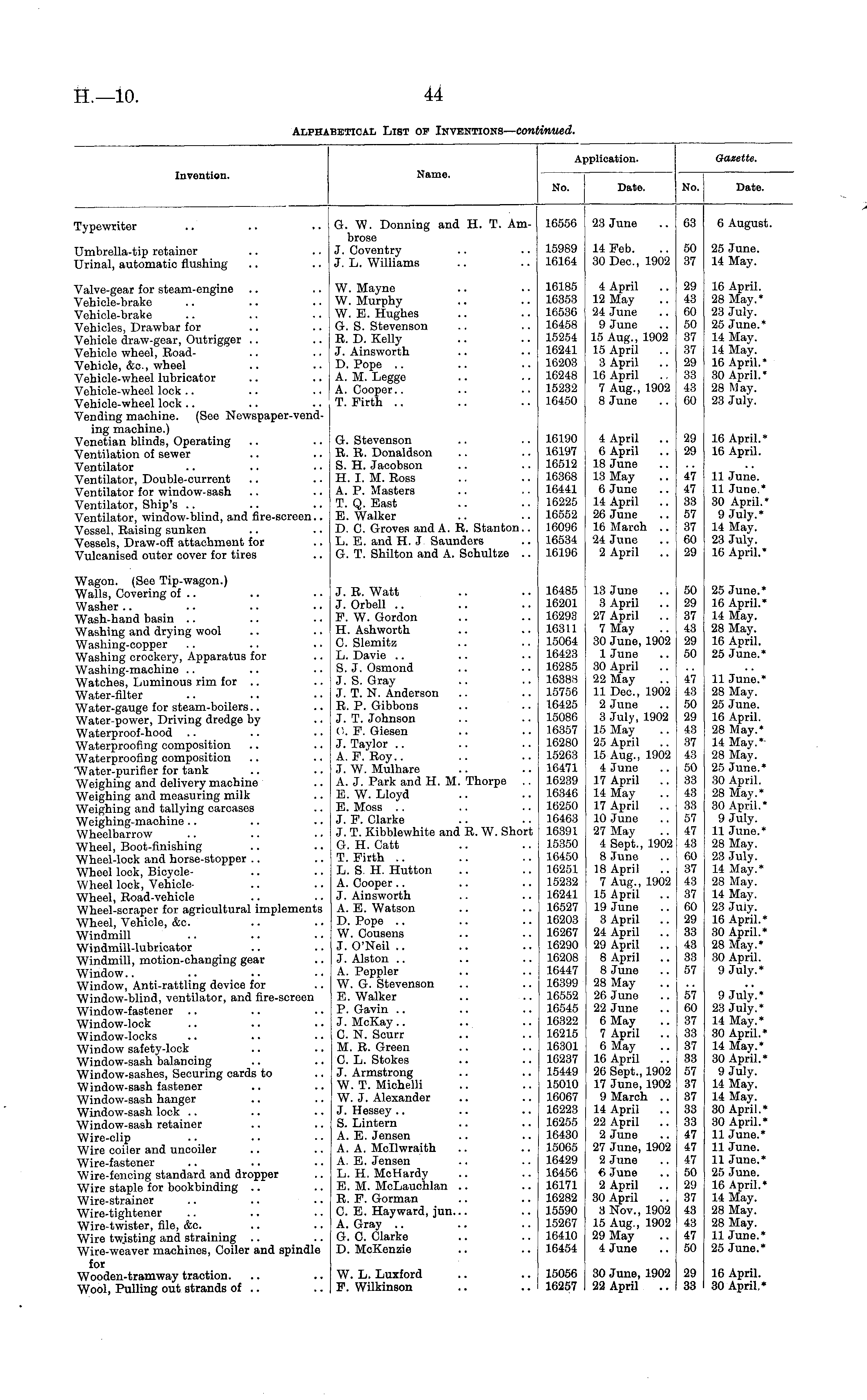 Application. Gazette. Invention. Name. No. No. Date. Date. Typewriter G. W. Donning and H. T. Ambrose J. Coventry J. L. Williams 16556 23 June 68 6 August. Umbrella-tip retainer Urinal, automatic flushing 15989 16164 14 Feb. 30 Dec, 1902 50 37 25 June. 14 May. Valve-gear for steam-engine Vehicle-brake Vehicle-brake Vehicles, Drawbar for Vehicle draw-gear, Outrigger Vehicle wheel, RoadVehicle, &c, wheel Vehicle-wheel lubricator Vehicle-wheel lock Vehicle-wheel lock Vending machine. (See Newspaper-vend-ing machine.) Venetian blinds, Operating Ventilation of sewer Ventilator Ventilator, Double-current Ventilator for window-sash Ventilator, Ship's Ventilator, window-blind, and fire-screen.. Vessel, Raising sunken Vessels, Draw-off attachment for Vulcanised outer cover for tires W. Mayne W. Murphy W. E. Hughes G. S. Stevenson R. D. Kelly J. Ainsworth D. Pope A. M. Legge A. Cooper.. T. Firth 16185 16353 16536 16458 15254 16241 16203 16248 15232 10450 4 April 12 May 24 June 9 June 15 Aug., 1902 15 April 3 April 16 April 7 Aug., 1902 8 June 29 48 00 50 87 37 29 33 43 60 16 April. 28 May.* 23 July. 25 June.* 14 May. 14 May. 16 April.* 30 April.* 28 May. 23 July. G. Stevenson R. R. Donaldson S. H. Jacobson H. I. M. Ross A. P. Masters T. Q. East E. Walker D. C. Groves and A. R. Stanton.. L. E. and H. J Saunders G. T. Shilton and A. Schultze .. 16190 16197 16512 16368 16441 16225 16552 16096 16534 16196 4 April 6 April 18 June 13 May 6 June 14 April 26 June 16 March .. 24 June 2 April 29 29 47 47 38 57 37 60 ■29 16 April.* 16 April. 11 June. 11 June.* 30 April.* 9 July.* 14 May. 23 July. 16 April.* Wagon. (See Tip-wagon.) Walls, Covering of .. Washer Wash-hand basin Washing and drying wool Washing-copper Washing crockery, Apparatus for Washing-machine Watches, Luminous rim for .. Water-filter Water-gauge for steam-boilers Water-power, Driving dredge by Waterproof-hood Waterproofing composition Waterproofing composition Water-purifier for tank Weighing and delivery machine Weighing and measuring milk Weighing and tallying carcases Weighing-machine Wheelbarrow Wheel, Boot-finishing Wheel-lock and horse-stopper Wheel lock, BicycleWheel lock, VehicleWheel, Road-vehicle Wheel-scraper for agricultural implements Wheel, Vehicle, &c. Windmill Windmill-lubricator Windmill, motion-changing gear Window.. Window, Anti-rattling device for Window-blind, ventilator, and fire-screen Window-fastener Window-lock Window-locks Window safety-lock Window-sash balancing Window-sashes, Securing cards to Window-sash fastener Window-sash hanger Window-sash lock Window-sash retainer Wire-clip Wire coiler and uncoiler Wire-fastener Wire-fencing standard and dropper Wire staple for bookbinding Wire-strainer Wire-tightener Wire-twister, file, &c Wire twisting and straining Wire-weaver machines, Coiler and spindle for Wooden-tramway traction... Wool, Pulling out strands of .. J. R. Watt J. Orbell F. W. Gordon H. Ashworth C. Slemitz L. Davie S. J. Osmond J. S. Gray J. T. N. Anderson R. P. Gibbons J. T. Johnson V,. F. Giesen J. Taylor A.F.Roy.. J. W. Mulhare A. J. Park and H. M. Thorpe .. E.W.Lloyd E. Moss J. F. Clarke J. T. Kibblewhite and R. W. Short G. H. Catt T. Firth L. S. H. Hutton A. Cooper J. Ainsworth A. E. Watson D. Pope .. W. Cousens J. O'Neil J. Alston A. Peppier W. G. Stevenson E. Walker P. Gavin J. McKay.. C. N. Scurr M. R. Green C. L. Stokes J. Armstrong W. T. Michelli W. J. Alexander J. Hessey S. Lintern A. E. Jensen A. A. Mcllwraith A. E. Jensen L. H. McHardy E. M. McLauchlan R. F. Gorman C. E. Hayward, jun. A. Gray G. C. Clarke D. McKenzie 16485 16201 16293 16311 15064 16423 16285 16388 15756 16425 15086 16357 16280 15263 16471 16239 16346 16250 16463 16391 15350 16450 16251 15232 16241 16527 16203 16267 16290 16208 16447 16399 16552 16545 16322 16215 16301 16237 15449 15010 16067 16223 16255 16430 15065 16429 16456 16171 16282 15590 15267 16410 16454 13 June 3 April 27 April 7 May 30 June, 1902 1 June 30 April 22 May 11 Dec, 1902 2 June 3 July, 1902 15 May 25 April 15 Aug., 1902 4 June 17 April 14 May 17 April 10 June 27 May 4 Sept., 1902 8 June 18 April 7 Aug., 1902 15 April .. 19 June 8 April 24 April 29 April 8 April 8 June 28 May 26 June 22 June 6 May 7 April 6 May 16 April 26 Sept., 1902 17 June, 1902 9 March .. 14 April 22 April 2 June 27 June, 1902 2 June 6 June 2 April 30 April 3 Nov., 1902 15 Aug., 1902 29 May 4 June 50 29 37 48 29 GO 47 48 GO 29 43 37 48 50 88 48 33 57 47 43 60 87 43 37 60 29 S3 43 33 57 25 June.* 16 April.* 14 May. 28 May. 16 April. 25 June.* 11 June.* 28 May. 25 June. 16 April. 28 May.* 14 May.* 28 May. 25 June.* 30 April. 28 May.* 30 April.* 9 July. 11 June.* 28 May. 23 July. 14 May.* 28 May. 14 May. 23 Juiy. 16 April.* 30 April.* 28 May.* 30 April. 9 July.* 57 60 37 33 37 88 .57 37 37 33 33 47 47 47 50 •29 37 48 43 47 50 9 July.* 23 July.* 14 May.* 30 April.* 14 May.* 30 April.* 9 July. 14 May. 14 May. 30 April.* 30 April.* 11 June* 11 Juno. 11 June.* 25 June. 16 April.* 14 May. 28 May. 28 May. 11 June.* 25 June.* W. L. Luxford F. Wilkinson 15056 16257 30 June, 1902 22 April 29 33 16 April. 30 April.*
