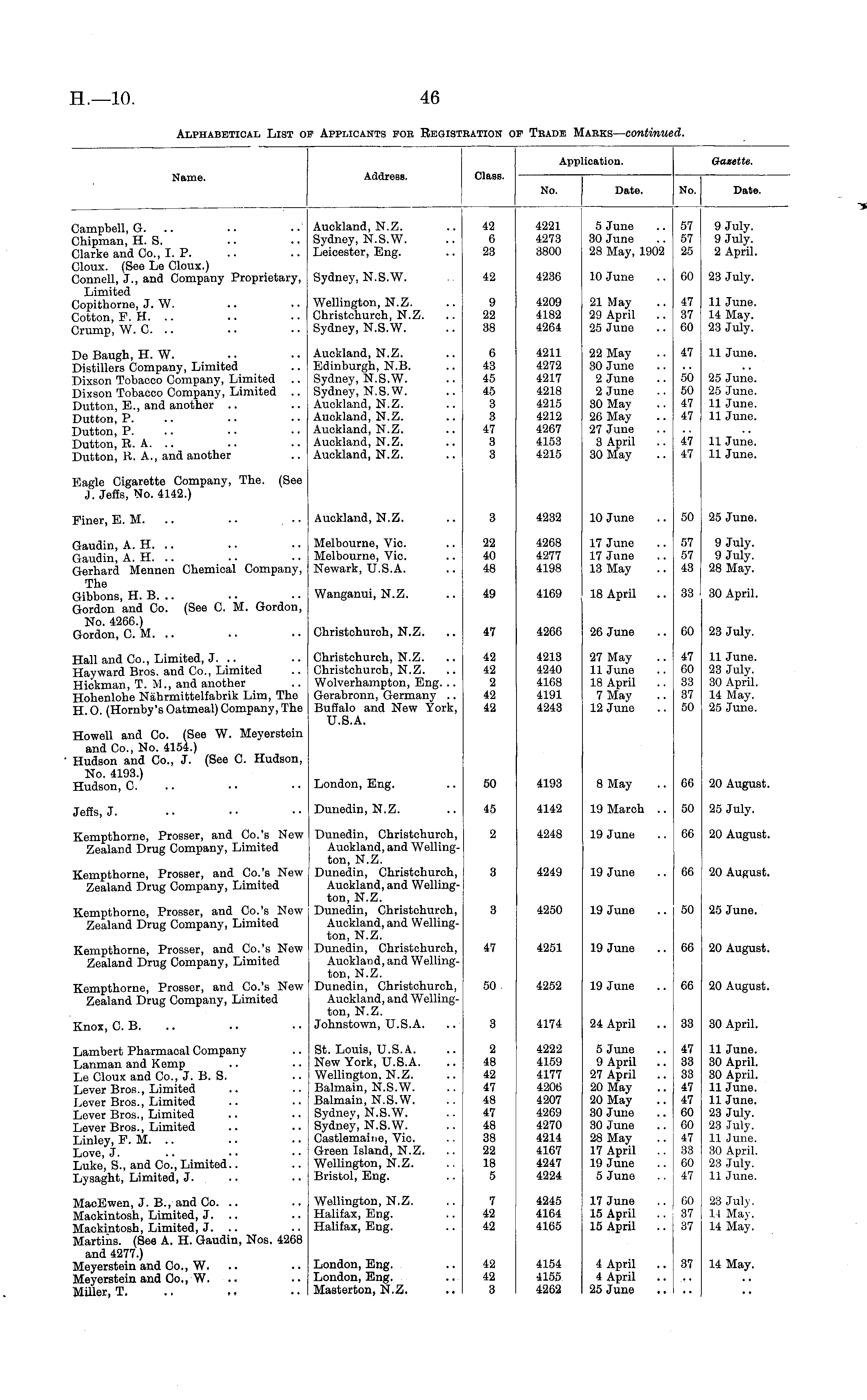 Application. Gazette. Name. Address. Class. No. Date. No. Date. Campbell, G. Chipman, H. S. Clarke and Co., LP. Cloux. (See Le Cloux.) Connell, J., and Company Proprietary, Limited Copithorne, J. W. Cotton, F. H. .. Crump, W. C. .. Auckland, N.Z. Sydney, N.S.W. Leicester, Eng. 42 6 23 4221 4273 3800 5 June 30 June 28 May, 1902 57 57 25 9 July. 9 July. 2 April. Sydney, N.S.W. 42 4236 10 June 60 23 July. Wellington, N.Z. Christchurch, N.Z. Sydney, N.S.W. 9 22 38 4209 4182 4264 21 May 29 April 25 June 47 37 (SO 11 June. 14 May. 23 July. De Baugh, H. W. Distillers Company, Limited Dixson Tobacco Company, Limited Dixson Tobacco Company, Limited .. Dutton, E., and another .. Dutton, P. Dutton, P. Dutton, R. A. .. Dutton, R. A., and another Auckland, N.Z. Edinburgh, N.B. Sydney, N.S.W. Sydney, N.S.W. Auckland, N.Z. Auckland, N.Z. Auckland, N.Z. Auckland, N.Z. Auckland, N.Z. 6 43 45 45 3 3 17 3 3 4211 4272 4217 4218 4215 4212 4267 4153 4215 22 May 30 June 2 June 2 June 30 May 26 May 27 June 3 April 30 May 47 GO 50 47 47 11 June. 25 June. 25 June. 11 June. 11 June. 47 47 11 June. 11 June. Eagle Cigarette Company, The. (See J.Jeffs, No. 4142.) Auckland, N.Z. 4232 10 June 25 June. Finer, E. M. .. .. ... 3 50 Gaudin, A. H. .. Gaudin, A. H. .. Gerhard Mennen Chemical Company, The Gibbons, H. B. .. Gordon and Co. (See C. M. Gordon, No. 4266.) Gordon, CM... Melbourne, Vic Melbourne, Vic. Newark, U.S.A. 22 40 48 4268 4277 4198 17 June 17 June 13 May 57 57 43 9 July. 9 July. 28 May. Wanganui, N.Z. 49 4169 18 April 33 30 April. Christchurch, N.Z. 47 4266 26 June 60 23 July. Hall and Co., Limited, J. .. Hayward Bros, and Co., Limited Hickman, T. M., and another Hohenlohe Niihrmittelfabrik Lim, The H. O. (Hornby's Oatmeal) Company, The Christchurch, N.Z. Christchurch, N.Z. Wolverhampton, Eng. .. Gerabronn, Germany .. Buffalo and New York, U.S.A. 42 42 2 42 42 4213 4240 4168 4191 4243 27 May 11 June 18 April 7 May 12 June 47 60 83 37 50 11 June. 23 July. 30 April. 14 May. 25 June. Howell and Co. (See W. Meyerstein and Co., No. 4154.) Hudson and Co., J. (See C. Hudson, No. 4193.) Hudson, C. London, Eng. 8 May 20 August. 50 4193 66 Jeffs, J. Dunedin, N.Z. 45 4142 19 March .. GO 25 July. Kempthorne, Prosser, and Co.'s New Zealand Drug Company, Limited Dunedin, Christchurch, Auckland, and Wellington, N.Z. Dunedin, Christchurch, Auckland, and Wellington, N.Z. Dunedin, Christchurch, Auckland, and Wellington, N.Z. Dunedin, Christchurch, Auckland, and Wellington, N.Z. Dunedin, Christchurch, Auckland, and Wellington, N.Z. Johnstown, U.S.A. 2 4248 19 June 66 20 August. Kempthorne, Prosser, and Co.'s New Zealand Drug Company, Limited 3 4249 19 June GO 20 August. Kempthorne, Prosser, and Co.'s New Zealand Drug Company, Limited 3 4250 19 June GO 25 June. Kempthorne, Prosser, and Co.'s New Zealand Drug Company, Limited 47 4251 19 June 6G 20 August. Kempthorne, Prosser, and Co.'s New Zealand Drug Company, Limited 50 4252 19 June 06 20 August. Knox, C. B. 3 4174 24 April 33 30 April. Lambert Pharmacal Company Lanman and Kemp Le Cloux and Co., J. B. S. Lever Bros., Limited Lever Bros., Limited Lever Bros., Limited Lever Bros., Limited Linley, F. M. .. Love, J. Luke, S., and Co., Limited.. Lysaght, Limited, J. St. Louis, U.S.A. New York, U.S.A. Wellington, N.Z. Balmain, N.S.W. Balmain, N.S.W. Sydnev, N.S.W. Sydney, N.S.W. Castlemaine, Vic. Green Island, N.Z. Wellington, N.Z. Bristol, Eng. 2 48 42 47 48 47 48 38 22 18 5 4222 4159 4177 4206 4207 4269 4270 4214 4167 4247 4224 5 June 9 April 27 April 20 May 20 May 30 June 30 June 28 May 17 April 19 June 5 June 47 33 33 47 47 GO GO 47 38 60 47 11 June. 30 April. 30 April. 11 June. 11 June. 23 July. 23 July. 11 June. 30 April. 23 July. 11 June. MacEwen, J. B., and Co. .. Mackintosh, Limited, J. Mackintosh, Limited, J. .. Martins. (See A. H. Gaudin, Nos. 4268 and 4277.) Meyerstein and Co., W. .. Meyerstein and Co., W. Miller, T. Wellington, N.Z. Halifax, Eng. Halifax, Eng. 7 42 42 4245 4164 4165 17 June 15 April 15 April 60 37 37 23 July. 14 May. 14 May. London, Eng. London, Eng. Masterton, N.Z. 42 42 3 4154 4155 4262 4 April 4 April 25 June 37 14 May.