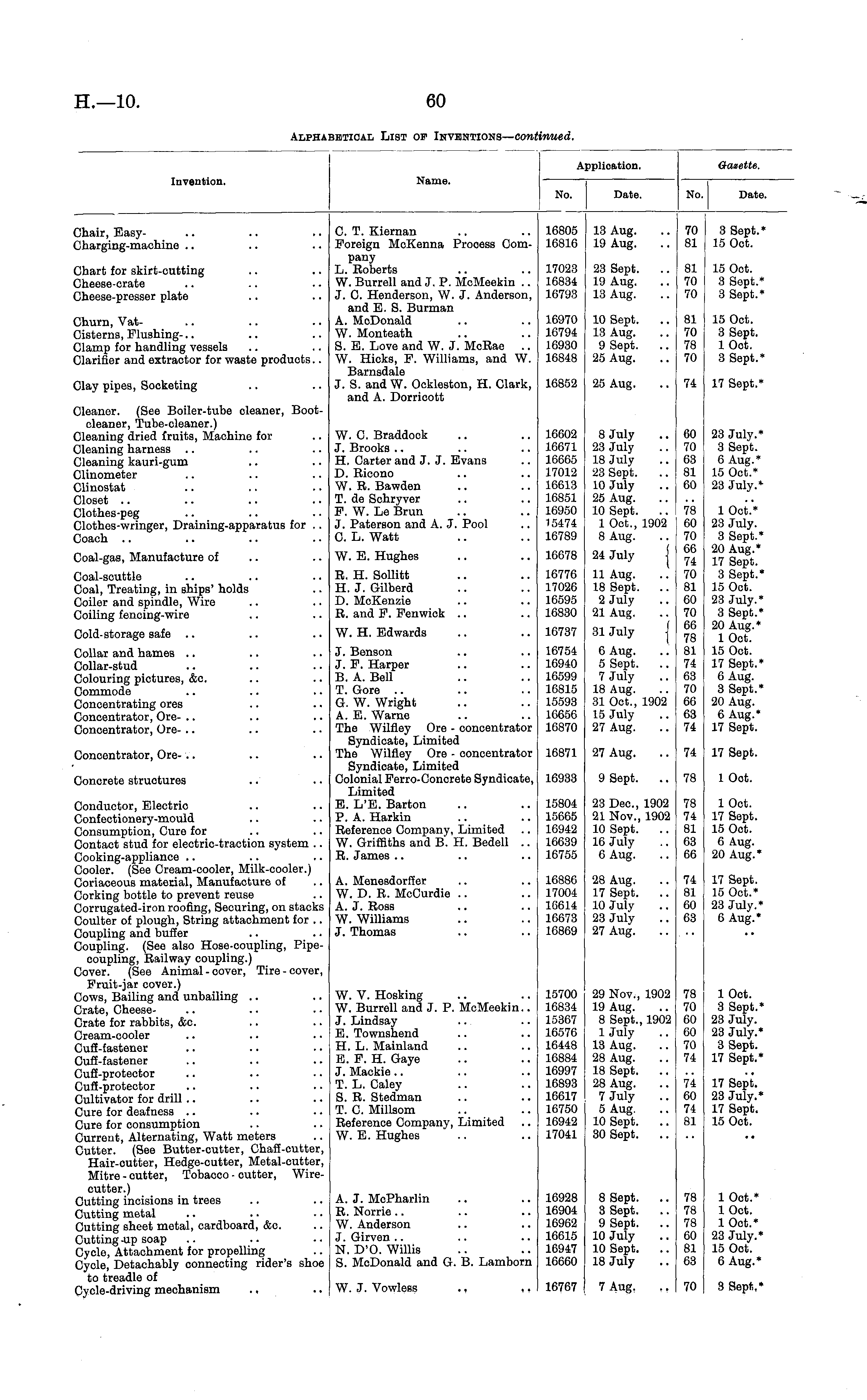 Invention. Name. Appl No. Application. lication. Date. Gazette. No. Date. Chair, Easy-Charging-machine C. T. Kiernan Foreign McKenna Process Company L. Roberts W. Burrell and J. P. McMeekin .. J. C. Henderson, W. J. Anderson, and E. S. Burman A. McDonald W. Monteath S. E. Love and W. J. McRae .. W. Hicks, F. Williams, and W. Barnsdale J. S. and W. Ockleston, H. Clark, and A. Dorricott 16805 16816 13 Aug. 19 Aug. 70 81 3 Sept.* 15 Oct. Chart for skirt-cutting Cheese-crate Cheese-presser plate 17023 16834 16793 23 Sept. 19 Aug. 13 Aug. 81 70 70 15 Oot. 8 Sept.* 8 Sept.* Churn, VatCisterns, Flushing-.. Clamp for handling vessels Clarifier and extractor for waste products.. 16970 16794 16930 16848 10 Sept. 13 Aug. 9 Sept. 25 Aug. 81 70 78 70 15 Oct. 3 Sept. 1 Oct. 3 Sept.* Clay pipes, Socketing 16852 25 Aug. 74 17 Sept.* Cleaner. (See Boiler-tube cleaner, Bootcleaner, Tube-cleaner.) Cleaning dried fruits, Machine for Cleaning harness Cleaning kauri-gum Clinometer Clinostat Closet Clothes-peg Clothes-wringer, Draining-apparatus for .. Coach W. C. Braddock J. Brooks H. Carter and J. J. Evans D. Ricono W. R. Bawden T. de Schryver F. W. Le Brun J. Paterson and A. J. Pool C. L. Watt 16602 16671 16665 17012 16613 16851 16950 15474 16789 8 July 23 July 18 July 23 Sept. 10 July 25 Aug. 10 Sept. .. 1 Oct., 1902 8 Aug. 24 July | (»0 70 68 81 60 23 July.* 3 Sept. 6 Aug.* 15 Oct.* 23 July.* Coal-gas, Manufacture of Coal-scuttle Coal, Treating, in ships' holds Coiler and spindle, Wire Coiling fencing-wire W. E. Hughes R. H. Sollitt H. J. Gilberd D. McKenzie R. and F. Fenwiek .. 16678 16776 17026 16595 16830 11 Aug. 18 Sept. .. 2 July 21 Aug. 31 July I 78 (SO 70 GO 74 70 81 (SO 70 GO 78 81 74 63 70 66 68 74 1 Oct.* 23 July. 3 Sept.* 20 Aug.* 17 Sept. 3 Sept.* 15 Oct. 23 July.* 3 Sept.* 20 Aug.* 1 Oct. 15 Oct. 17 Sept.* 6 Aug. 3 Sept.* 20 Aug. 6 Aug.* 17 Sept. Cold-storage safe Collar and hames Collar-stud Colouring pictures, &c Commode Concentrating ores Concentrator, OreConcentrator, OreW. H. Edwards 16737 J. Benson J. F. Harper B. A. Bell T. Gore G. W. Wright A. E. Warne The Wilfley Ore - concentrator Syndicate, Limited The Wilfley Ore - concentrator Syndicate, Limited Colonial Ferro-Concrete Syndicate, Limited E. L'E. Barton P. A. Harkin Reference Company, Limited W. Griffiths and B. H. Bedell .. R. James 16754 16940 10599 16815 15593 16656 16870 6 Aug. 5 Sept. 7 July 18 Aug. 31 Oct., 1902 15 July 27 Aug. Concentrator, Ore16871 27 Aug. 74 17 Sept. Concrete structures 16933 9 Sept. 78 1 Oct. Conductor, Electrio Confectionery-mould Consumption, Cure for Contact stud for electric-traction system .. Cooking-appliance Cooler. (See Cream-cooler, Milk-cooler.) Coriaceous material, Manufacture of Corking bottle to prevent reuse Corrugated-iron roofing, Securing, on stacks Coulter of plough, String attachment for .. Coupling and buffer Coupling. (See also Hose-coupling, Pipecoupling, Railway coupling.) Cover. (See Animal - cover, Tire - cover, Fruit-jar cover.) Cows, Bailing and unbailing Crate, CheeseCrate for rabbits, &c. Cream-cooler Cuff-fastener Cuff-fastener Cuff-protector Cuff-protector Cultivator for drill Cure for deafness Cure for consumption Current, Alternating, Watt meters Cutter. (See Butter-cutter, Chaff-cutter, Hair-outter, Hedge-cutter, Metal-cutter, Mitre - cutter, Tobacco - cutter, Wirecutter.) Cutting incisions in trees Cutting metal Cutting sheet metal, cardboard, &c Cutting -up soap Cycle, Attachment for propelling Cycle, Detachably connecting rider's shoe to treadle of Cycle-driving mechanism 15804 15665 16942 16639 16755 23 Dec, 1902 21 Nov., 1902 10 Sept. 16 July 6 Aug. 78 74 81 (S3 GO lOct. 17 Sept. 15 Oct. 6 Aug. 20 Aug.* A. Menesdorffer W. D. R. McCurdie A. J. Ross W. Williams J. Thomas 16886 17004 16614 16673 16869 28 Aug. 17 Sept. 10 July 23 July 27 Aug. 74 81 (SO 68 17 Sept. 15 Oct.* 23 July.* 6 Aug.* W. V. Hosking W. Burrell and J. P. McMeekin.. J. Lindsay E. Townshend H. L. Mainland E. F. H. Gaye J. Mackie.. T. L. Caley S. R. Stedman T. C. Millsom Reference Company, Limited W.E.Hughes 15700 16834 15367 16576 16448 16884 16997 16893 16617 16750 16942 17041 29 Nov., 1902 19 Aug. 8 Sept., 1902 1 July 13 Aug. 28 Aug. 18 Sept. 28 Aug. 7 July 5 Aug. 10 Sept. 30 Sept. .. 78 70 00 (SO 70 74 1 Oot. 3 Sept.* 23 July. 23 July.* 3 Sept. 17 Sept.* 74 60 71 81 17 Sept. 23 July.* 17 Sept. 15 Oct. A. J. McPharlin R. Norrie.. W. Anderson J. Girven .. N. D'O. Willis S. McDonald and G. B. Lamborn 16928 16904 16962 16615 16947 16660 8 Sept. .. 3 Sept. 9 Sept. .. 10 July 10 Sept. 18 July 78 78 78 (SO 81 68 1 Oct.* 1 Oct. 1 Oct.* 23 July.* 15 Oct. 6 Aug.* W. J. Vowless ., 16767 7 Aug, 70 3 Sept,*