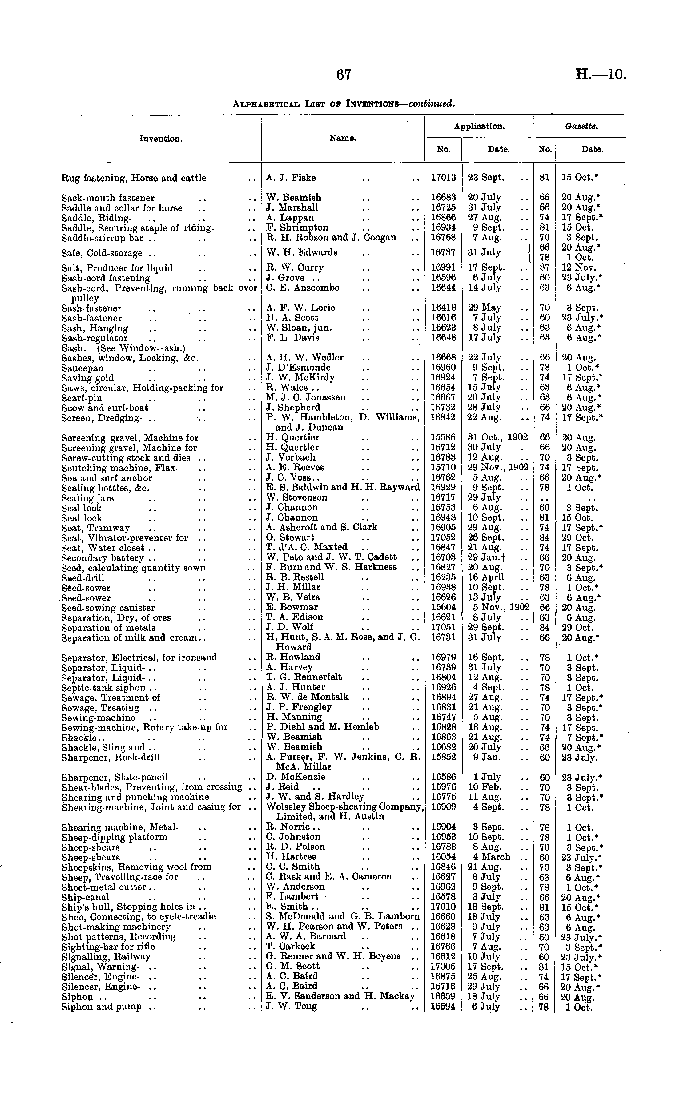 Application. Gazette. Invention. Name. No. Date. No. Date. Rug fastening, Horse and cattle A. J. Fiske 17013 23 Sept. 81 15 Oct.* Sack-mouth fastener Saddle and collar for horse Saddle, RidingSaddle, Securing staple of riding-Saddle-stirrup bar W. Beamish J. Marshall A. Lappan F. Shrimpton R. H. Robson and J. Coogan 16683 16725 16866 16934 16768 20 July 31 July 27 Aug. 9 Sept. 7 Aug. 31 July 66 66 74 81 70 GG 78 87 (SO 68 20 Aug.* 20 Aug.* 17 Sept.* 15 Oct. 3 Sept. 20 Aug.* 1 Oct. 12 Nov. 23 July.* 6 Aug.* Safe, Cold-storage W. H. Edwards 16737 Salt, Producer for liquid Sash-cord fastening Sash-cord, Preventing, running back over pulley Sash-fastener .. Sash-fastener Sash, Hanging Sash-regulator Sash. (See Window-sash.) Sashes, window, Locking, &c Saucepan Saving gold Saws, circular, Holding-packing for Scarf-pin Scow and surf-boat Screen, Dredging- .. R. W. Curry J. Grove .. C. E. Anscombe 16991 16596 16644 17 Sept. .. 6 July 14 July A. F. W. Lorie H. A. Scott W. Sloan, jun. F. L. Davis 16418 16616 16623 16648 29 May 7 July 8 July 17 July 70 GO (S3 (S3 3 Sept. 23 July.* 6 Aug.* 6 Aug.* A. H. W. Wedler J. D'Esmonde J. W. MoKirdy R. Wales M. J. C. Jonassen J. Shepherd P. W. Hambleton, D. Williams, and J. Duncan H. Quertier H. Quertier J. Vorbach A. E. Reeves J.C. Voss.. E. S. Baldwin and H. H. Rayward W. Stevenson J. Channon J. Channon A. Ashcroft and S. Clark O. Stewart T. d'A. C. Maxted .. W. Peto and J. W. T. Cadett .. F. Burn and W. S. Harkness R. B. Restell J. H. Millar W. B. Veirs E. Bowmar T. A. Edison J. D. Wolf H. Hunt, S. A. M. Rose, and J. G. Howard R. Howland A. Harvey T. G. Rennerfelt A. J. Hunter R. W. de Montalk J. P. Frengley H. Manning P. Diehl and M. Hemleb W. Beamish W. Beamish A. Purser, F. W. Jenkins, C. R. McA. Millar D. McKenzie J. Reid J. W. and S. Hardley Wolseley Sheep-shearing Company, Limited, and H. Austin R. Norrie C. Johnston R. D. Poison H. Hartree C. C. Smith C. Rask and E. A. Cameron W. Anderson F. Lambert E. Smith .. S. McDonald and G. B. Lamborn W. H. Pearson and W. Peters .. A. W. A. Barnard T. Carkeek G. Renner and W. H. Boyens .. G. M. Scott A. C. Baird A. C. Baird E. V. Sanderson and H. Mackay J. W. Tong 16668 16960 16924 16654 16667 16732 16842 22 July 9 Sept. 7 Sept. .. 15 July 20 July 28 July 22 Aug. 66 78 74 68 63 06 74 20 Aug. 1 Oct.* 17 Sept.* 6 Aug.* 6 Aug.* 20 Aug.* 17 Sept.* Screening gravel. Machine for Screening gravel, Machine for Screw-cutting stock and dies Scutching machine, FlaxSea and surf anchor Sealing bottles, &c Sealing jars Seal lock Seal lock Seat, Tramway Seat, Vibrator-preventer for .. Seat, Water-closet Secondary battery Seed, calculating quantity sown Seed-drill Seed-sower Seed-sower Seed-sowing canister Separation, Dry, of ores Separation of metals Separation of milk and cream 15586 16712 16783 15710 16762 16929 16717 16753 16948 16905 17052 16847 16703 16827 16235 16938 16626 15604 16621 17051 16731 31 Oct., 1902 30 July 12 Aug. 29 Nov., 1902 5 Aug. 9 Sept. 29 July 6 Aug. 10 Sept. 29 Aug. 26 Sept. 21 Aug. 29 Jan.f .. 20 Aug. 16 April 10 Sept. 13 July 5 Nov., 1902 8 July 29 Sept. 31 July 66 GG 70 74 GG 78 20 Aug. 20 Aug. 3 Sept. 17 Sept. 20 Aug.* 1 Oct. GO 81 74 84 74 66 70 03 78 (S3 GG 63 84 66 3 Sept. 15 Oct. 17 Sept.* 29 Oct. 17 Sept. 20 Aug. 3 Sept.* 6 Aug. 1 Oct.* 6 Aug.* 20 Aug. 6 Aug. 29 Oct. 20 Aug.* Separator, Electrical, for ironsand Separator, LiquidSeparator, Liquid-Septic-tank siphon Sewage, Treatment of Sewage, Treating Sewing-machine Sewing-machine, Rotary take-up for Shackle Shackle, Sling and Sharpener, Rock-drill 16979 16739 16804 16926 16894 16831 16747 16828 16863 16682 15852 16 Sept. 31 July 12 Aug. 4 Sept. 27 Aug. 21 Aug. 5 Aug. 18 Aug. 21 Aug. 20 July 9 Jan. 78 70 70 78 74 70 70 74 74 66 (SO 1 Oct.* 3 Sept. 3 Sept. 1 Oct. 17 Sept.* 3 Sept.* 3 Sept. 17 Sept. 7 Sept.* 20 Aug.* 23 July. Sharpener, Slate-pencil Shear-blades, Preventing, from crossing .. Shearing and punching machine Shearing-machine, Joint and casing for .. 16586 15976 16775 16909 1 July 10 Feb. 11 Aug. 4 Sept. .. 60 70 70 78 23 July.* 3 Sept. 3 Sept.* lOct. Shearing machine, Metal-Sheep-dipping platform Sheep-shears Sheep-shears Sheepskins, Removing wool from Sheep, Travelling-race for Sheet-metal cutter Ship-canal Ship's hull, Stopping holes in .. Shoe, Connecting, to cycle-treadle Shot-making machinery Shot patterns, Recording Sighting-bar for rifle Signalling, Railway Signal, WarningSilencer, Engine- .. Silencer, EngineSiphon Siphon and pump 16904 16953 16788 16054 16846 16627 16962 16578 17010 16660 16628 16618 16766 16612 17005 16875 16716 16659 16594 3 Sept. 10 Sept. 8 Aug. 4 March .. 21 Aug. 8 July 9 Sept. 3 July 18 Sept. 18 July 9 July 7 July 7 Aug. 10 July 17 Sept. 25 Aug. 29 July 18 July 6 July 78 78 70 GO 70 68 78 GG 81 63 63 60 70 GO 81 74 GG 66 78 lOct. 1 Oct.* 3 Sept.* 23 July.* 3 Sept.* 6 Aug.* 1 Oct.* 20 Aug.* 15 Oct.* 6 Aug.* 6 Aug. 23 July.* 3 Sept.* 23 July.* 15 Oct.* 17 Sept.* 20 Aug.* 20 Aug. lOct.