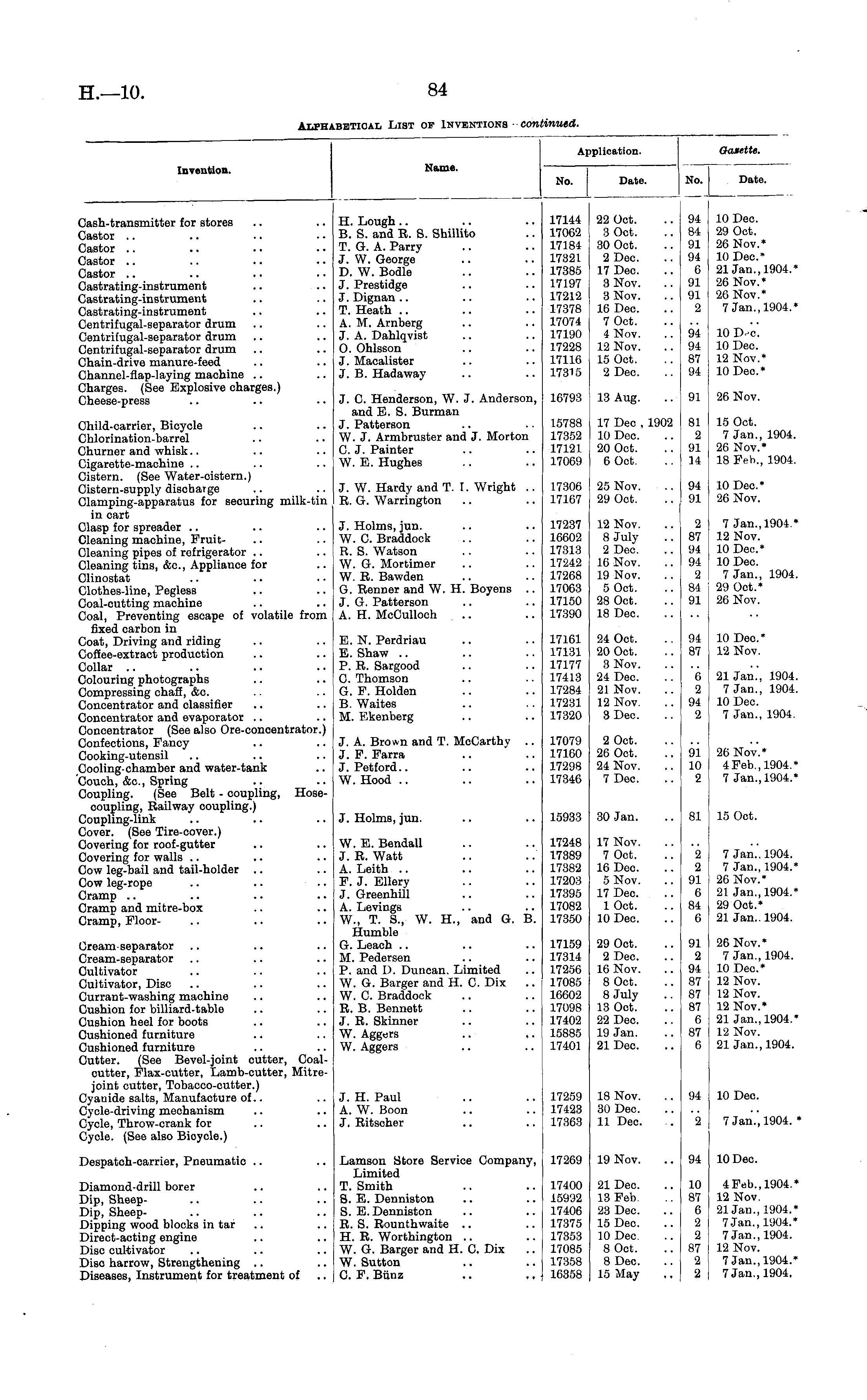 Application. Gazette. Invention. Name. No. Date. No. Date. Cash-transmitter for stores Castor Castor Castor Castor Castrating-instrument Castrating-instrument Castrating-instrument Centrifugal-separator drum Centrifugal-separator drum Centrifugal-separator drum Chain-drive manure-feed Channel-flap-laying machine Charges. (See Explosive charges.) Cheese-press H. Lough B. S. and R. S. Shillito T. G. A. Parry J. W. George D. W. Bodle J. Prestidge J. Dignan.. T. Heath A. M. Arnberg J. A. Dahlqvist 0. Ohlsson J. Macalister J. B. Hadaway 17144 17062 17184 17321 17385 17197 17212 17378 17074 17190 17228 17116 17315 22 Oct. 3 Oct. 30 Oct. 2 Dec. 17 Dec. 3 Nov. 3 Nov. 16 Dec. 7 Oct. 4 Nov. 12 Nov. 15 Oct. 2 Dec. 94 84 91 94 6 91 91 2 10 Dec. 29 Oct. 20 Nov.* 10 Dec* 21 Jan., 1904.* 26 Nov.* 26 Nov.* 7 Jan., 1904.* 94 94 87 94 10 D^c. 10 Dec. 12 Nov.* 10 Dec* J. C. Henderson, W. J. Anderson, and E. S. Burman J. Patterson W. J. Armbruster and J. Morton C. J. Painter W. E. Hughes 16793 13 Aug. 91 26 Nov. Child-carrier, Bicycle Chlorination-harrel Churner and whisk Cigarette-machine Cistern. (See Water-cistern.) Cistern-supply discharge Clamping-apparatus for securing milk-tin in cart Clasp for spreader Cleaning machine, FruitCleaning pipes of refrigerator Cleaning tins, &c, Appliance for Clinostat Clothes-line, Pegless Coal-eutting machine Coal, Preventing escape of volatile from fixed carbon in Coat, Driving and riding Coffee-extract production Collar .. Colouring photographs Compressing chaff, &c Concentrator and classifier Concentrator and evaporator Concentrator (See also Ore-concentrator.) Confections, Fancy Cooking-utensil Cooling-chamber and water-tank Couch, &c, Spring Coupling. (See Belt - coupling, Hosecoupling, Railway coupling.) Coupling-link Cover. (See Tire-cover.) Covering for roof-gutter Covering for walls Cow leg-bail and tail-holder Cow leg-rope Cramp Cramp and mitre-box Cramp, Floor15788 17352 17121 17069 17 Dec , 1902 10 Dec. 20 Oct. 6 Oct. 81 2 91 14 15 Oct. 7 Jan., 1904. 26 Nov.* 18 Feb., 1904. J. W. Hardy and T. I. Wright .. R. G. Warrington 17306 17167 25 Nov. 29 Oct. 94 91 10 Dec* 26 Nov. J. Holms, jun. W. C. Braddock R. S. Watson W. G. Mortimer W. R. Bawden G. Renner and W. H. Boyens .. J. G. Patterson A. H. McCulloch 17237 16602 17313 17242 17268 17063 17150 17390 12 Nov. 8 July 2 Dec. 16 Nov. 19 Nov. 5 Oct. 28 Oct. 18 Dec. 2 87 94 94 2 84 91 7 Jan., 1904.* 12 Nov. 10 Dec* 10 Dec. 7 Jan., 1904. 29 Oct.* 26 Nov. E. N. Perdriau E.Shaw P. R. Sargood C. Thomson G. F. Holden B. Waites M. Ekenberg 17161 17131 17177 17413 17284 17231 17320 24 Oct. 20 Oct. 3 Nov. 24 Dec. 21 Nov. 12 Nov. 3 Dec. 94 87 6 2 94 2 10 Dec* 12 Nov. 21 Jan., 1904. 7 Jan., 1904. 10 Dec. 7 Jan., 1904. J. A. Brown and T. McCarthy .. J. F. Farra J. Petford.. W. Hood 17079 17160 17298 17346 2 Oct. 26 Oct. 24 Nov. 7 Dec. 91 10 2 26 Nov.* 4 Feb., 1904.* 7 Jan., 1904.* J. Holms, jun. 15933 30 Jan. SI 15 Oct. W. E. Bendall J. R. Watt A. Leith F. J. Ellery J. Greenhill A. Levings W., T. S., W. H., and G. B. Humble G. Leach .. M. Pedersen P. and D. Duncan. Limited W. G. Barger and H. C. Dix W. C. Braddock R. B. Bennett J. R. Skinner W. Aggers W. Aggers 17248 17389 17382 17203 17395 17082 17350 17 Nov. 7 Oct. 16 Deo. 5 Nov. 17 Dec. 1 Oct. 10 Dec. 2 2 91 6 84 6 7 Jan.. 1904. 7 Jan., 1904.* 20 Nov.* 21 Jan., 1904.* 29 Oct.* 21 Jan.. 1904. Cream-separator Cream-separator Cultivator Cultivator, Disc Currant-washing machine Cushion for billiard-table Cushion heel for boots Cushioned furniture Cushioned furniture Cutter. (See Bevel-joint cutter, Coalcutter, Flax-cutter, Lamb-cutter, Mitrejoint cutter, Tobacco-cutter.) Cyanide salts, Manufacture of.. Cycle-driving mechanism Cycle, Throw-crank for Cycle. (See also Bicycle.) 17159 17314 17256 17085 16602 17098 17402 15885 17401 29 Oct. 2 Dec. 16 Nov. 8 Oct. 8 July 13 Oct. 22 Dec. 19 Jan. 21 Dec. 91 2 94 87 87 87 (S 87 6 26 Nov.* 7 Jan., 1904. 10 Dec* 12 Nov. 12 Nov. 12 Nov.* 21 Jan., 1904.* 12 Nov. 21 Jan., 1904. J. H. Paul A. W. Boon J. Ritscher 17259 17423 17363 18 Nov. 30 Dec. 11 Dec. 94 10 Dec. 2 7 Jan., 1904. * Despatch-carrier, Pneumatic Lamson Store Service Company, Limited T. Smith S. E. Denniston S. E. Denniston R. S. Rounthwaite H. R. Worthington .. W. G. Barger and H. C. Dix W. Sutton C. F. Biinz 17269 19 Nov. 94 10 Dee. Diamond-drill borer Dip, SheepDip, SheepDipping wood blocks in tar Direct-acting engine Disc cultivator Disc harrow, Strengthening Diseases, Instrument for treatment of 17400 15992 17406 17375 17353 17085 17358 16358 21 Dec. 13 Feb. 23 Dec. 15 Dec. 10 Dec. 8 Oct. 8 Dec. 15 May 10 87 6 2 2 87 2 2 4 Feb., 1904.* 12 Nov. 21 Jan.,1904.* 7 Jan., 1904.* 7 Jan.,1904. 12 Nov. 7 Jan., 1904.* 7 Jan.,1904,